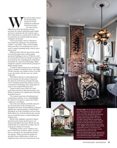 hen Sonny Sidhu started his house hunting journey, he wasn’t looking for traditional Victoria real estate. As a busy lawyer, Sidhu had to factor his lifestyle into the purchase. He wanted something small, simple and easy to maintain. He also needed a space that would showcase a sharp sense of style and be somewhere he could proudly host guests, colleagues and friends. “I had a great little condo in Chinatown, but people kept telling me, ‘You should buy a house,’ ” says Sidhu. “There were beautiful houses, but they were all going to be a lot of work. I wanted something small, with no strata and no yard.” Sidhu got lucky when he discovered a small, renovated heritage house nestled amidst apartment buildings in the city. While he could see its potential, he knew he needed an expert to turn the home into something that would fit his personality. In a quest for bold designs, Sidhu sought the expertise of Iván Meade, principal of Meade Design Group. “I could see improvements were needed, but I knew a designer would know best,” says Sidhu. “All the concepts were thanks to Iván. I was able to say: ‘Just make it the best you can,’ and he really did.” With Sidhu’s lifestyle in mind, Meade had two focal points for this project: bring back the character of the house, through restoring crown moulding and heritage features, and use contemporary furnishings and a bold palette to create a sexy, modern European style. “Sonny needed a space where he could come home and relax, chill and entertain,” says Meade. It needed to be sophisticated, with bold, masculine features. “We wanted a good mix of traditional and contemporary features, so we could highlight the character but make it a space that exudes confidence,” says Meade. One of the ways Meade and Sidhu achieved the elevated style was by investing in art throughout the home. From intriguing sculptural lighting and custom paintings, to hand-forged metalwork, art is the centrepiece in every room. With Sidhu’s love of books, Meade also created spaces around the house as natural sitting and reading areas. Moody, dark wallpapers, geometric shapes and select mid-century modern pieces are featured throughout the home. Meade says the small details are as important as larger ones in creating the ambience of a home. “Designing a home can be a makeover for how we feel about ourselves, inside, as well as how we feel about our environment outside,” says Meade. “When you feel the quality of a specially chosen whisky glass, or look at an original art piece that was created just for your