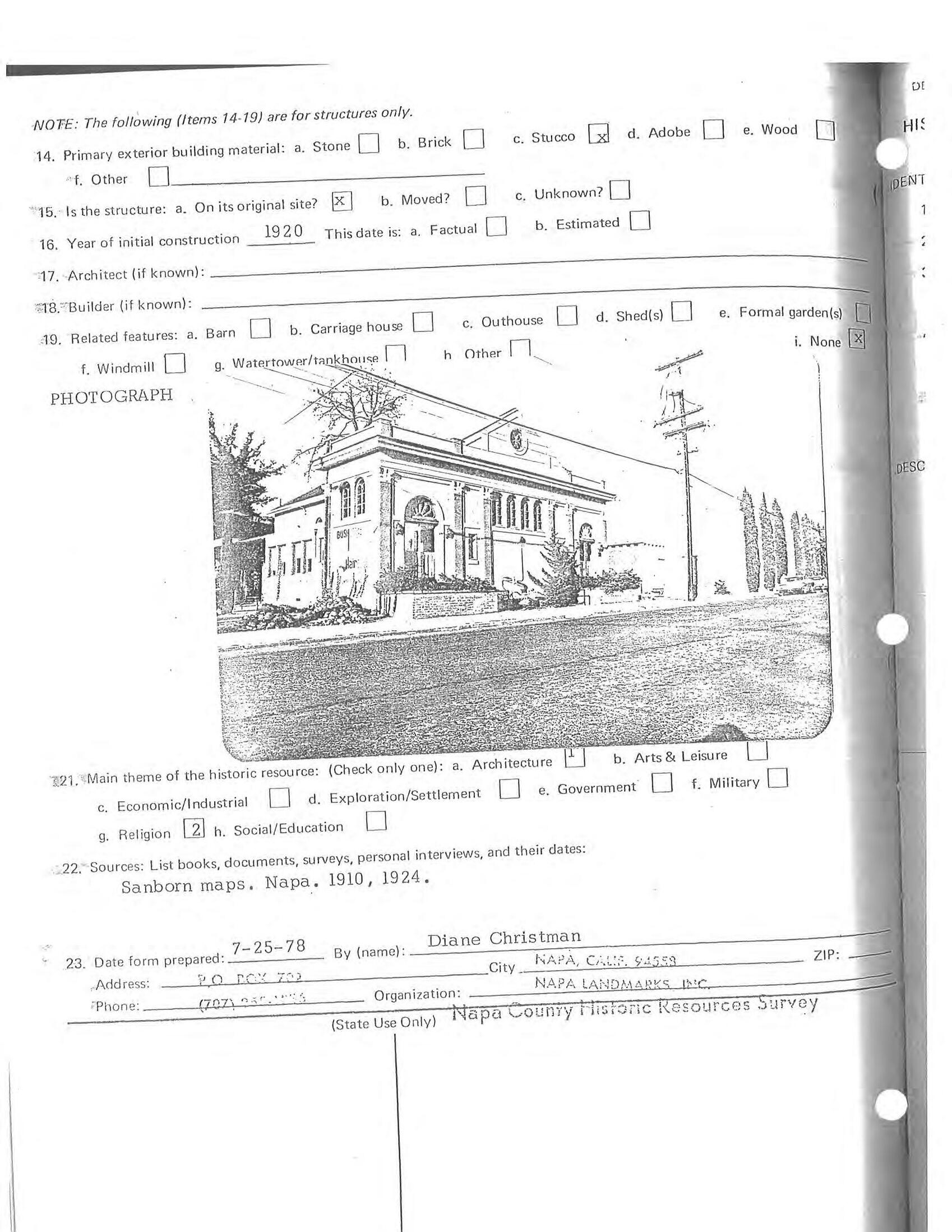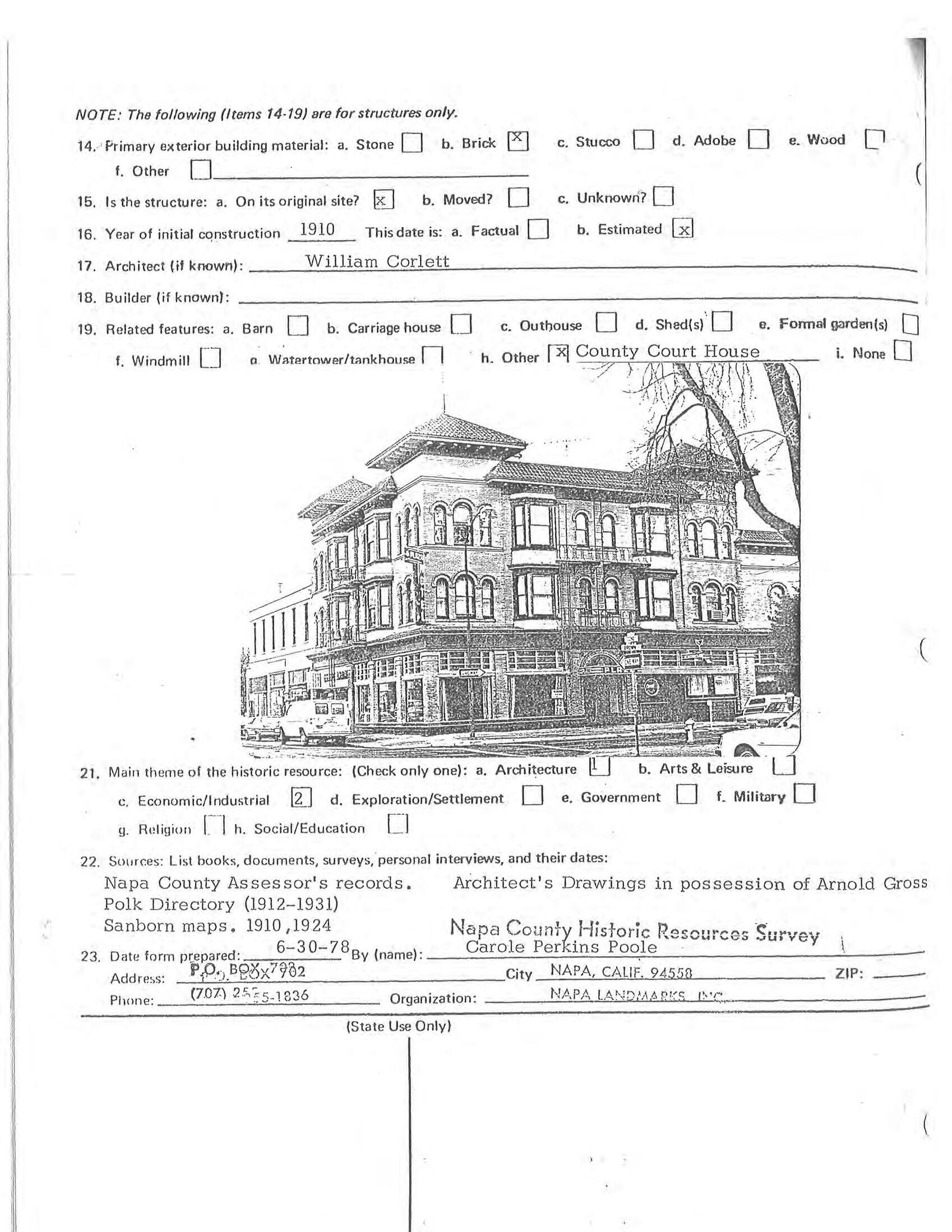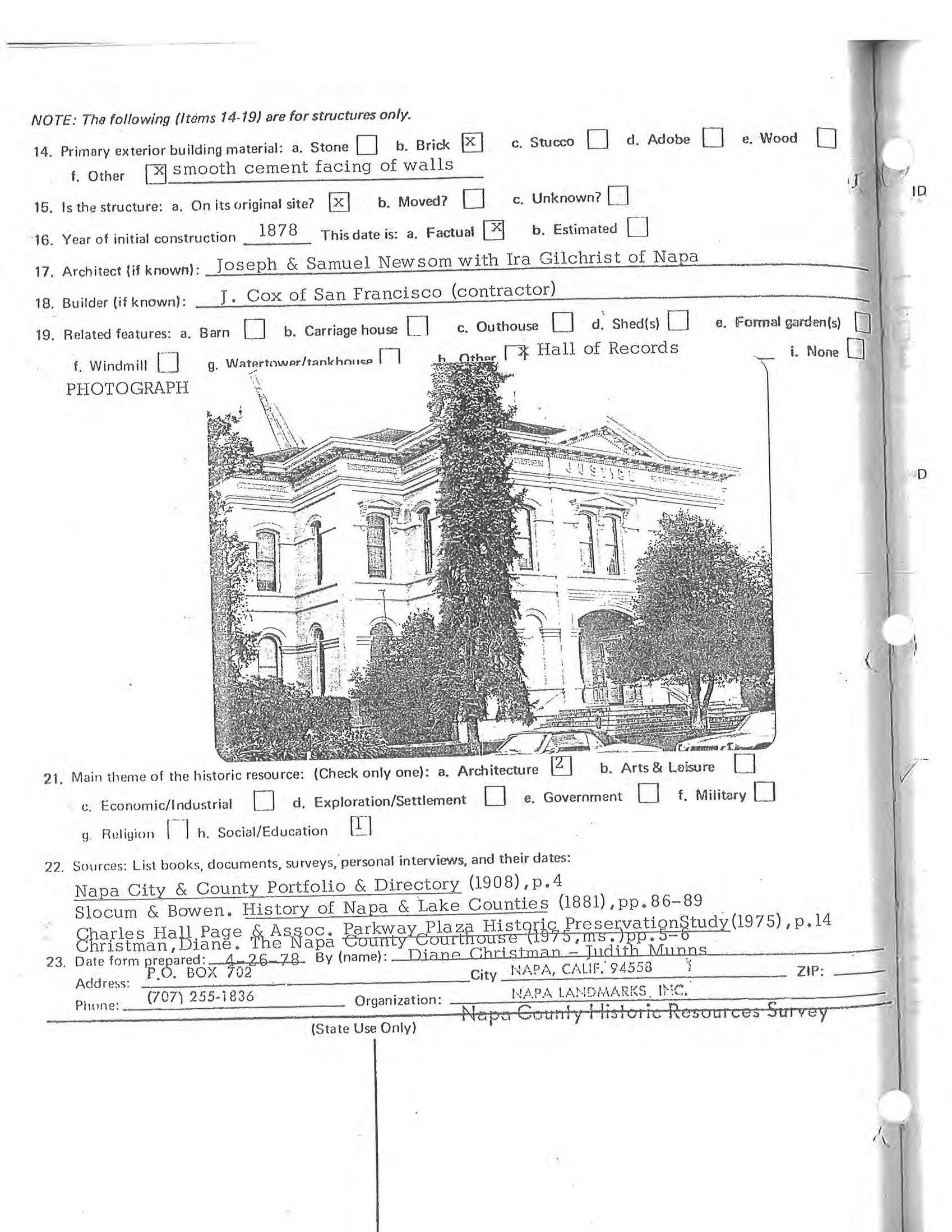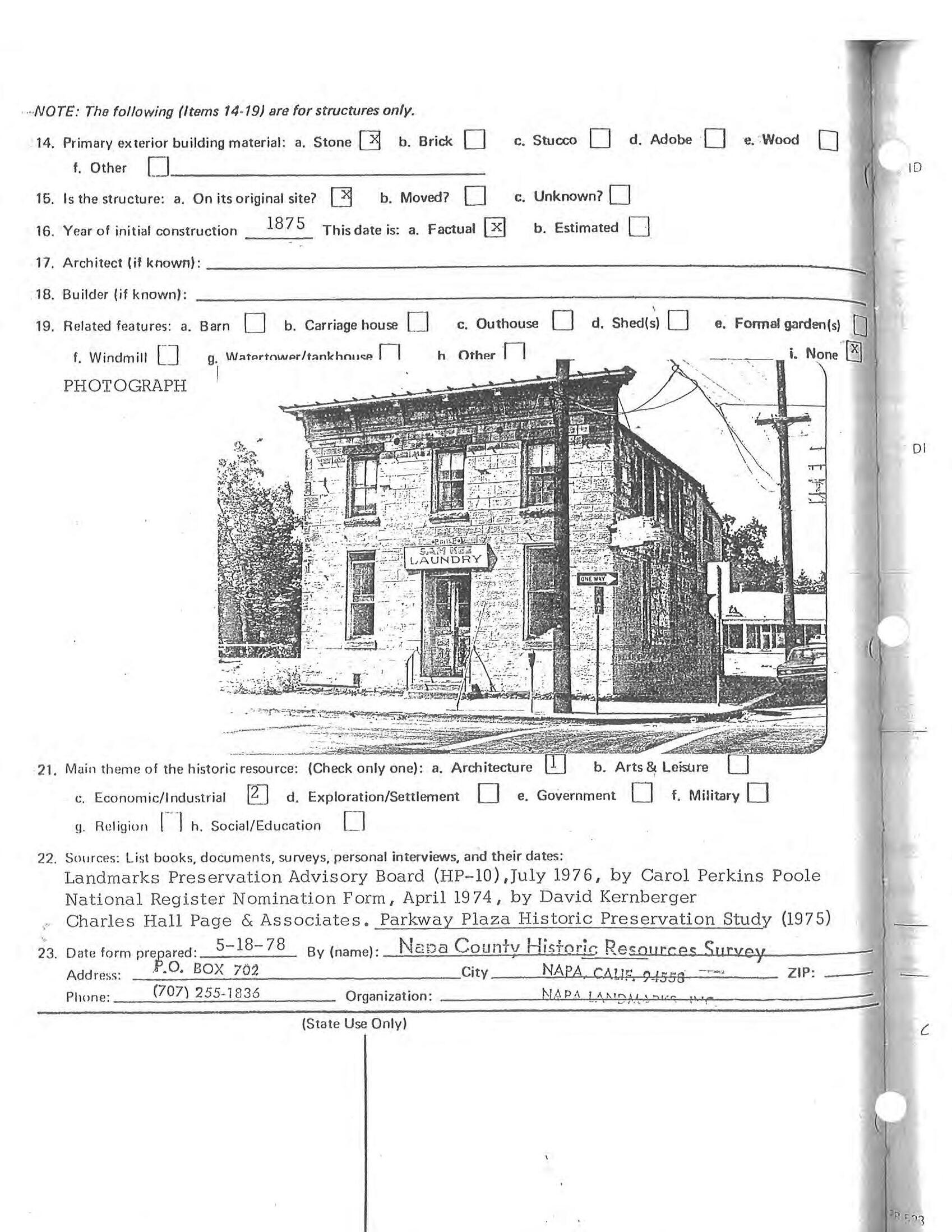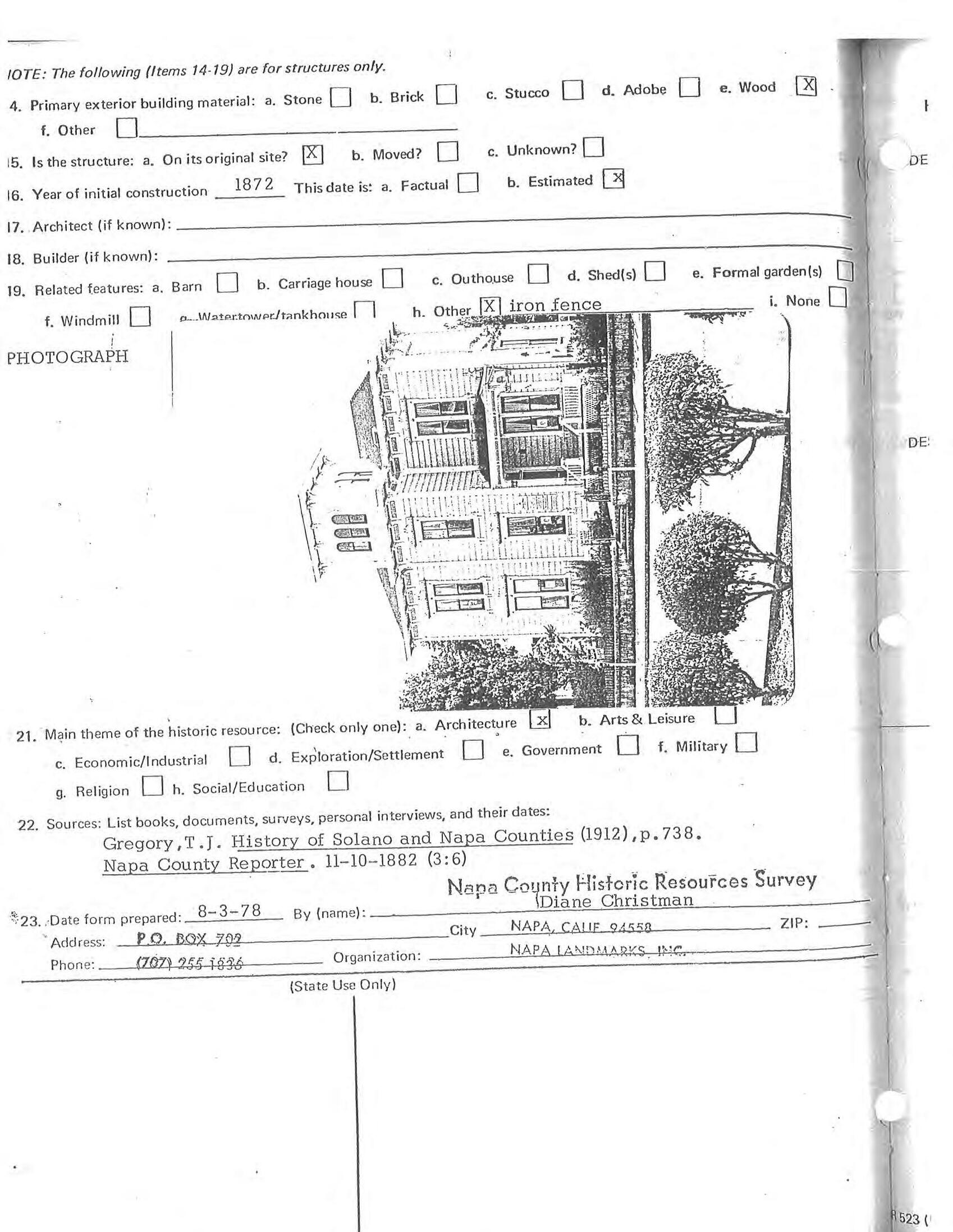 6 Napa Landmarks, Inc., “Final Report: Napa County Historic Resources Inventory” (Napa: unpublished report, 1 December 1978), in City of Napa Planning Department Archives, 1-11.