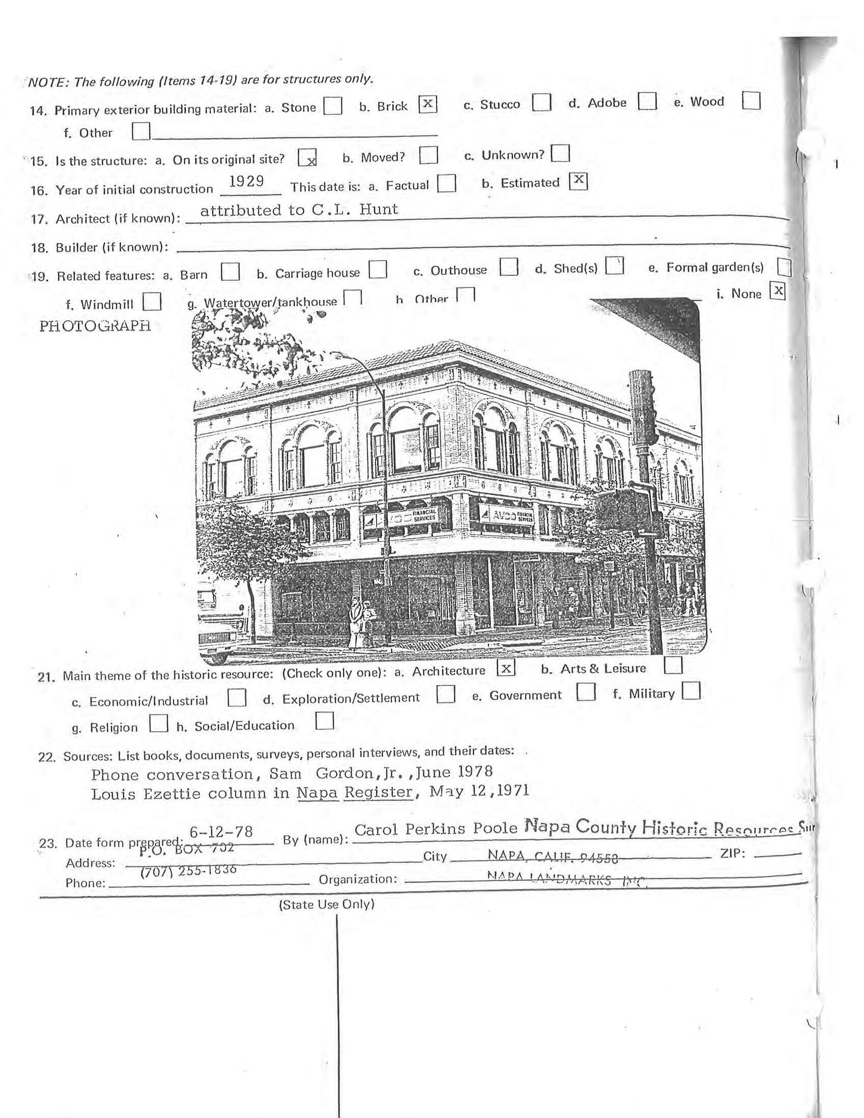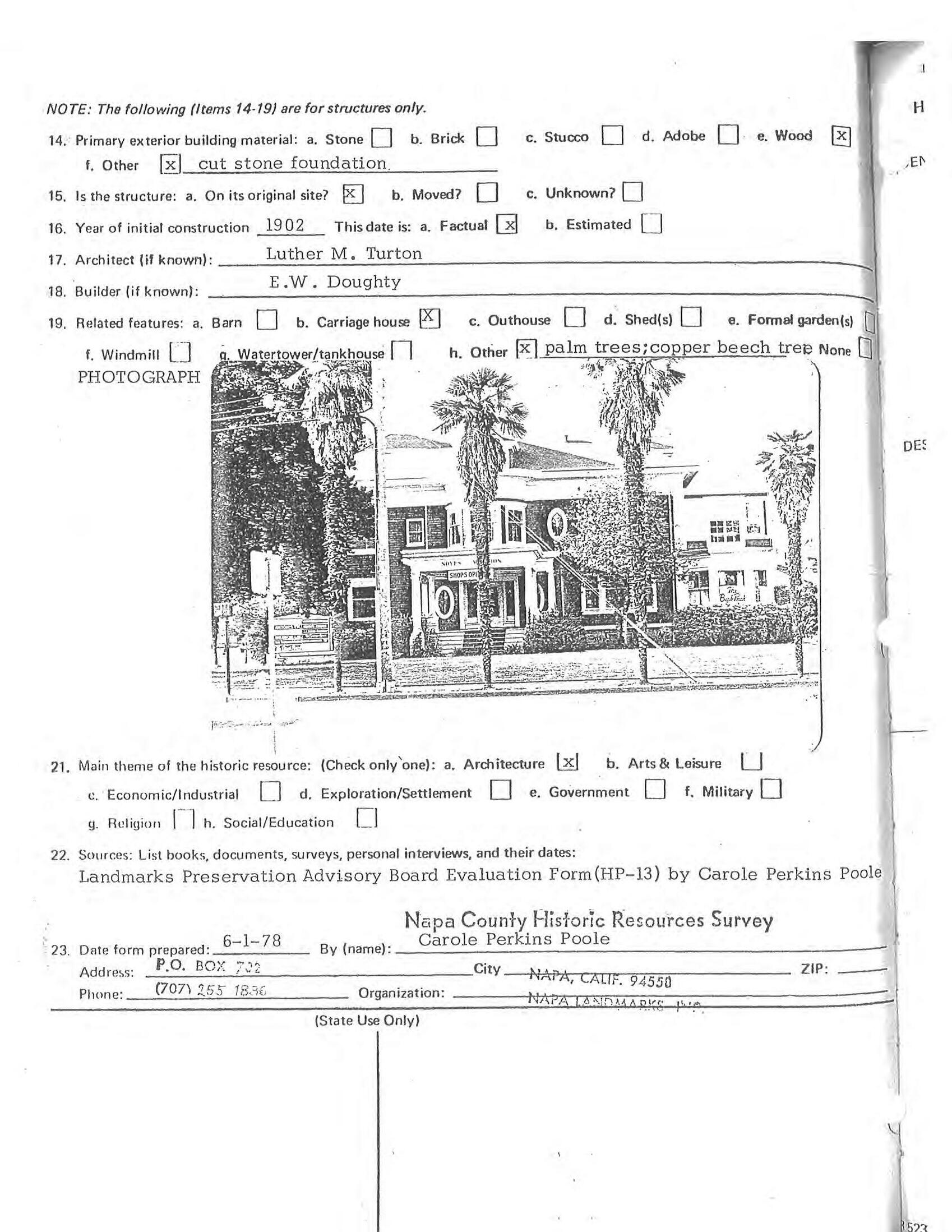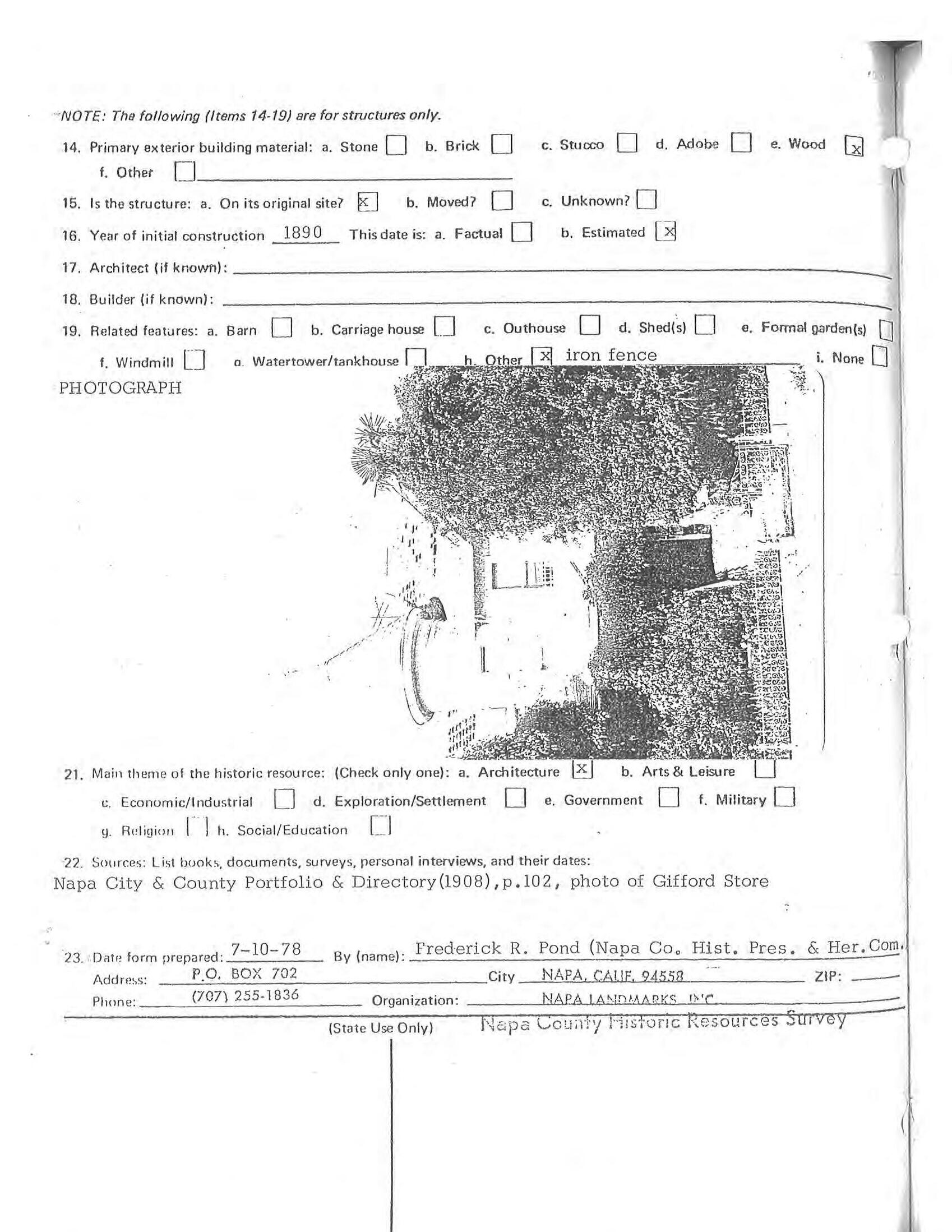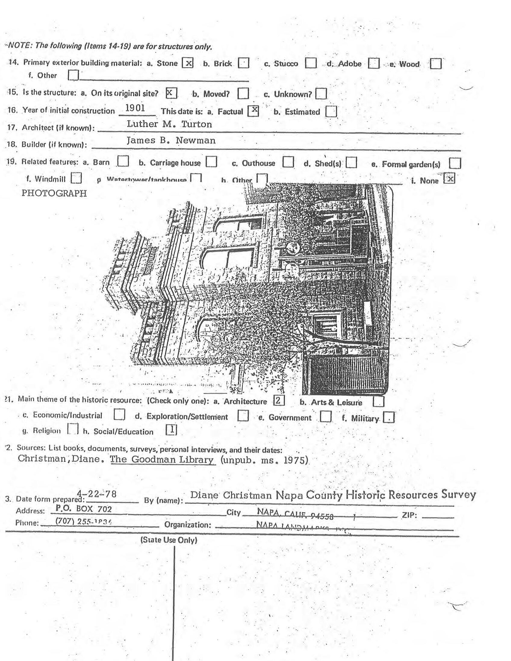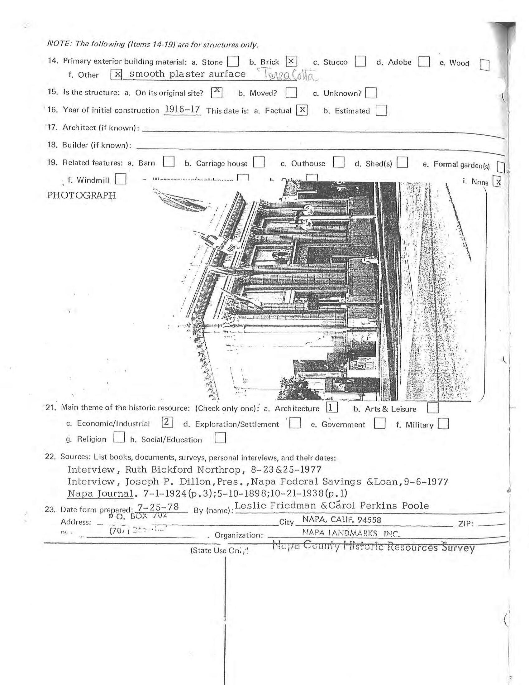6 Napa Landmarks, Inc., “Final Report: Napa County Historic Resources Inventory” (Napa: unpublished report, 1 December 1978), in City of Napa Planning Department Archives, 1-11.