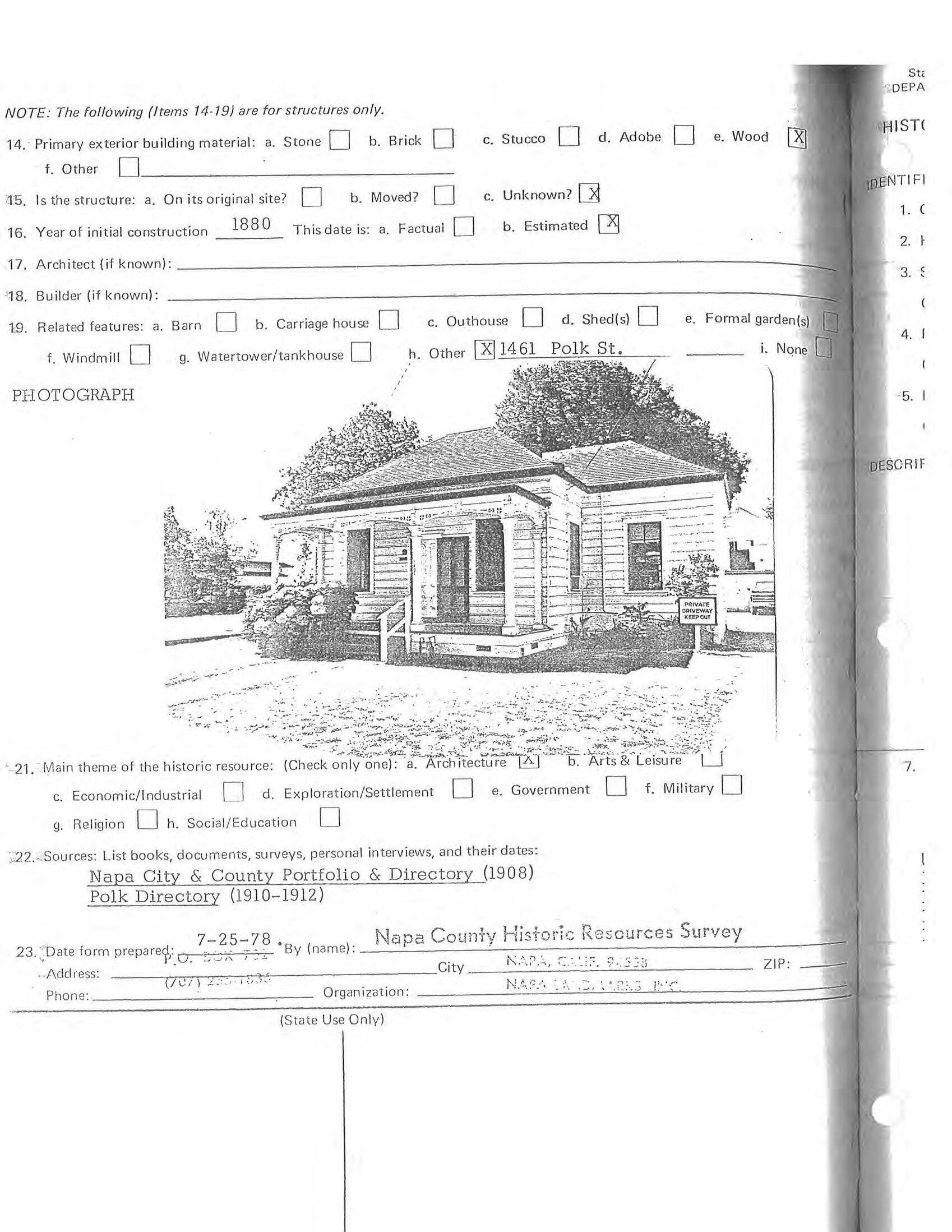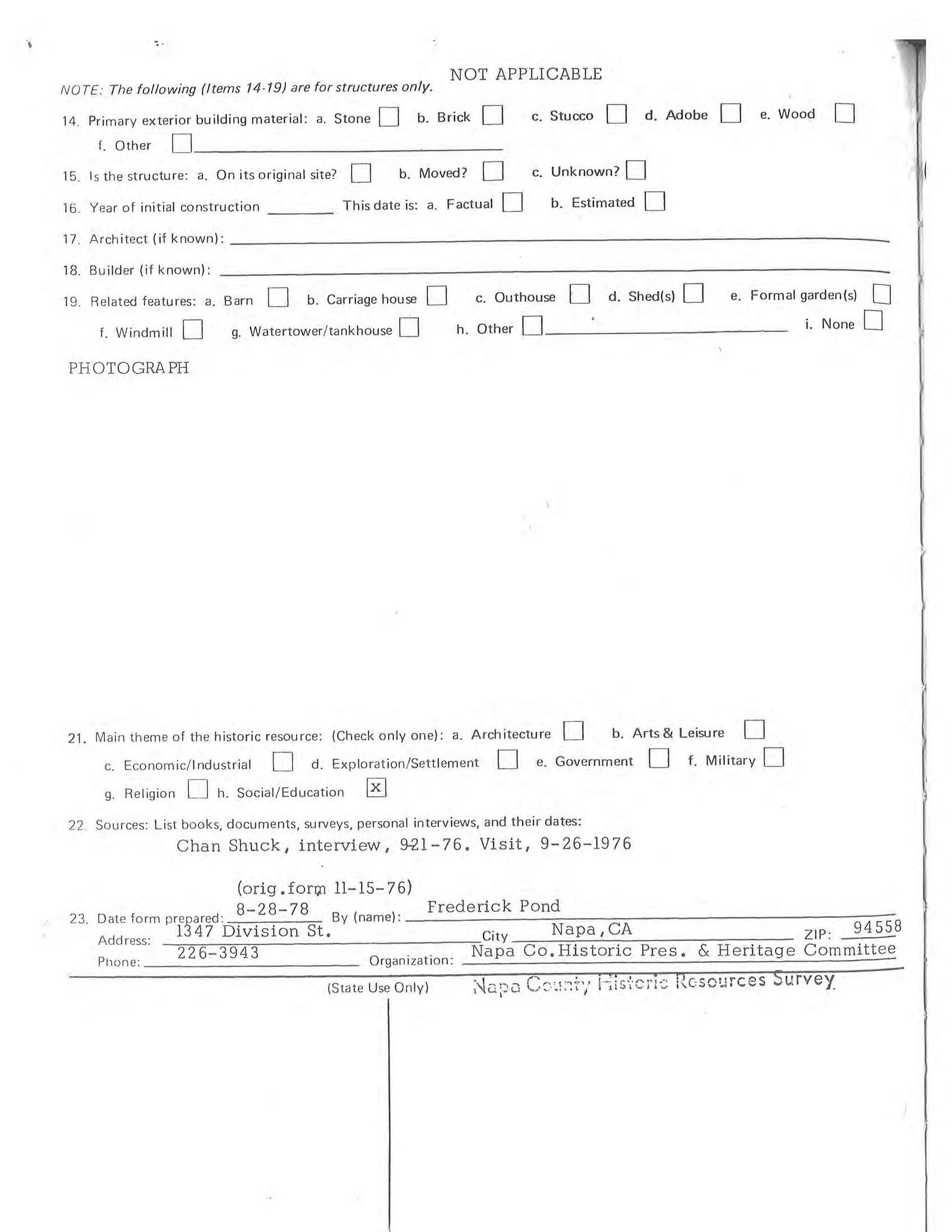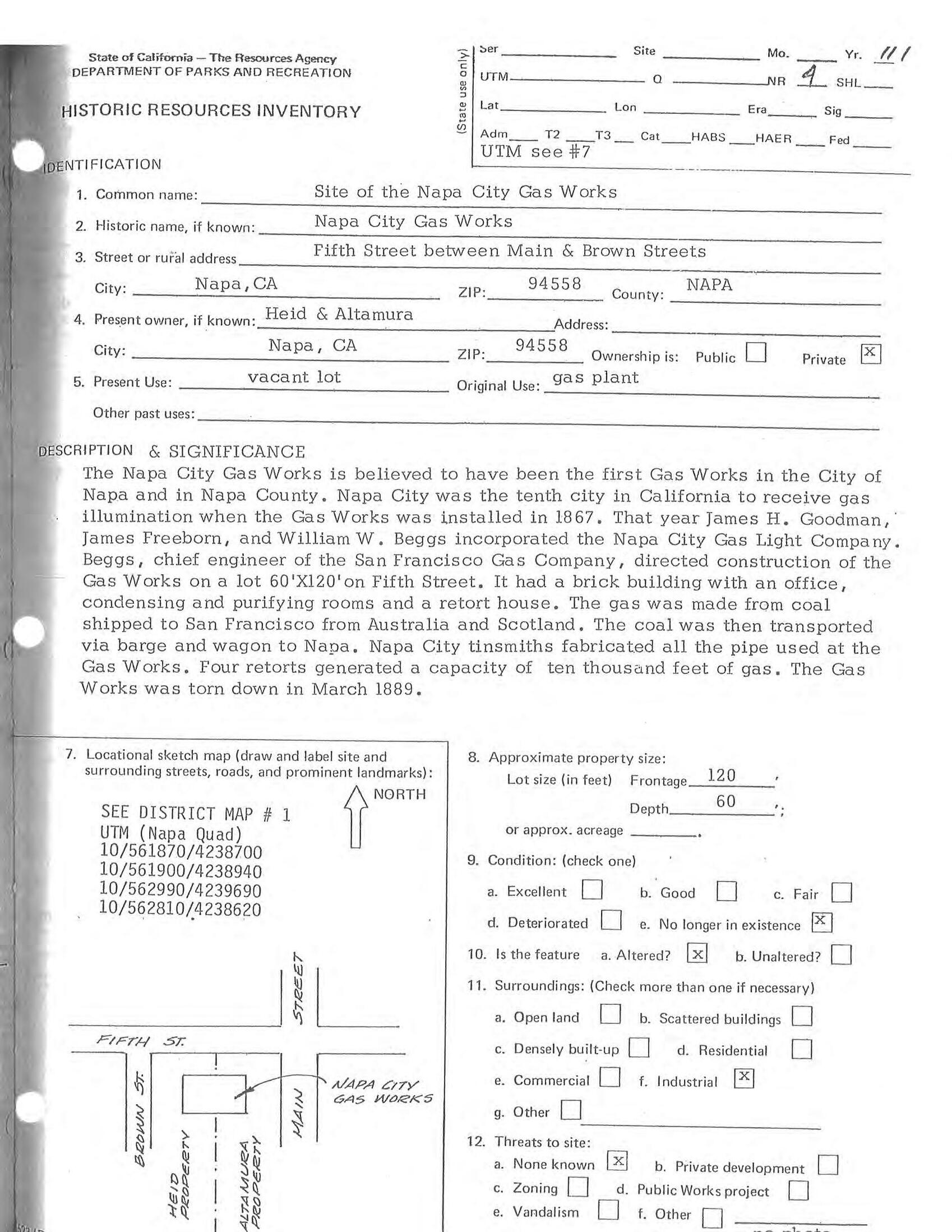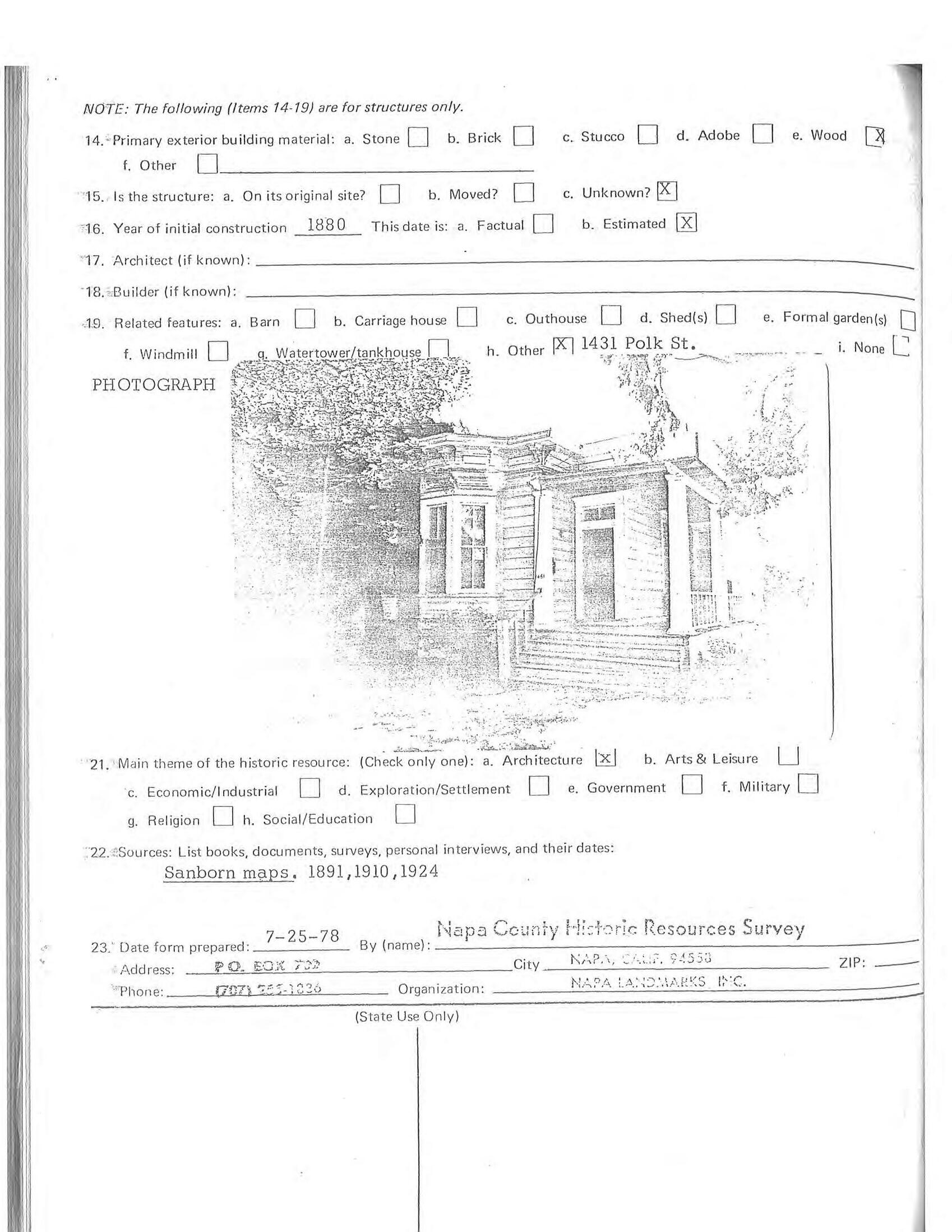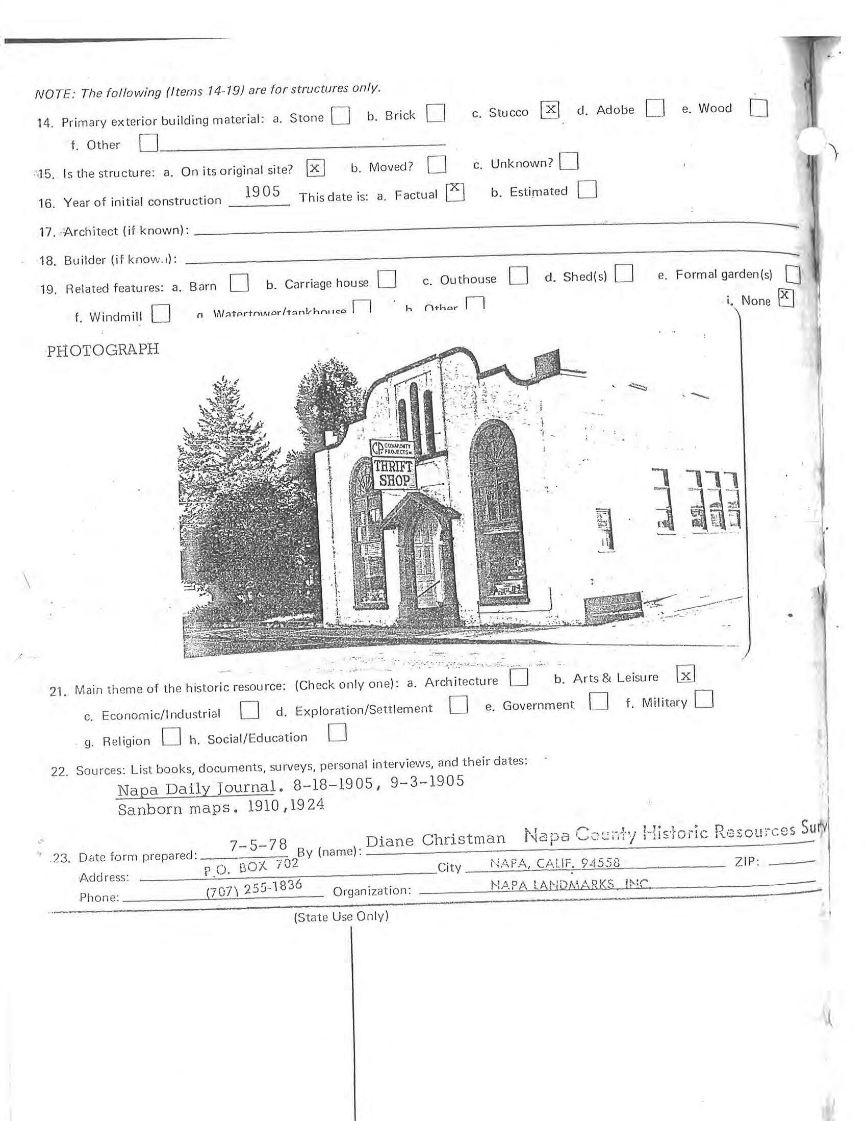 6 Napa Landmarks, Inc., “Final Report: Napa County Historic Resources Inventory” (Napa: unpublished report, 1 December 1978), in City of Napa Planning Department Archives, 1-11.