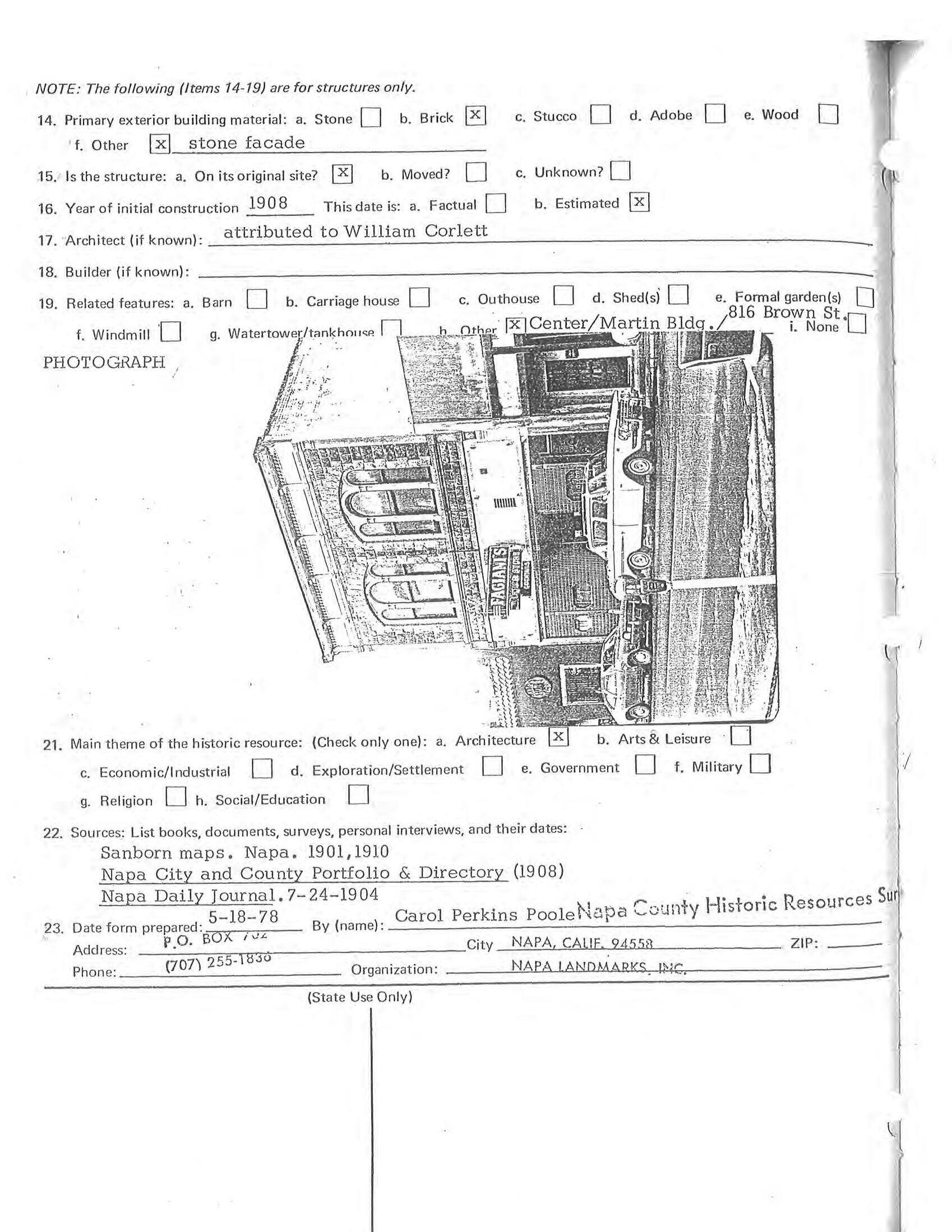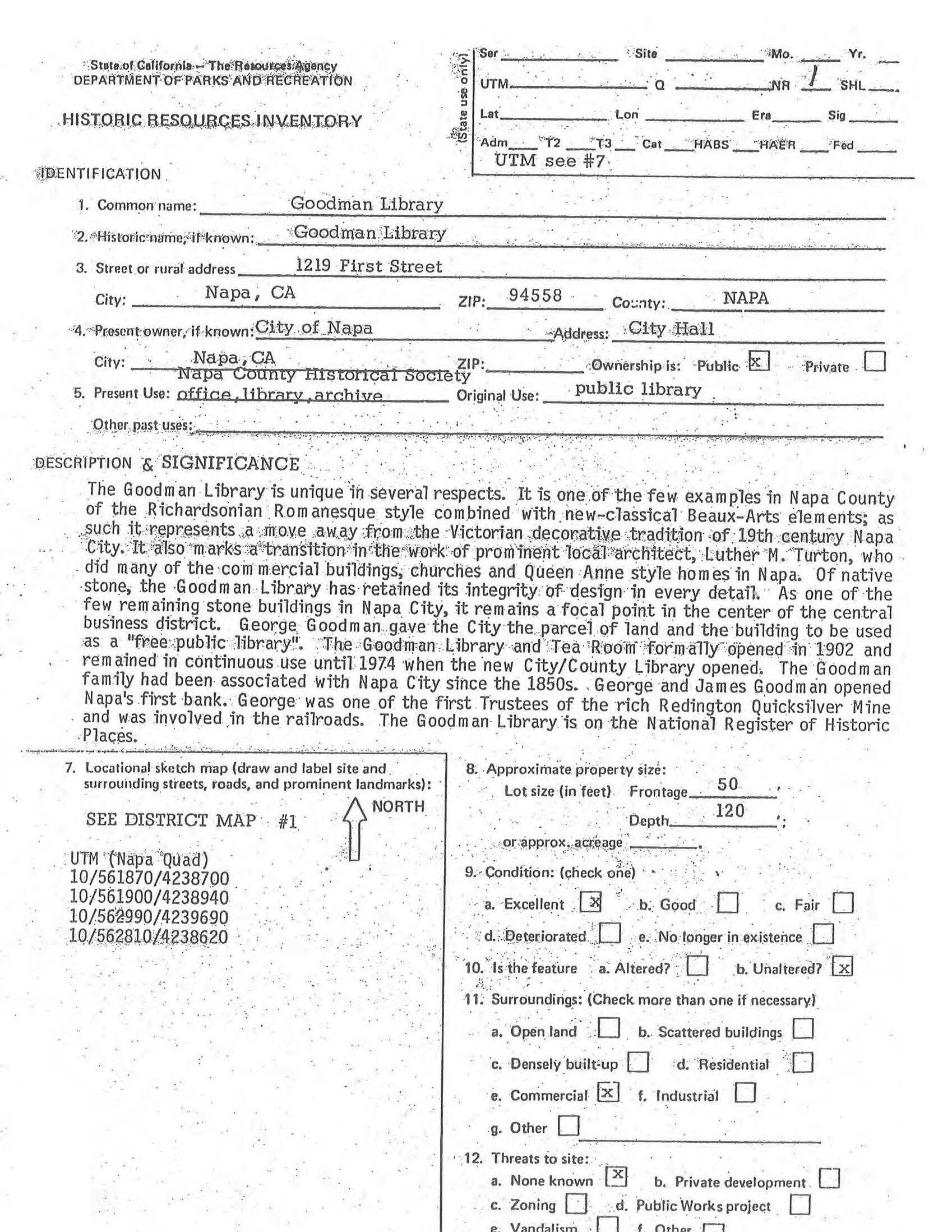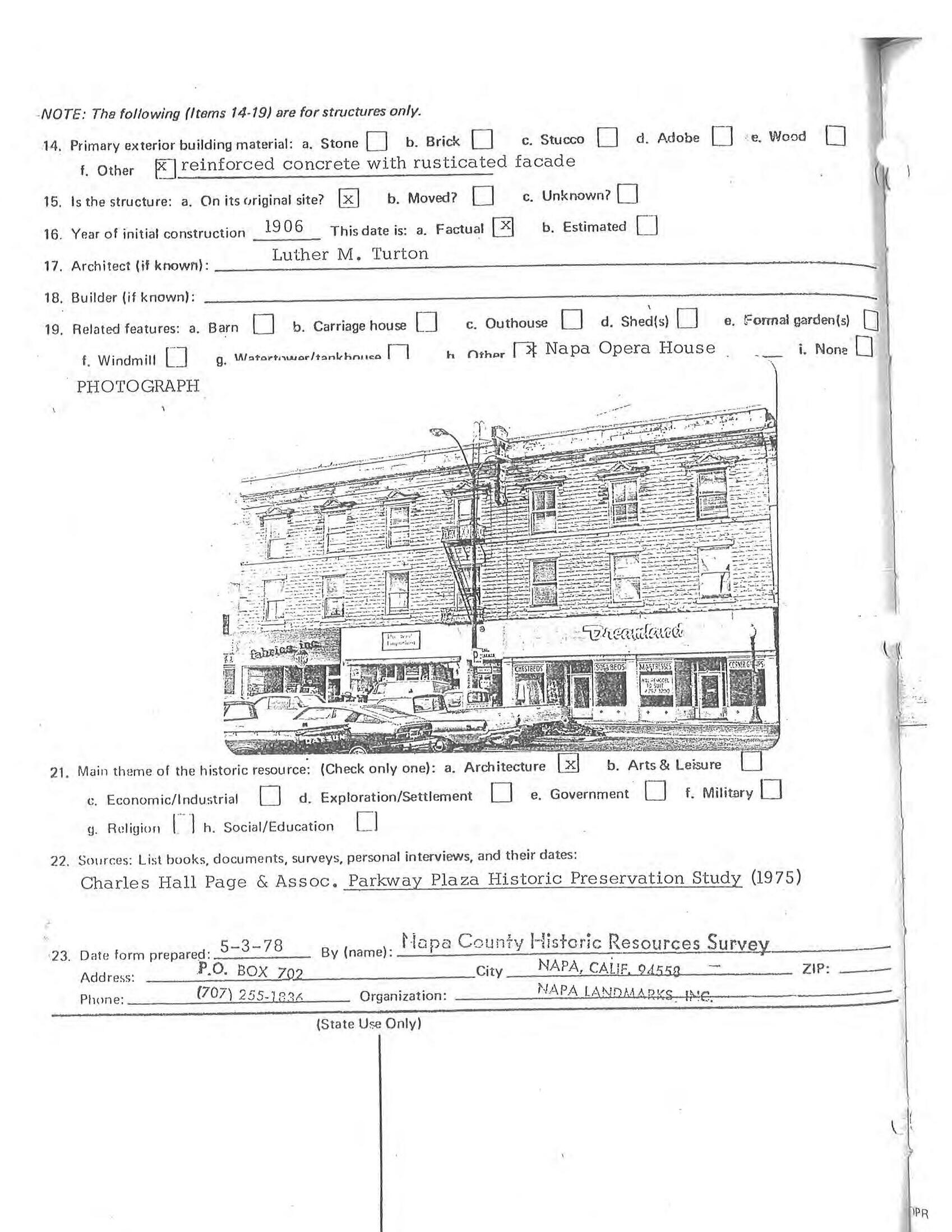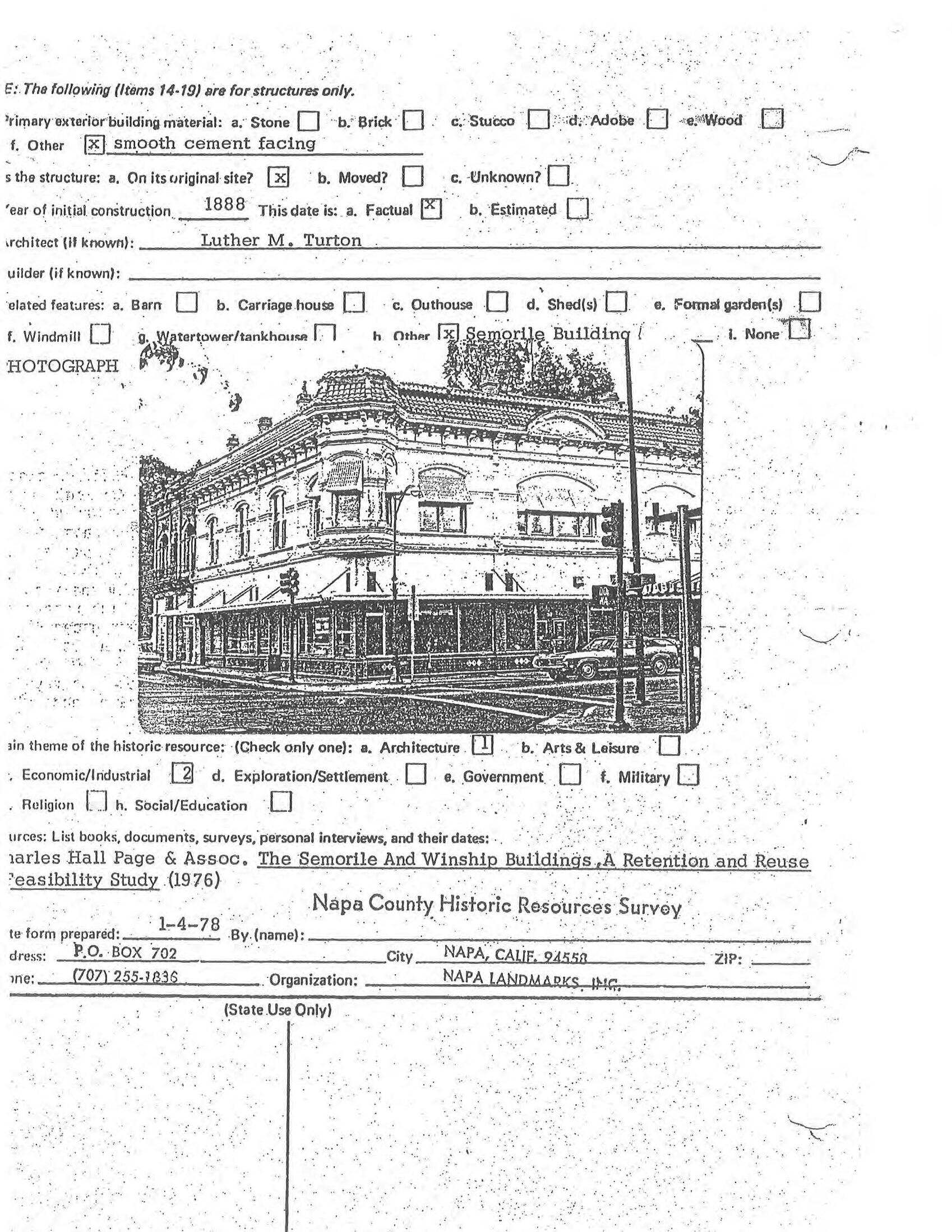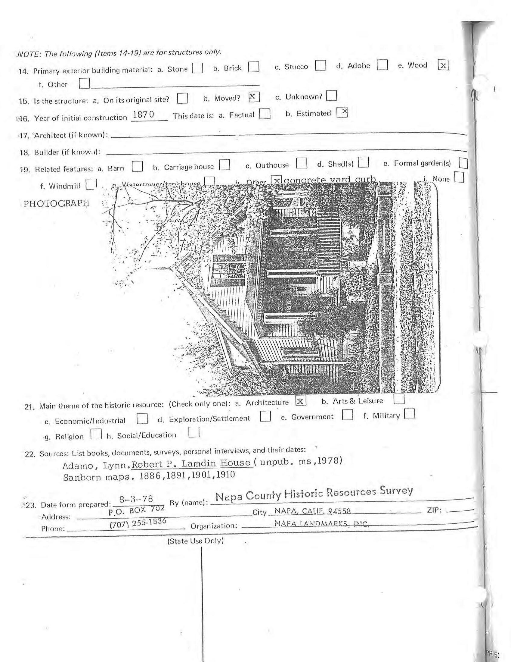 6 Napa Landmarks, Inc., “Final Report: Napa County Historic Resources Inventory” (Napa: unpublished report, 1 December 1978), in City of Napa Planning Department Archives, 1-11.