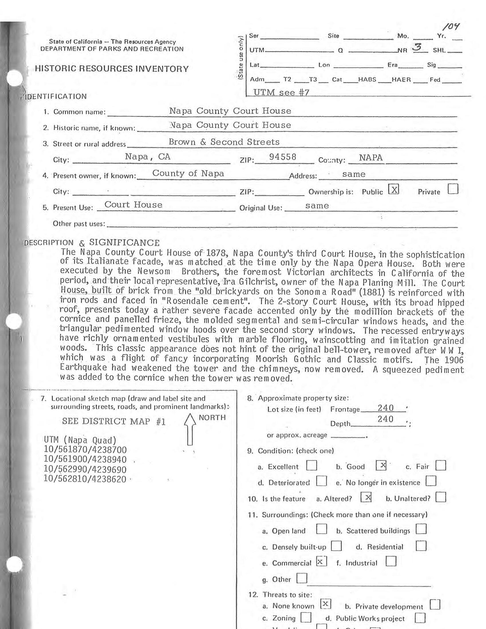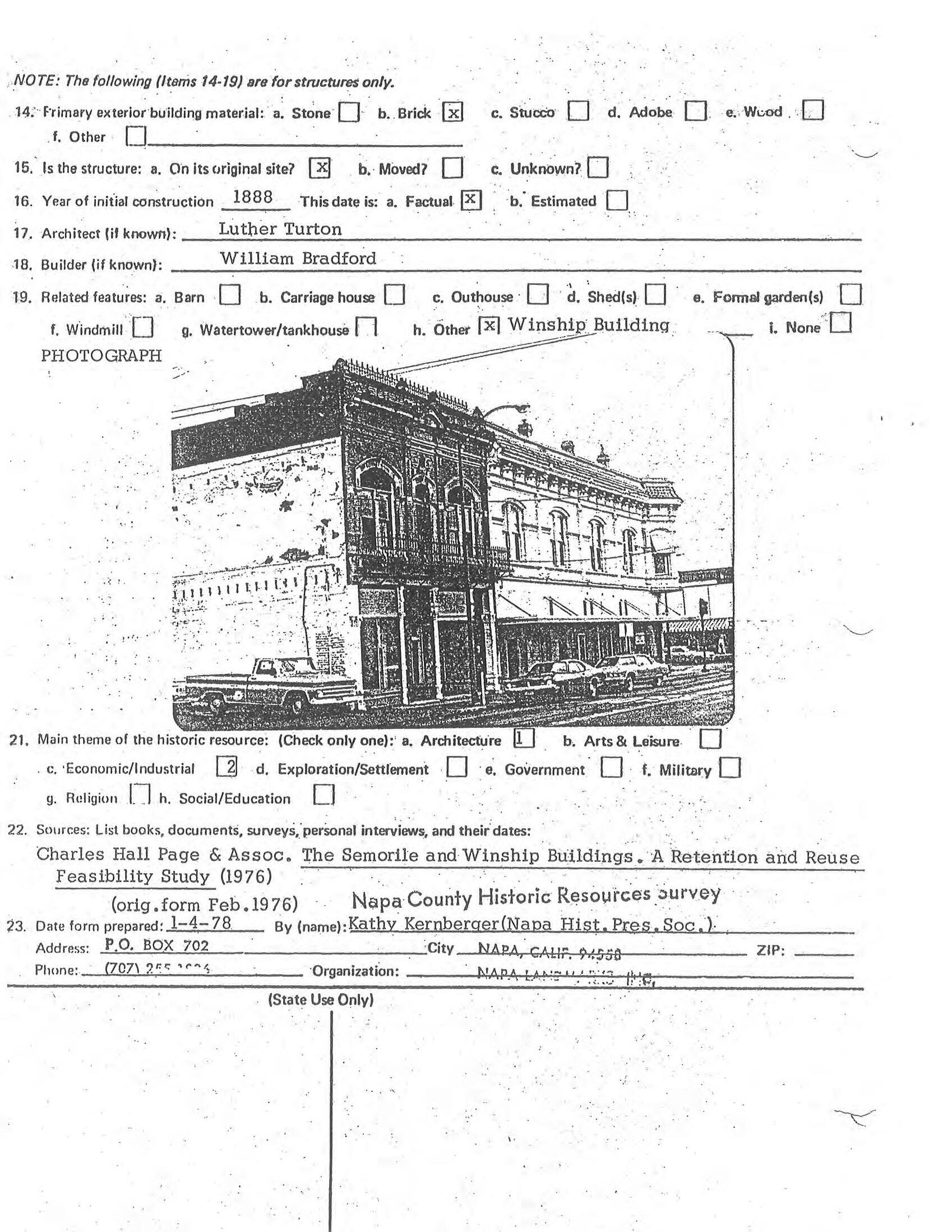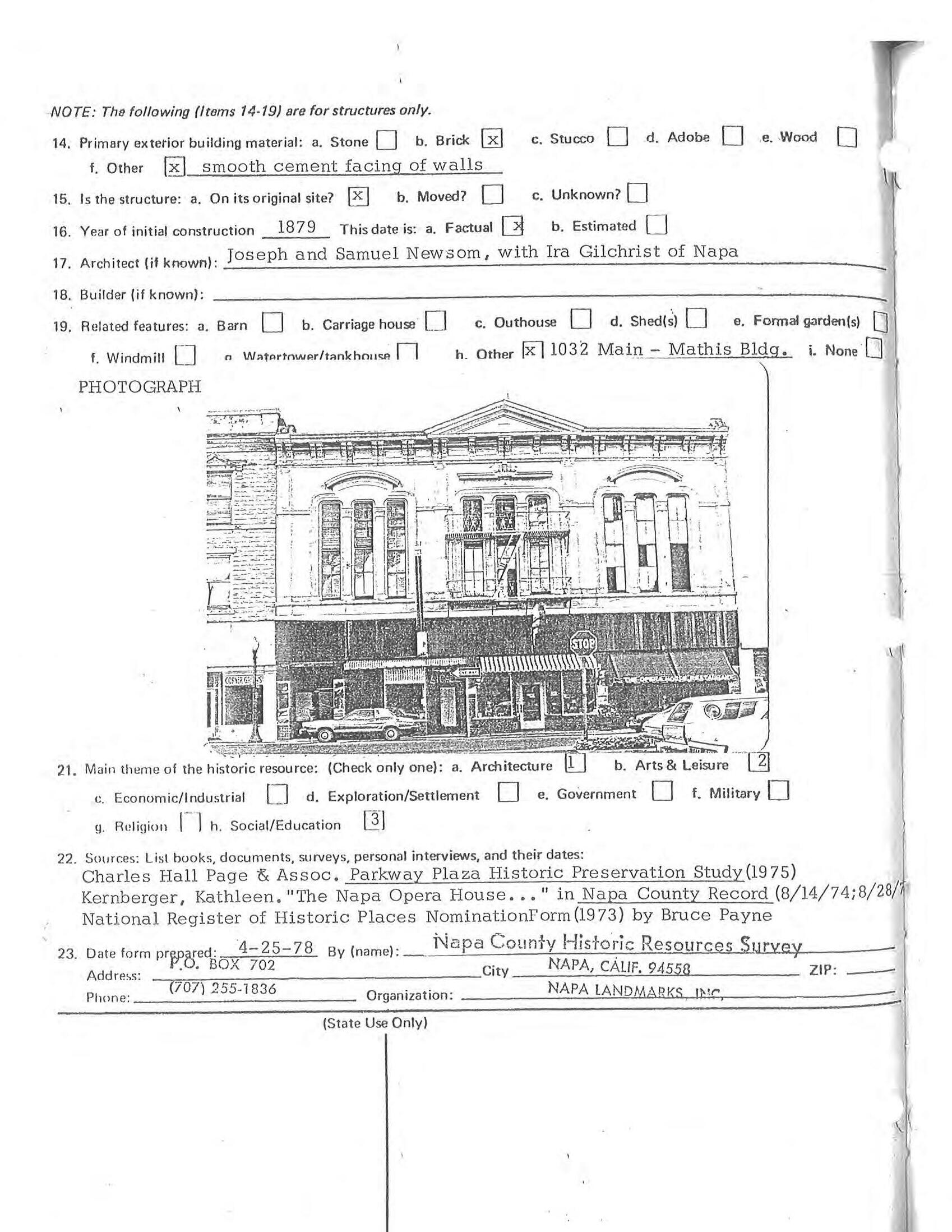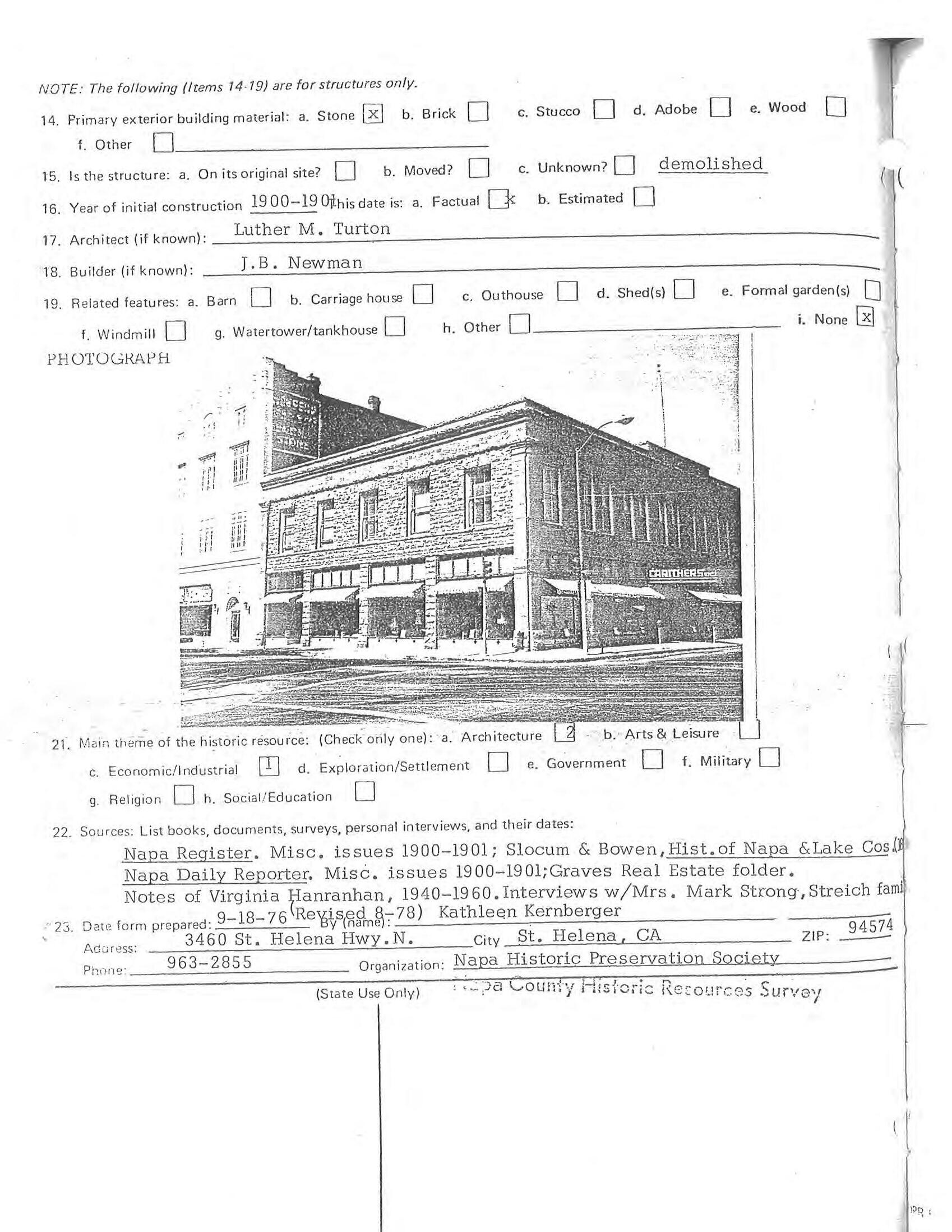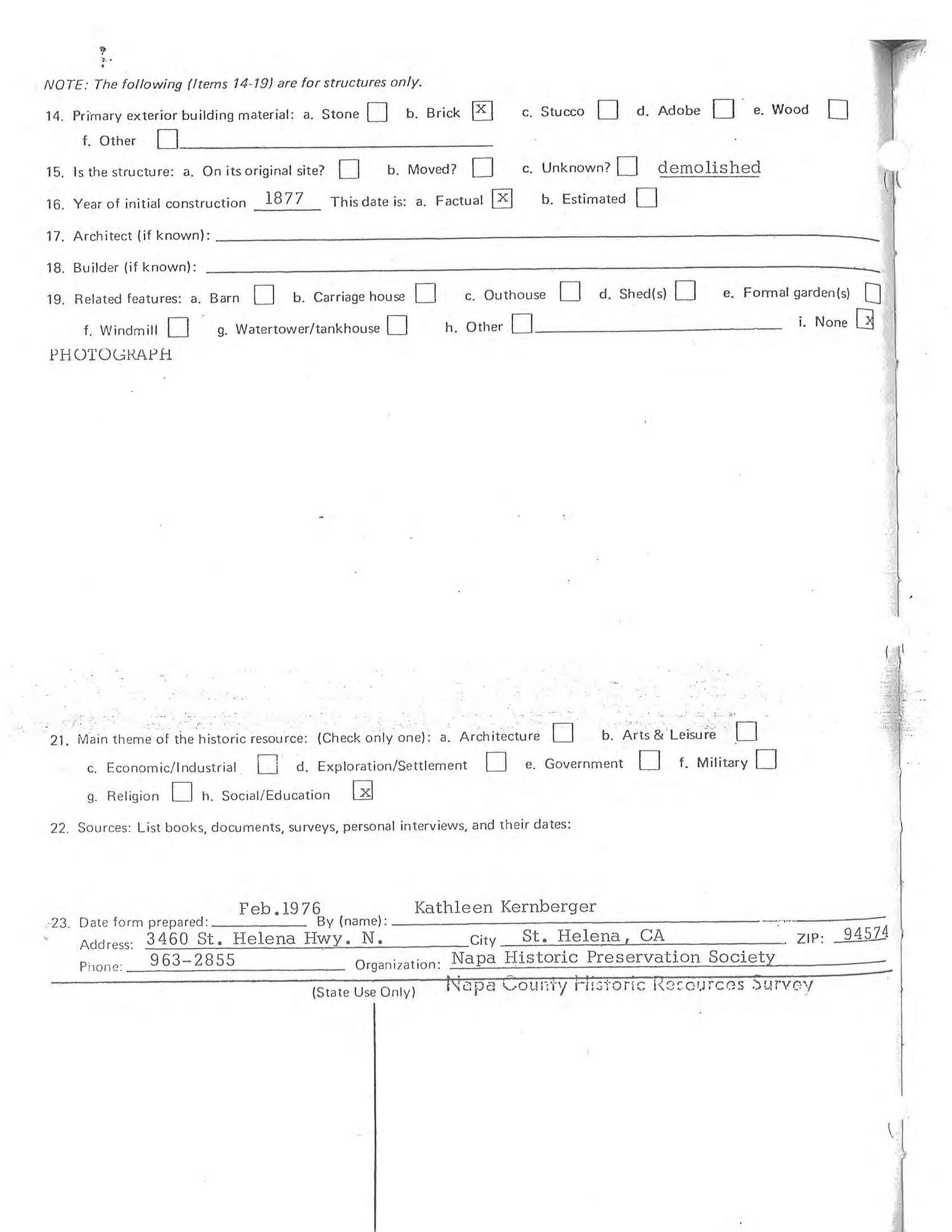 6 Napa Landmarks, Inc., “Final Report: Napa County Historic Resources Inventory” (Napa: unpublished report, 1 December 1978), in City of Napa Planning Department Archives, 1-11.