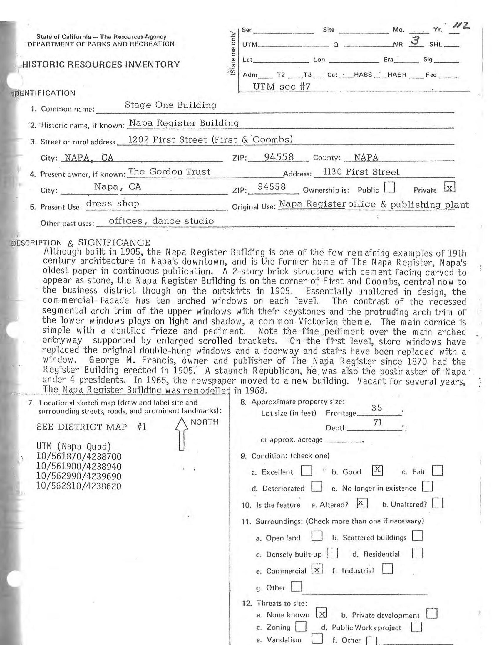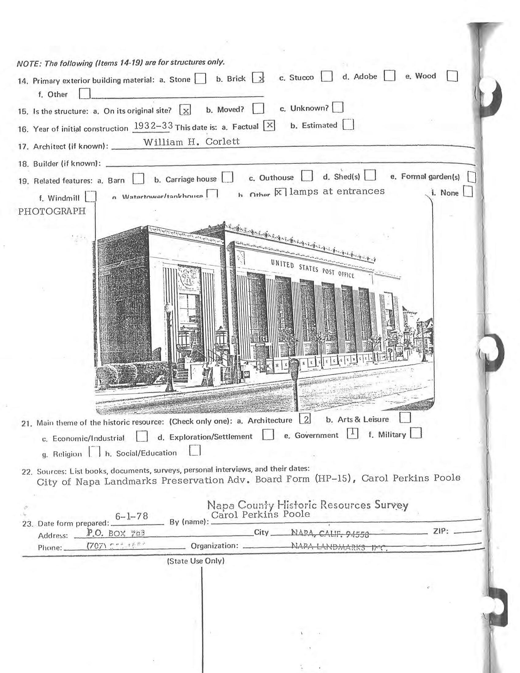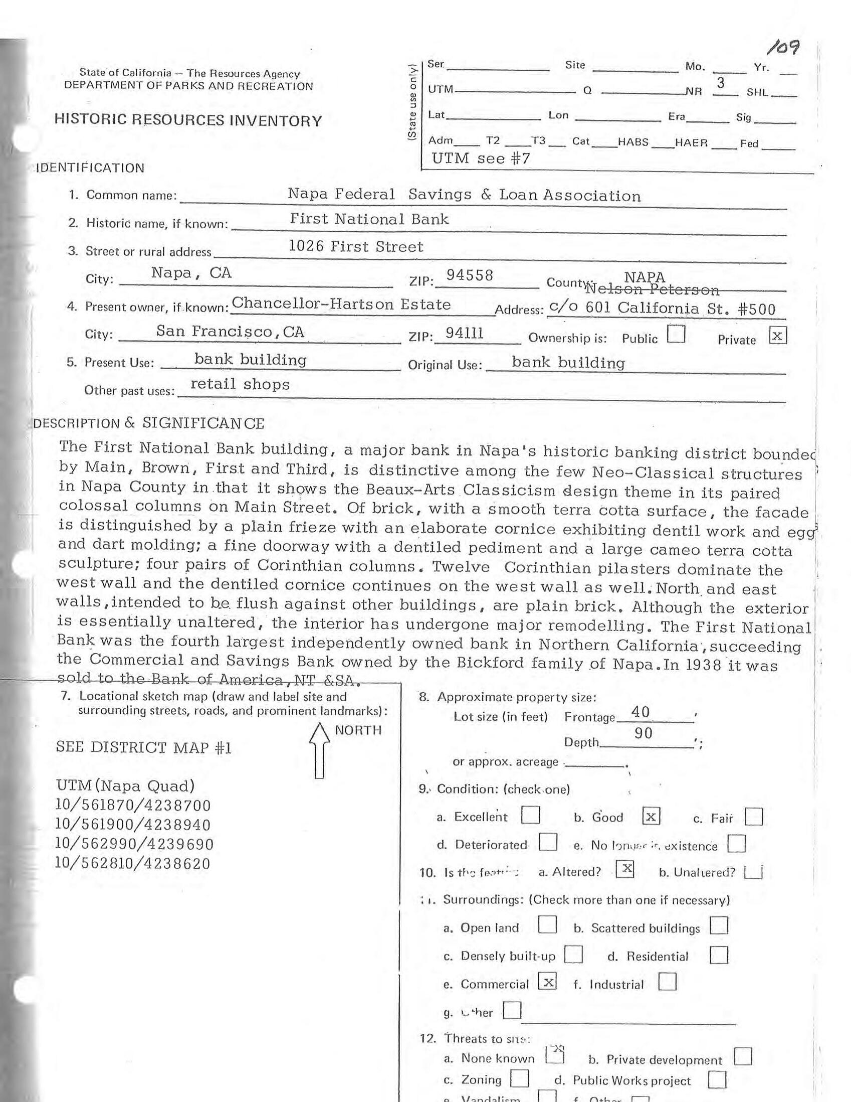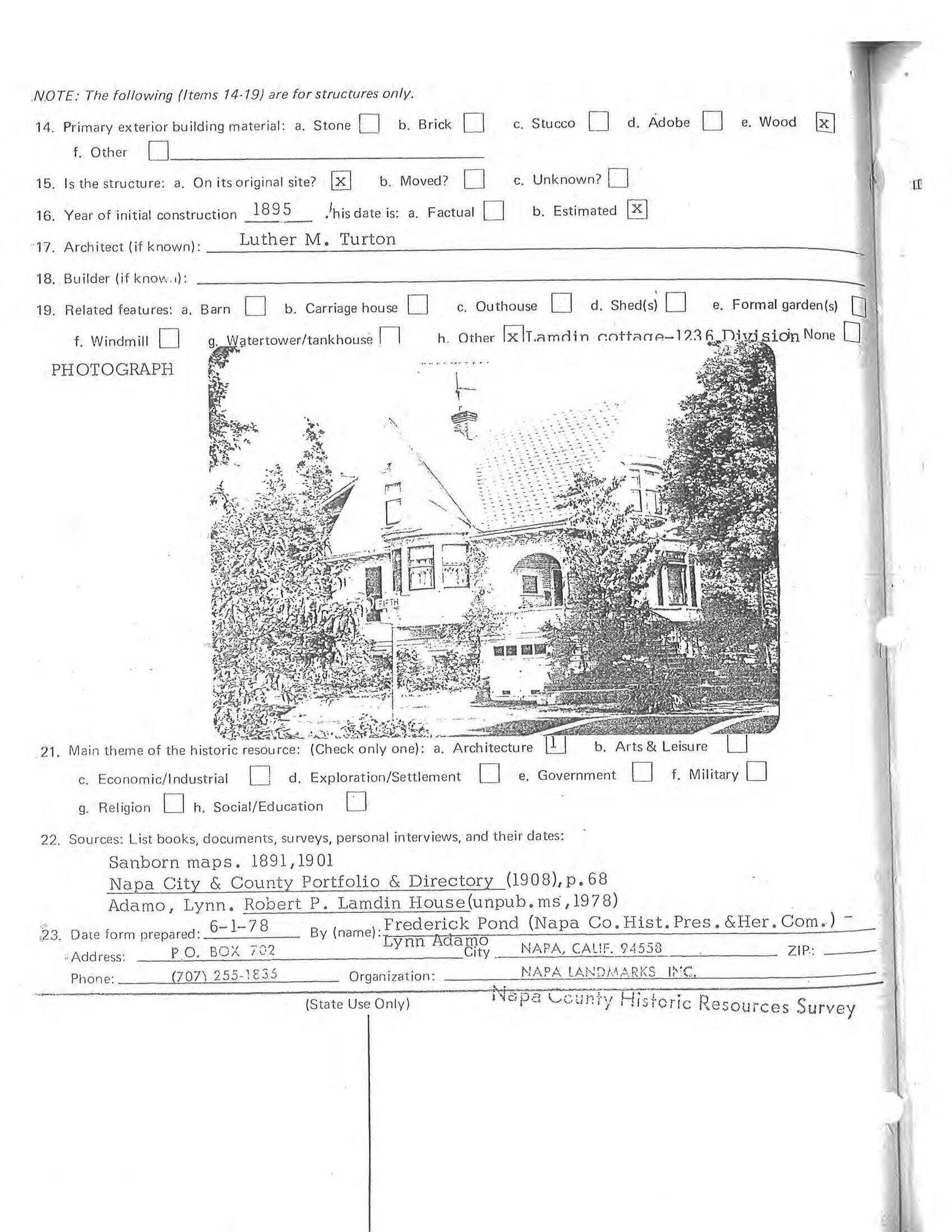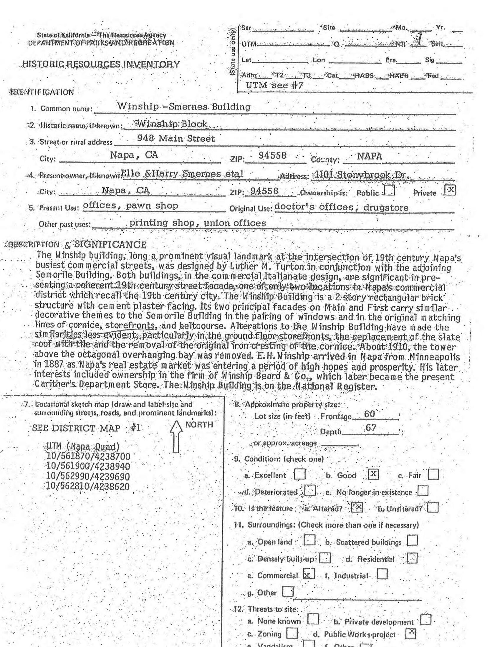 6 Napa Landmarks, Inc., “Final Report: Napa County Historic Resources Inventory” (Napa: unpublished report, 1 December 1978), in City of Napa Planning Department Archives, 1-11.