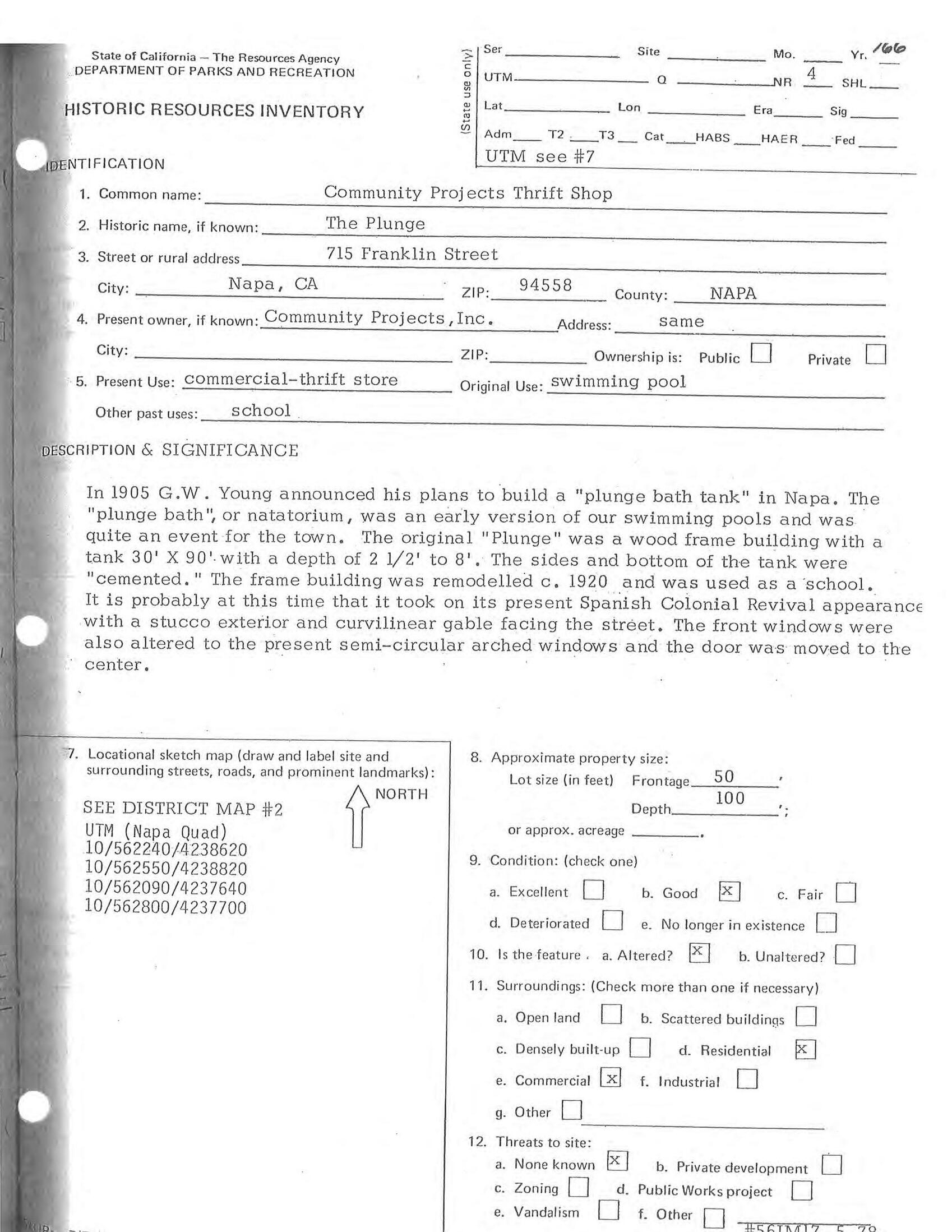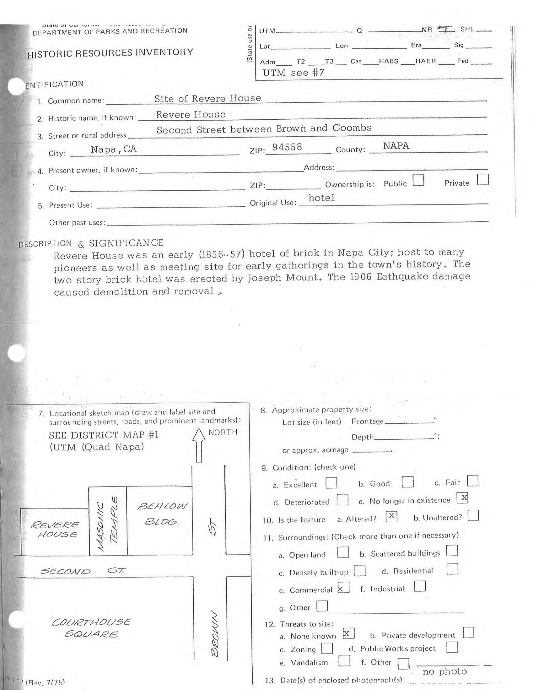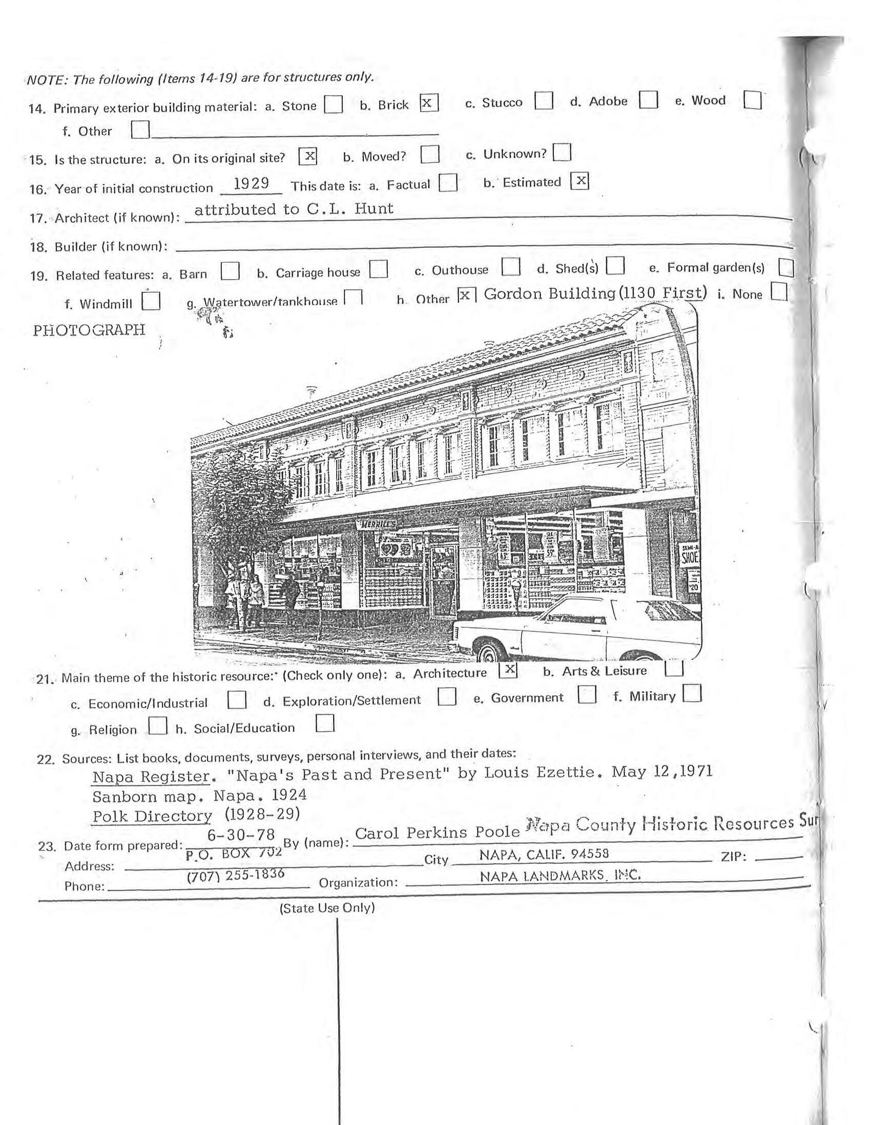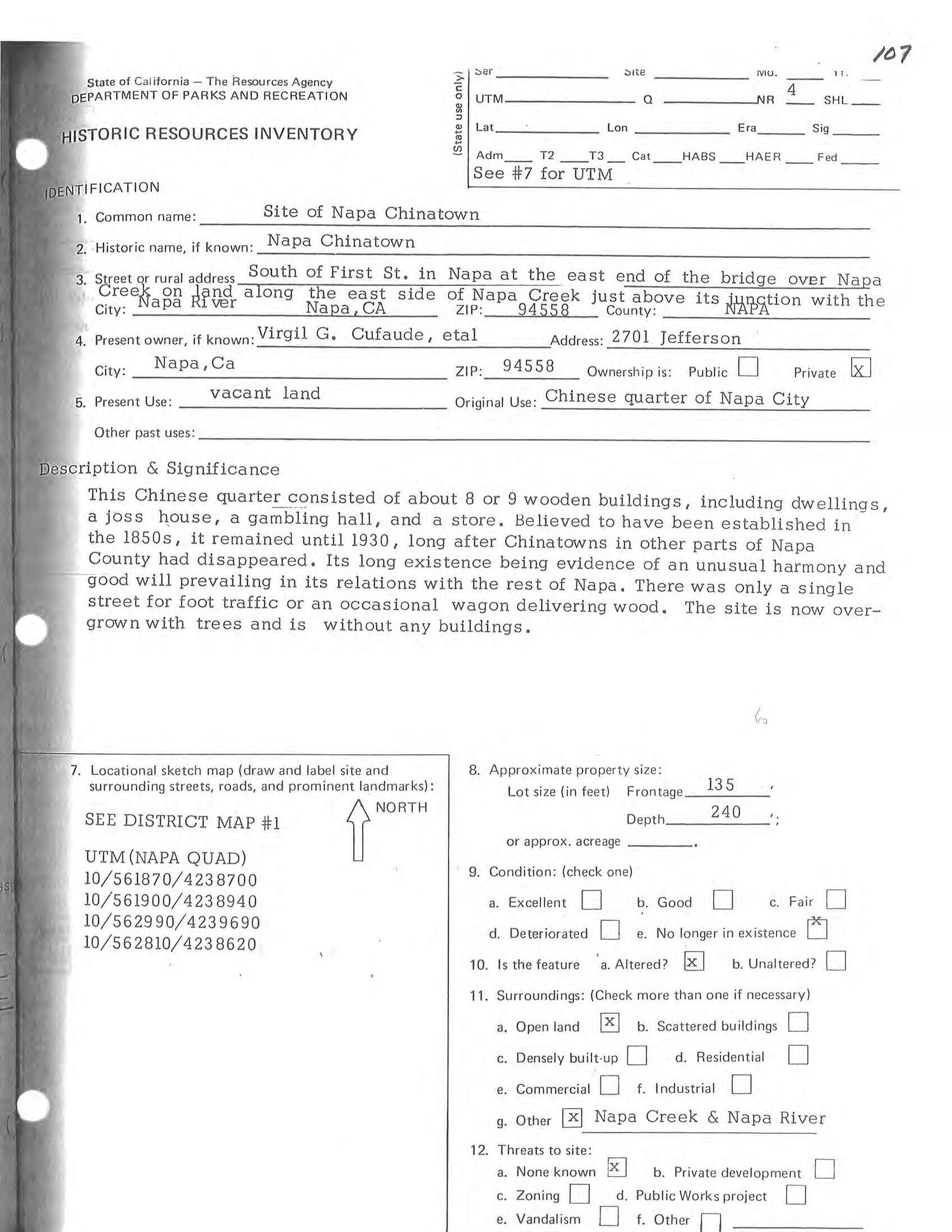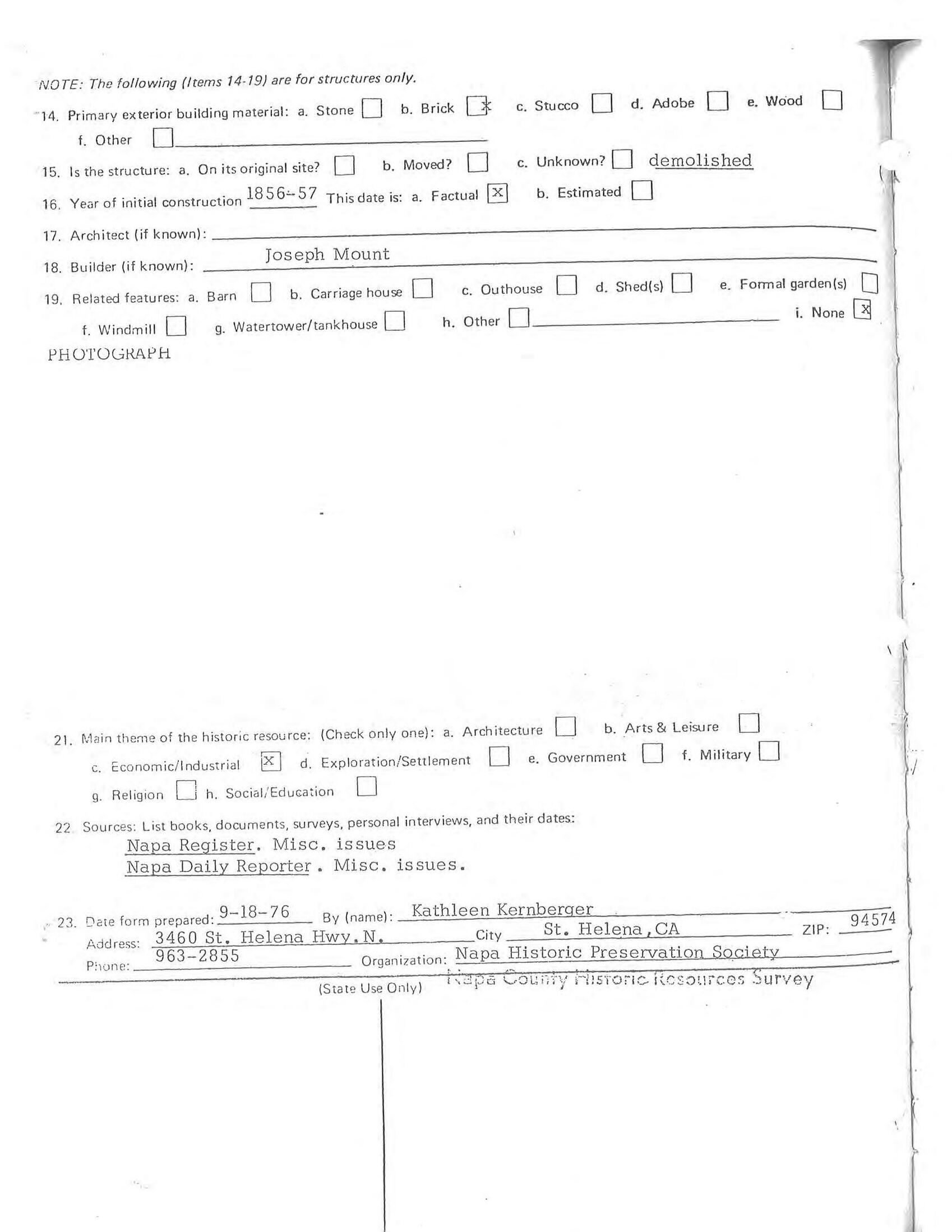 6 Napa Landmarks, Inc., “Final Report: Napa County Historic Resources Inventory” (Napa: unpublished report, 1 December 1978), in City of Napa Planning Department Archives, 1-11.