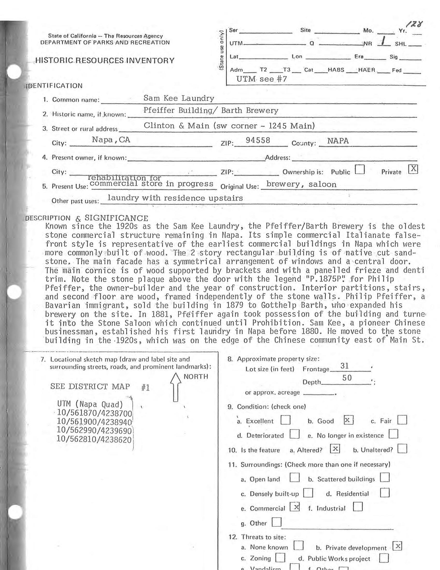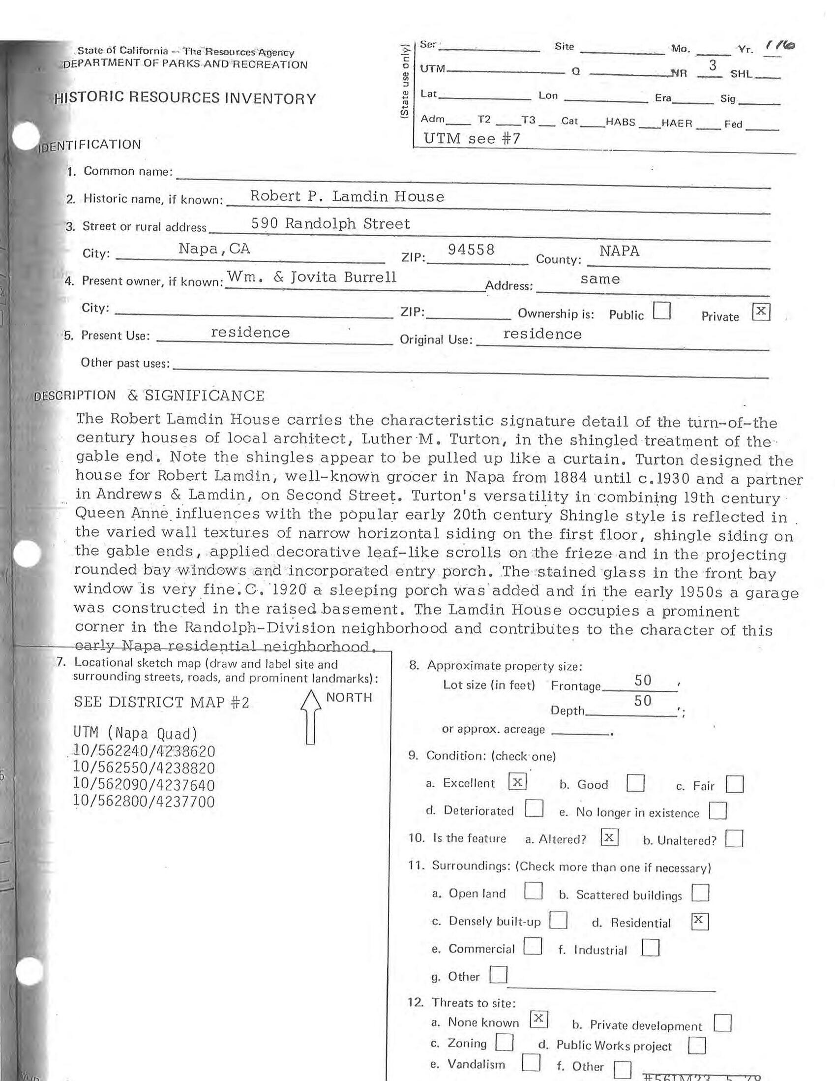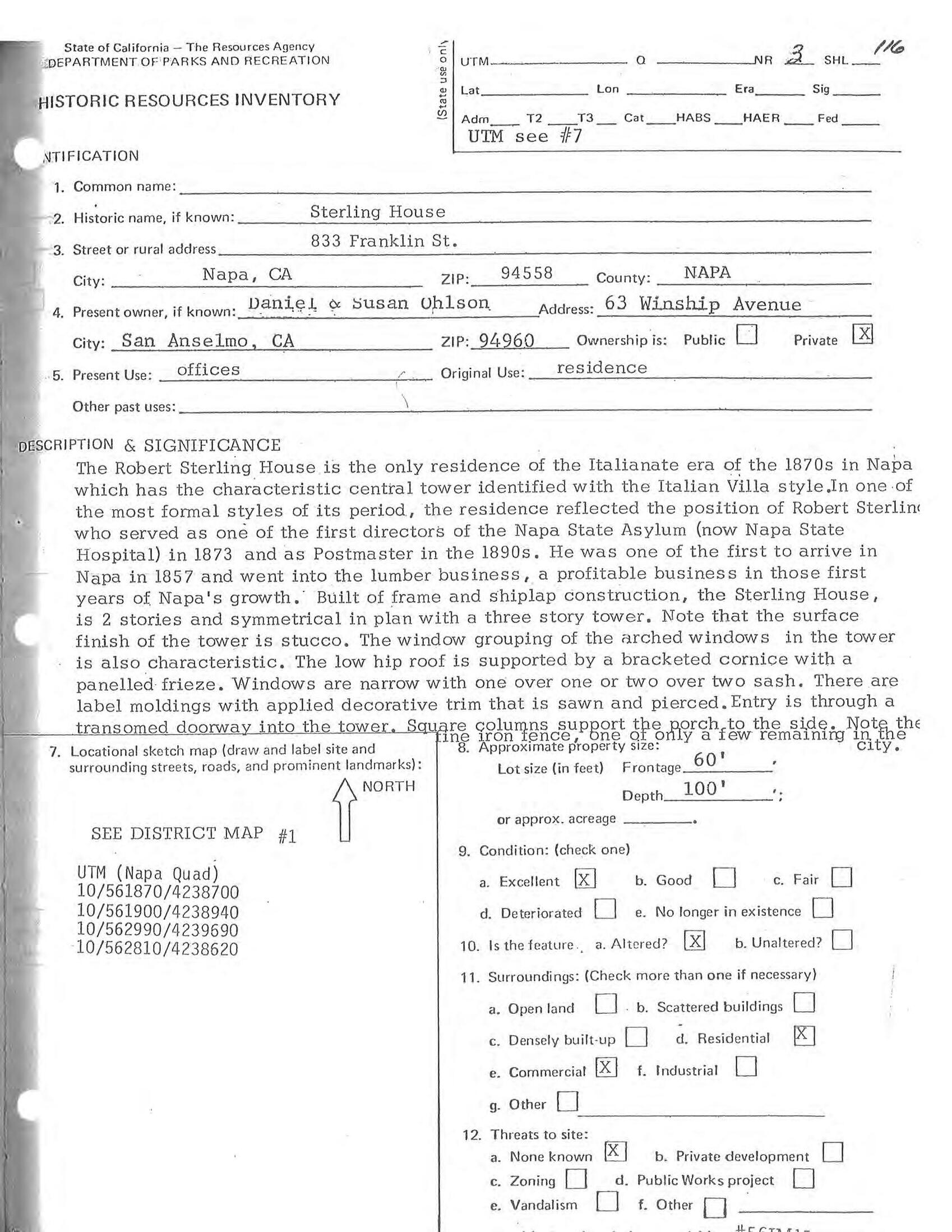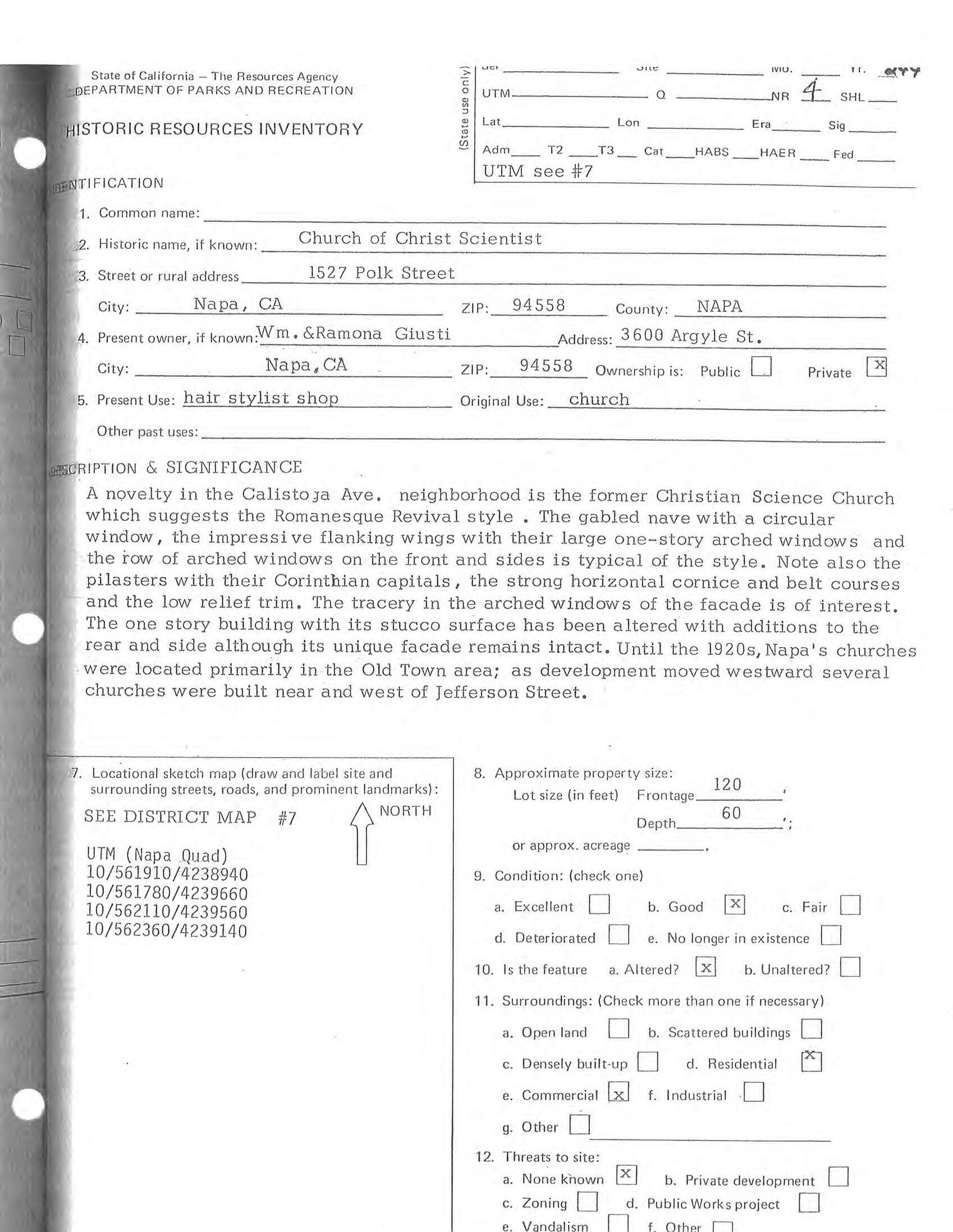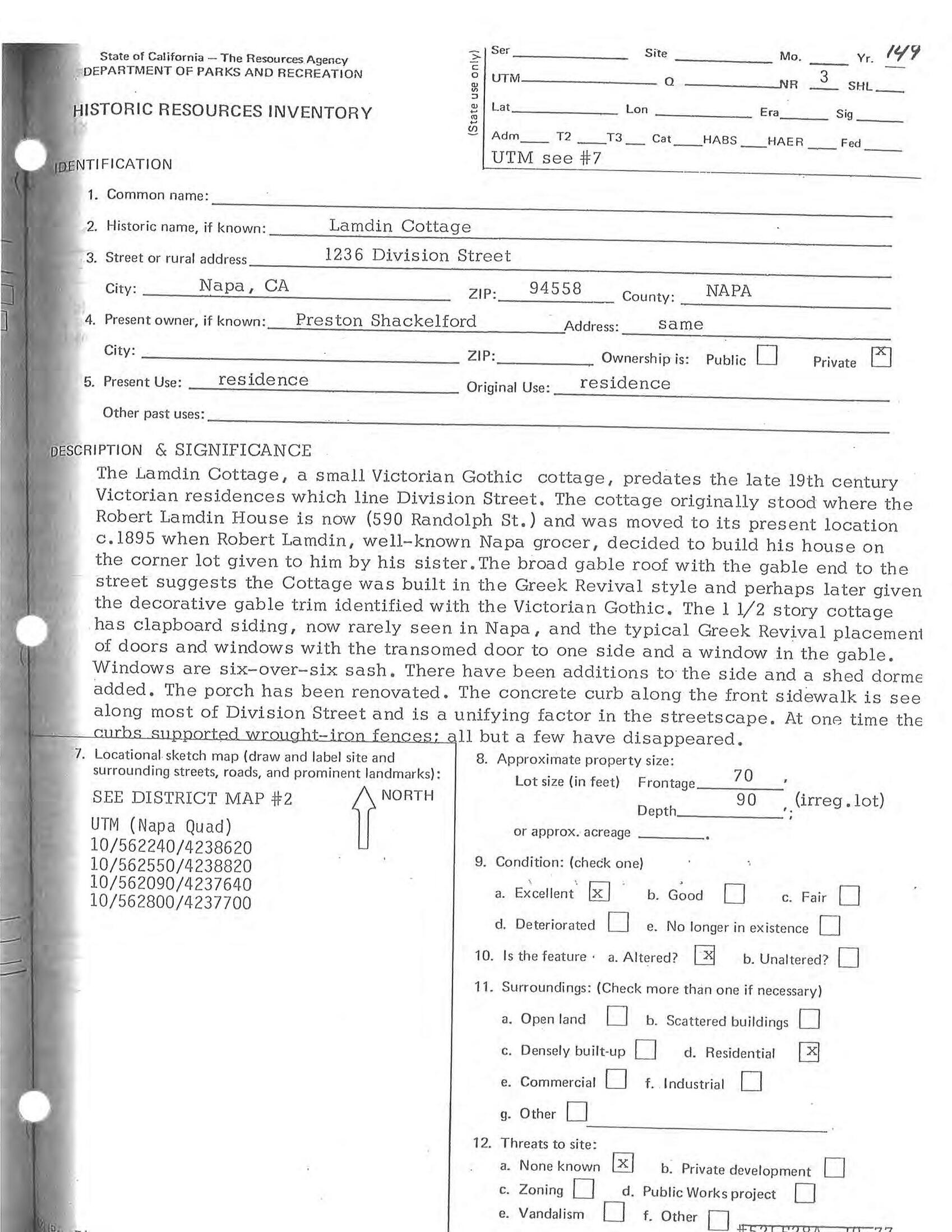 6 Napa Landmarks, Inc., “Final Report: Napa County Historic Resources Inventory” (Napa: unpublished report, 1 December 1978), in City of Napa Planning Department Archives, 1-11.