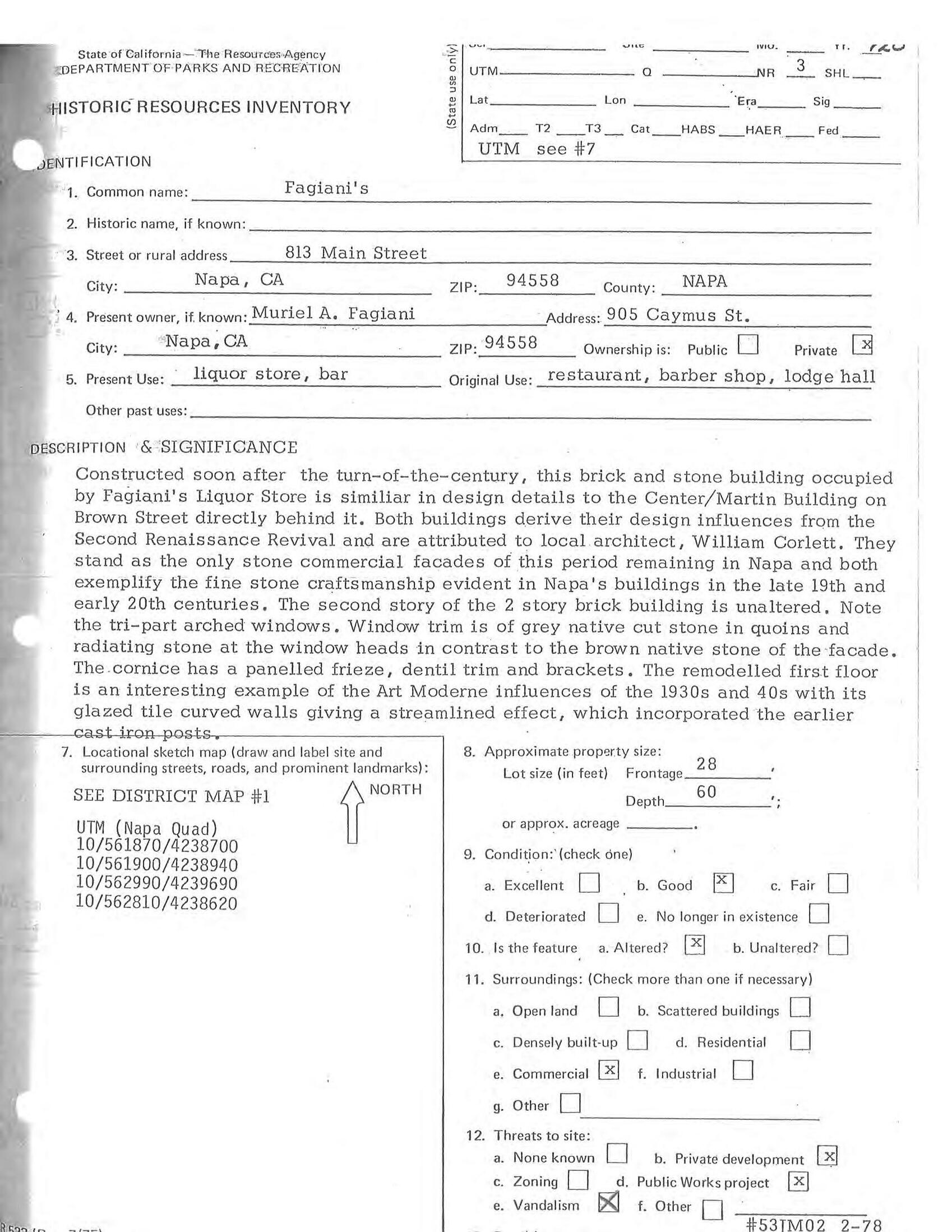 Downtown Napa was one of the primary study areas included in the 1978 Survey, and many properties were found to be significant. 39 properties within the Downtown Napa survey area were documented on Department of Parks and Recreation forms as part of the 1978 Survey; this included properties in the Downtown, Napa Abajo, St. John’s, and Fuller Park survey districts.