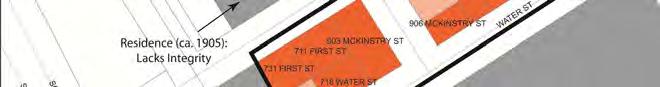 Although it is not explicitly mentioned in previous documentation of the Noyes Mansion, it is associated with the Mansion’s original construction and adds to the significance of the property under all criteria. The carriage house is therefore eligible for listing in NR, CR and local register—both as an element of the individual listing of the Noyes Mansion, and as part of the First & Jefferson Streets Historic District (3B: Appears eligible for NR both individually and as a contributor to a NR eligible district through survey evaluation / 5B: Locally significant both individually and as a contributor to a district that appears eligible through survey evaluation).