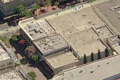 Photo 9: Aerial photograph of Merrill’s Building, showing Lshaped plan and unusual massing of Merrill’s Building. Note difference in roofing delineating 1025 Coombs Street. (Bing Maps, 2010)