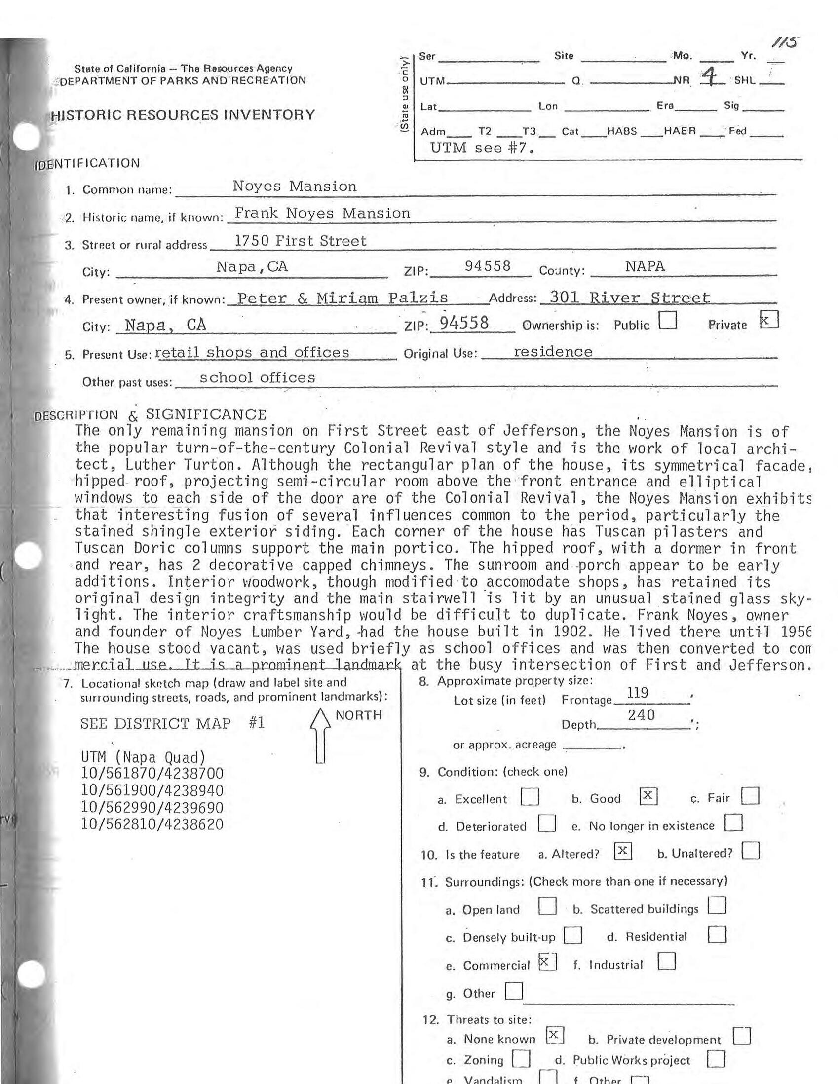 Noyes Mansion (1902) – Original residence, designed by Luther Turton. Listed in NR (1S: Individual property listed in NR by the Keeper. Listed in the CR.). City of Napa Landmark Property (5S1: Individual property that is listed or designated locally). Contributor to the potential First & Jefferson Streets Historic District (3B: Appears eligible for NR both individually and as a contributor to a NR eligible district through survey evaluation / 5B: Locally significant both individually and as a contributor to a district that appears eligible through survey evaluation).