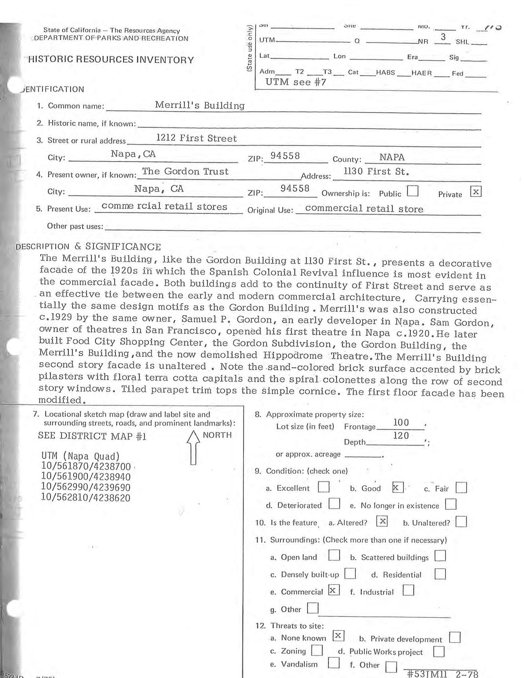 1978 Historic Resources Inventory Forms. “Merrill’s Building.” Napa, 1978. City of Napa. Building Permits. Kilgallin, Anthony Raymond. Napa: An Architectural Walking Tour. Charleston, SC: Arcadia Publishing, 2001. Pacific Aerial Surveys. Aerial Photographs. 1958-1995.