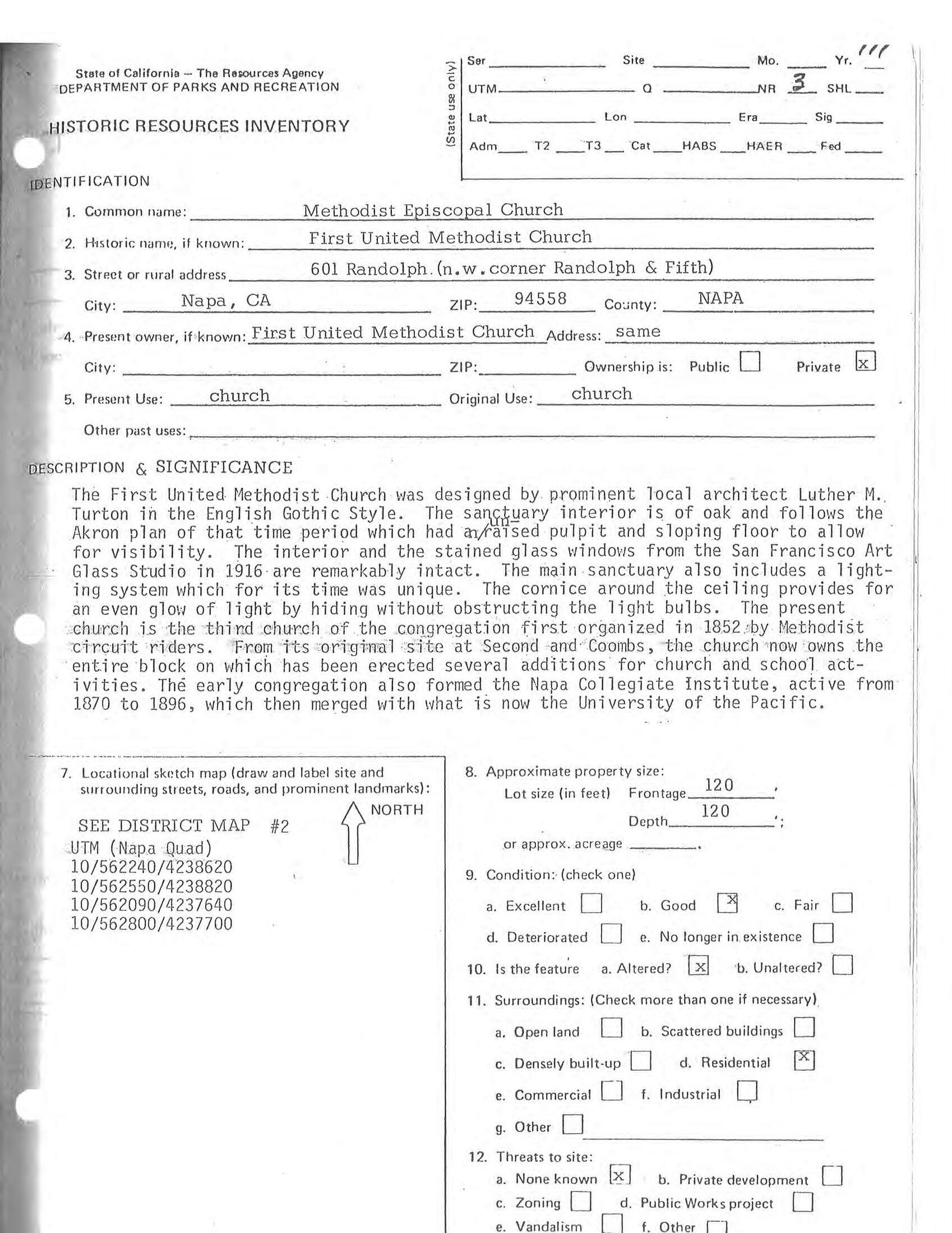 The First United Methodist Church at 601-625 Randolph Street (APN 003262007000, 003262006000) was surveyed and listed in the City of Napa Historic Resources Inventory (HRI) as a Landmark Property in 1976. The church was included in the 1978 Survey, and was found eligible for listing in the National Register of Historic Places. The building was recorded in the California Historical Resource Information System database with a California Historical Resource Status Code (CHRSC) of “3S,” indicating that it “Appears eligible for NR as an individual property through survey evaluation.”