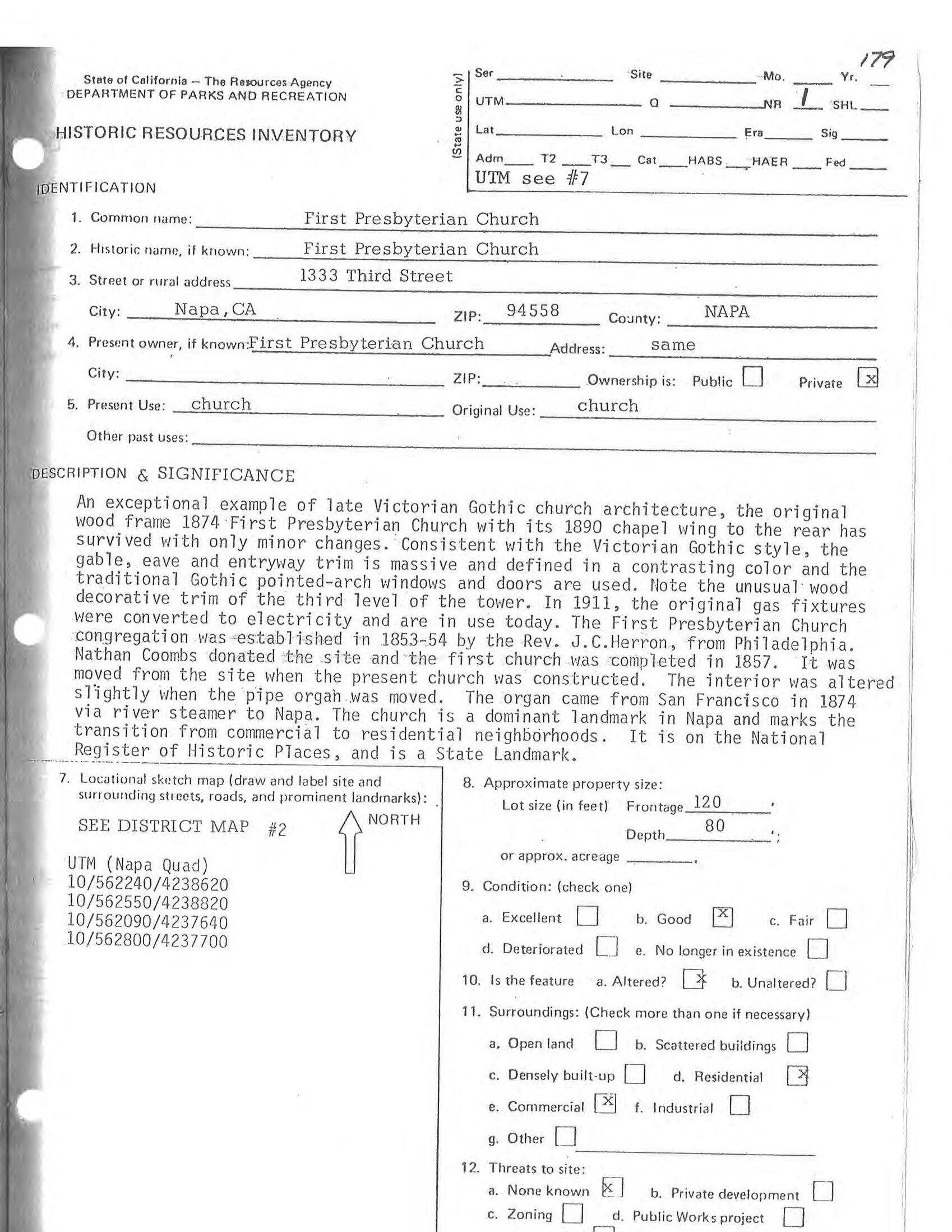 The First Presbyterian Church at 1333 Third Street (APN 003209004000, 003209005000, 003209010000) was surveyed and listed in the National Register of Historic Places in 1974. The church was also included in the City of Napa Historic Resources Inventory (HRI) as a Landmark Property in 1976. It was recorded in the California Historical Resource Information System database with a California Historical Resource Status Code (CHRSC) of “1S,” indicating that it is an “Individual property listed in NR by the Keeper. Listed in the CR.”