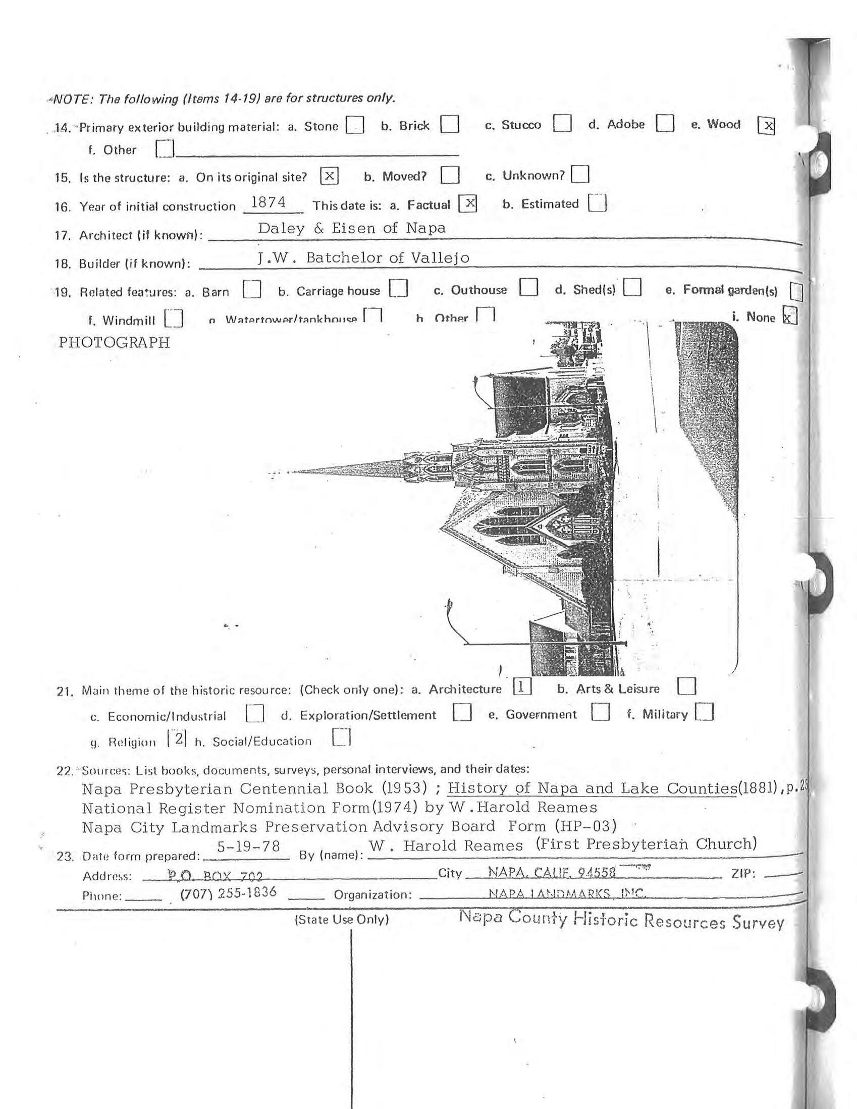 1978 Historic Resources Inventory Forms. “First Presbyterian Church.” Napa, 1978.