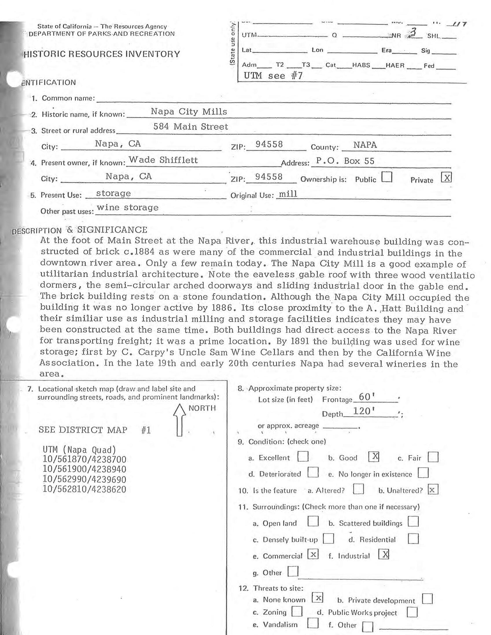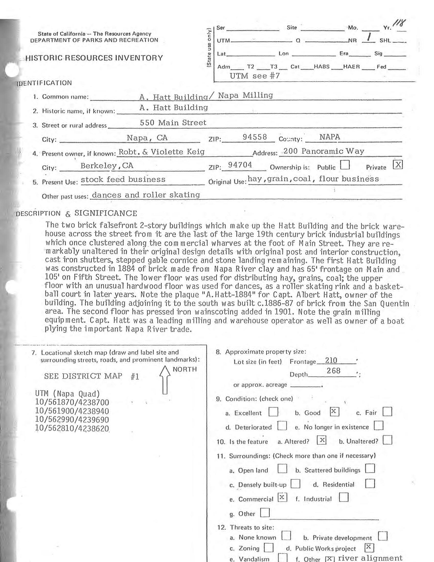 The Hatt Building/Napa Milling Complex at 550 Main Street (APNs 003277002000, 003277003000, 003277006000, 003277007000, 003277008000, 003275003000) was surveyed and listed in the National Register of Historic Places in 1974. The complex was also listed in the City of Napa Historic Resources Inventory (HRI) as a Landmark Property in 1977. The resource was recorded in the California Historical Resource Information System database with a California Historical Resource Status Code (CHRSC) of “1S,” indicating that it is an “Individual property listed in NR by the Keeper. Listed in the CR.”