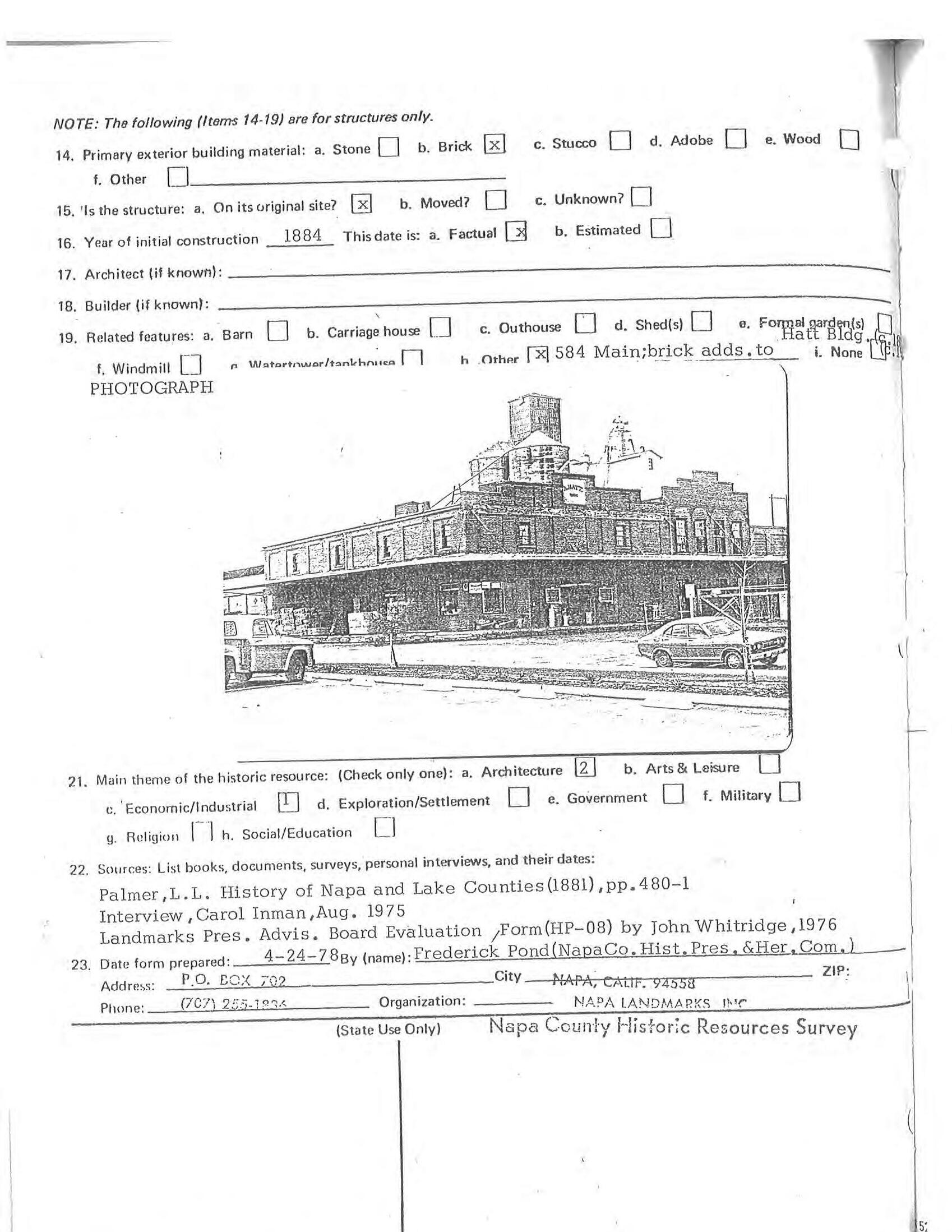 Hatt Building (1886) – Early addition to the building. Listed in NR (1S: Individual property listed in NR by the Keeper. Listed in the CR.) City of Napa Landmark Property (5S1: Individual property that is listed or designated locally).
