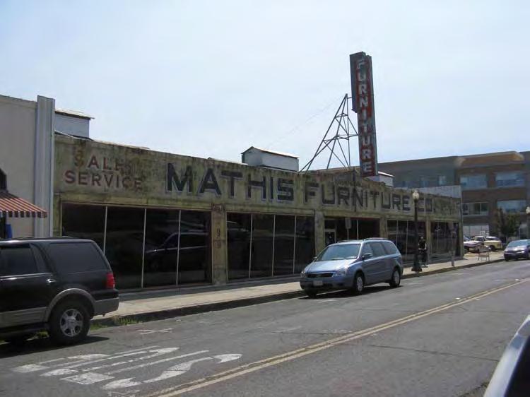 The Mathis-Flanagan Building was constructed in 1906 for real estate investor John Flanagan. The Flanagan Building, as it was originally called, housed retail spaces on the ground floor with offices, apartments, and the Cecille Hotel upstairs. A lodge room on the second floor was originally used by the Woodmen of the World, who rented the room out to other fraternal organizations. The building housed the Hotel Reavis in the 1930s and 1940s, and is listed in City Directories as the Major Building in the 1950s. The building was owned by Virgil & Betty Mathis in the 1970s, and historic photographs from this era show a vertical blade sign reading “Mathis Building” in the center of the primary façade.