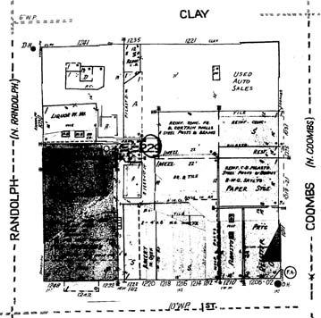 Photo 10: Sanborn Fire Insurance Map, 1949, with Merrill’s Building shaded in orange and 1025 Coombs Street shaded in green.