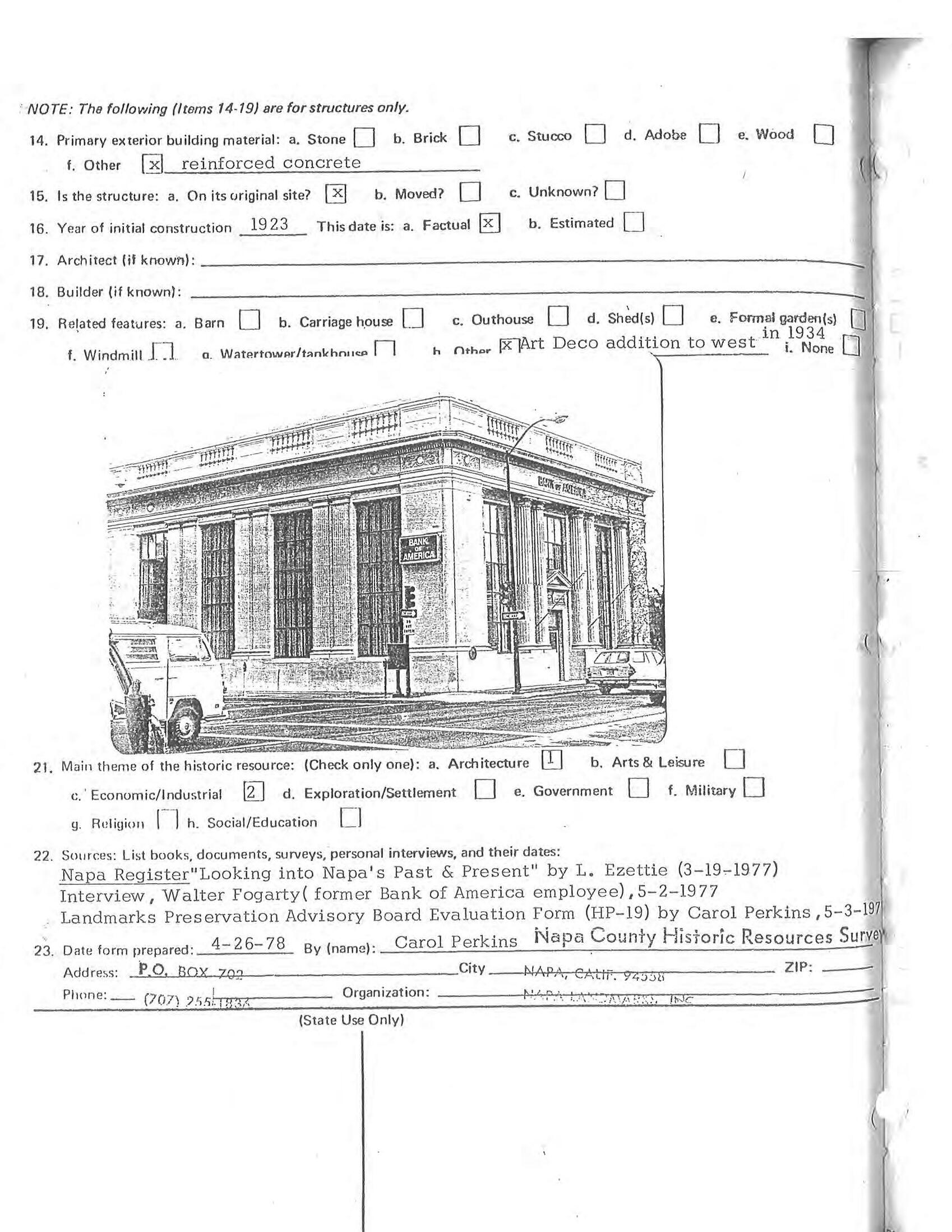 Bank of Napa (1923) – Original bank, designed in the Beaux-Arts style. Listed in NR (1S: Individual property listed in NR by the Keeper. Listed in the CR.). City of Napa Landmark Property (5S1: Individual property that is listed or designated locally).