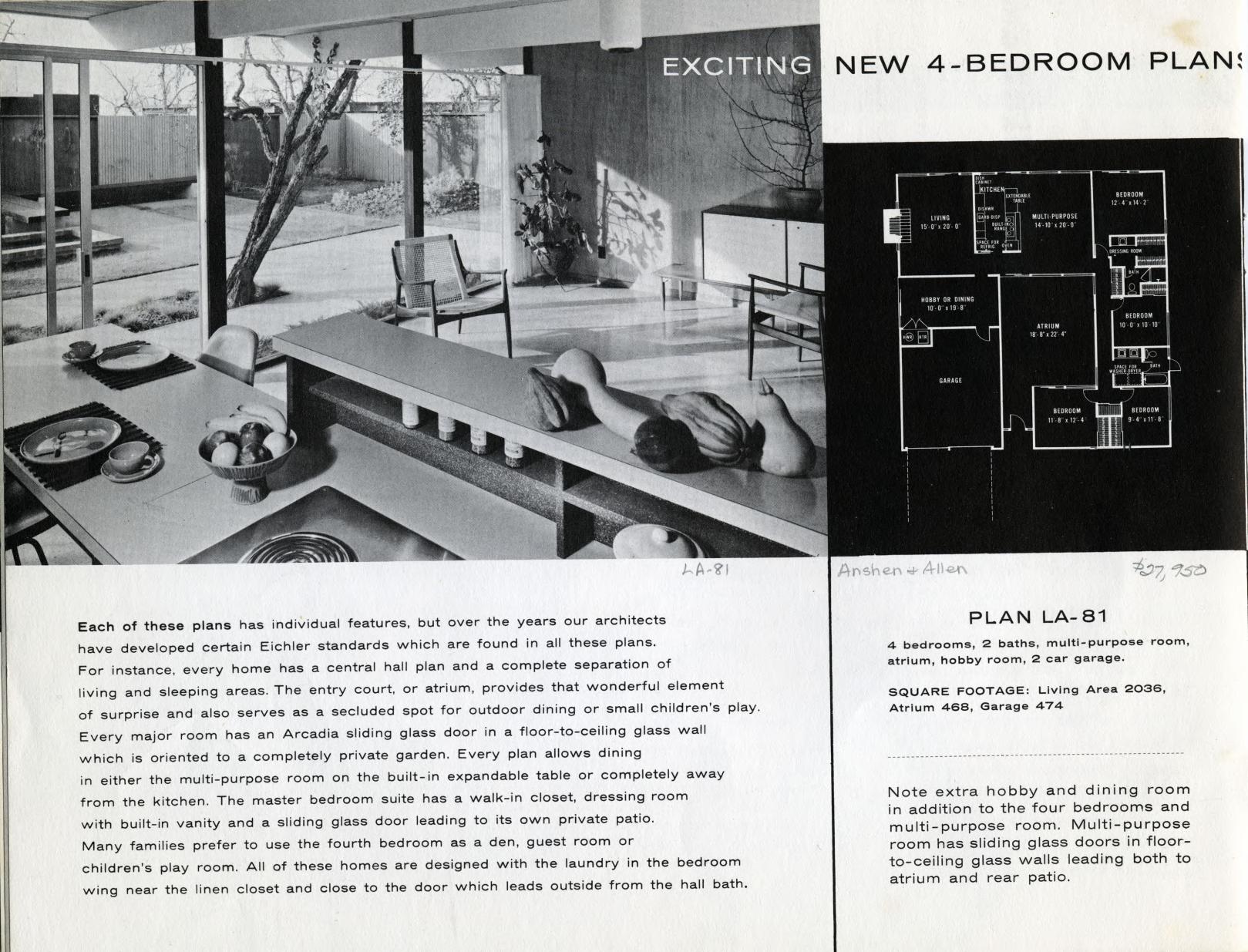 Drawn to California’s more relaxed and experimental design culture, Anshen and Allen established their own firm in the Bay Area in 1940. During the following decade, Anshen and his wife Eleanor produced papers arguing that Modern, mass-constructed home designs should incorporate the most recent technological innovations available and to integrate numerous building systems. Once hired by Eichler Homes, Anshen and Allen were able to realize these ideas, which were represented in their AA-1 prototype design.