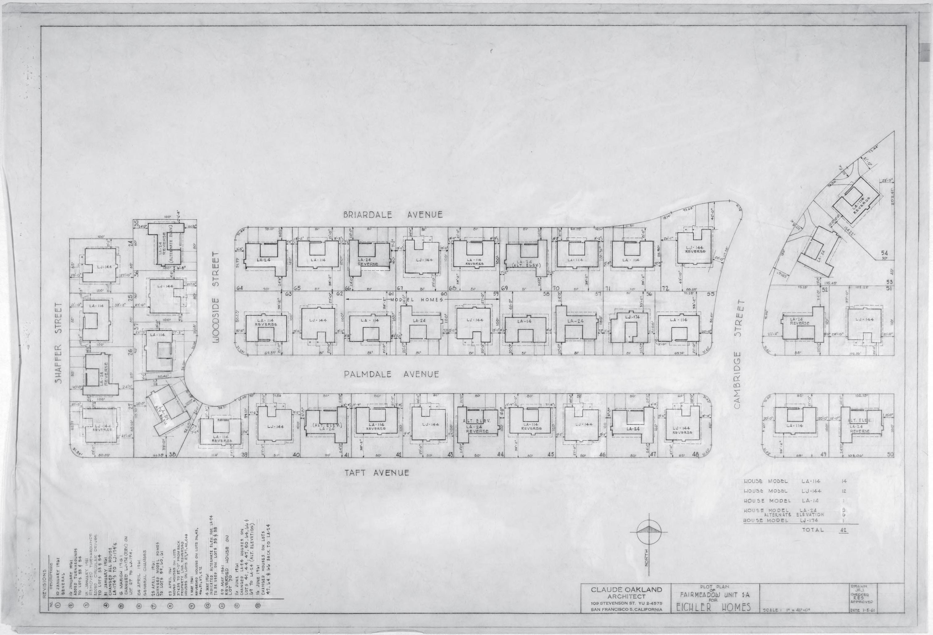 Even though his was the third design firm hired by Joseph Eichler, Claude Oak land was involved in the real estate company’s development projects nearly from the start. After graduating from Tulane University and training with architect Bruce Goff, Oakland joined Anshen and Allen in 1950 and oversaw many of the firm’s designs for Eichler Homes during the next ten years. He played a critical role in simplifying the firm’s residential designs in order to make them affordable for Joseph Eichler’s intended middle class market. When Oakland formed his own firm, Claude Oakland & Associates, in 1960, he was immediately brought aboard Eichler’s design team.
