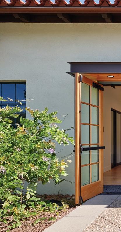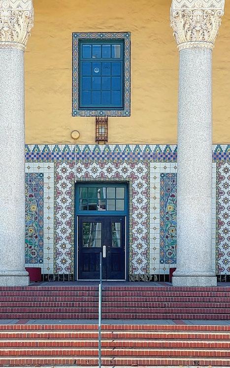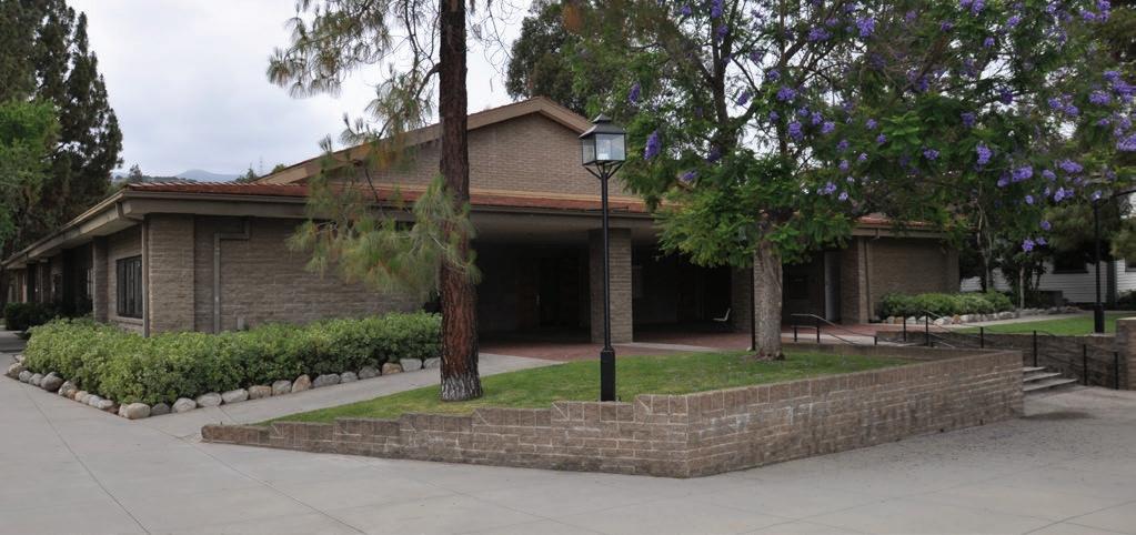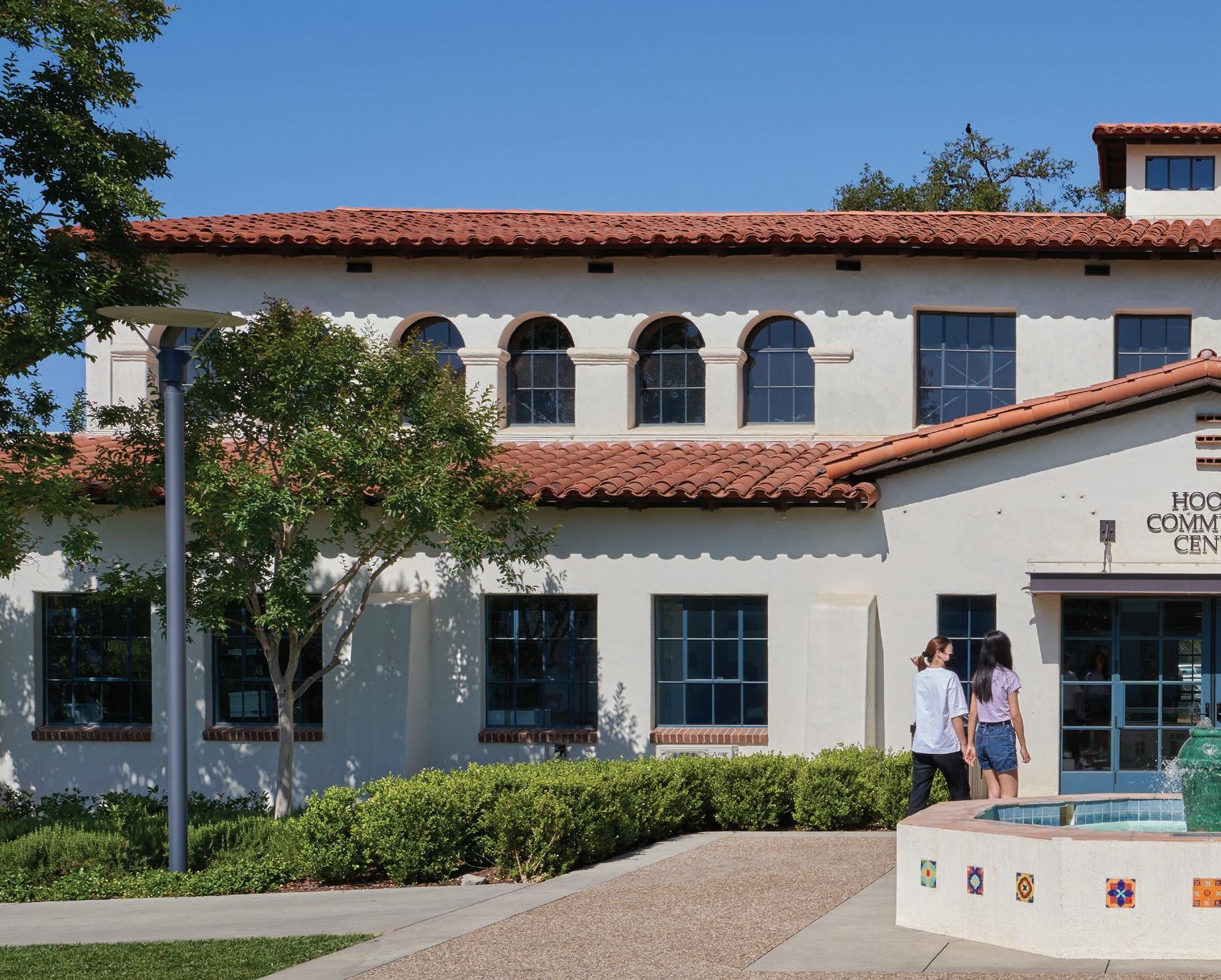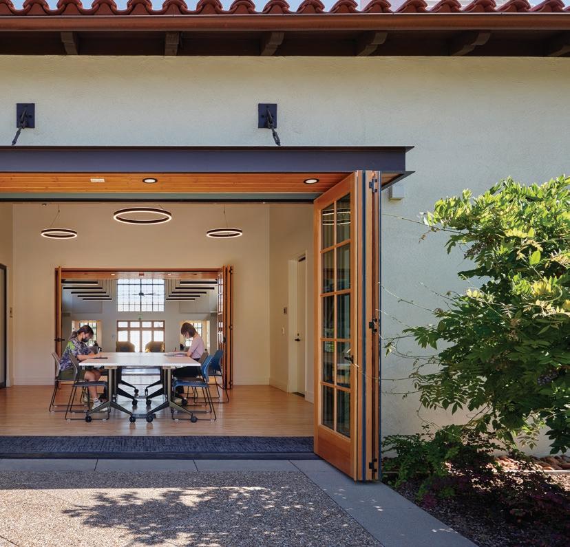 TAYLOR B. STOCKDALE COMMUNITY CENTER, 2021: The building was renovated in the 1980s, and the outdoor space to the south became a utility zone. Page & Turnbull removed the chimney, reinstituted a stair to the second floor, created a covered entrance, and installed windows. The façade helps maximize daylight and minimize heat gain.