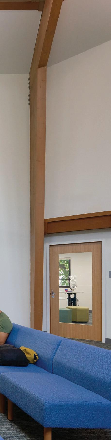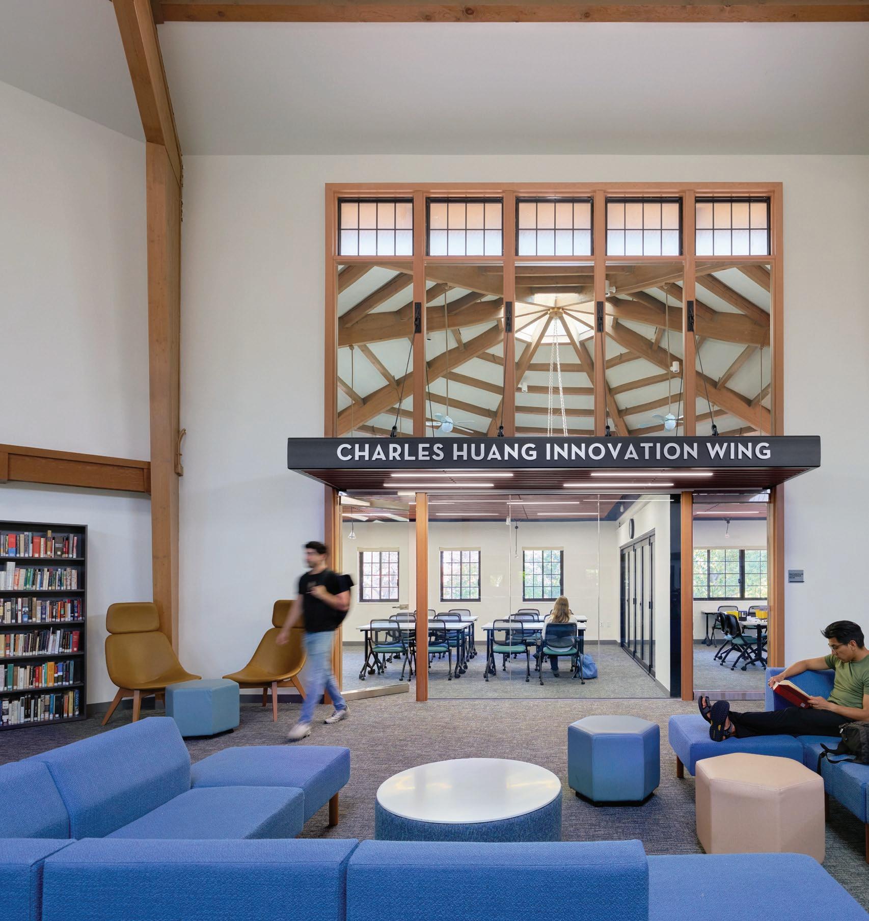 CHARLES HUANG INNOVATION WING, 2025: The Charles Huang Innovation Wing is a dynamic space to inspire and empower students in STEM, innovation, and creative problem-solving. A unique design feature was the placement of mirrors above the Huang Wingâs entry canopy. The five 3â6â x 7â6â mirrors reflect the Main Reading Roomâs beamed ceiling, make the library seem larger and increase daylight.