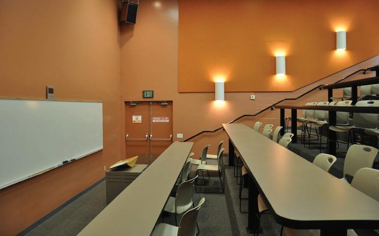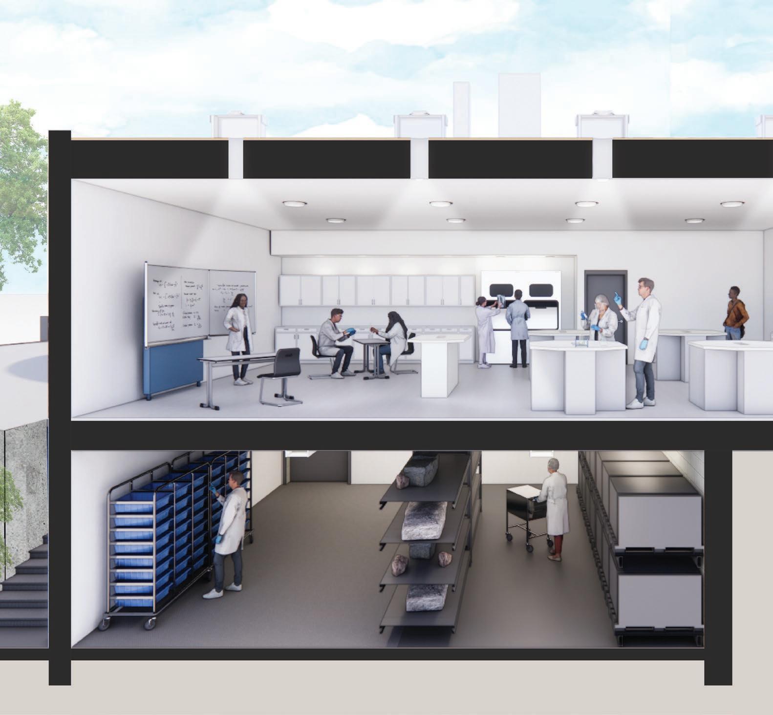 BONNIE JOHNSON HALL, 2025: The transformation from lecture hall into a 1,250 sq ft science lab and 850 sq ft storage space was accomplished in nine months. A pair of existing doors was relocated, and a 12-foot-long bank of windows was added to provide daylight and a connection with the campus. Solatube skylights were added to reduce energy consumption and materials were salvaged and reused when possible. The storage space provides 380 linear feet of large object shelf spaceâ seismically reinforced and strengthenedâto accommodate dinosaur bones and other prehistoric artifacts.