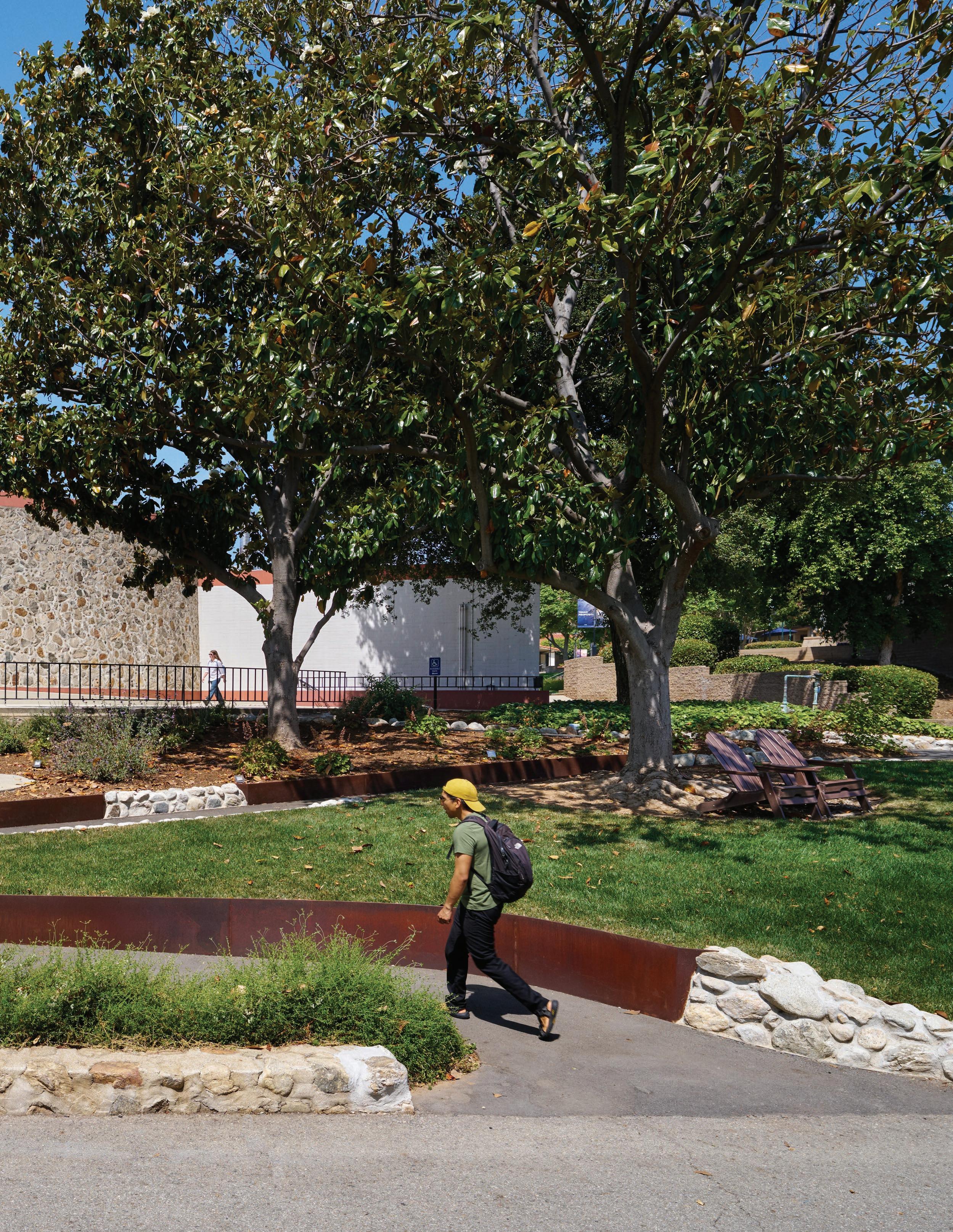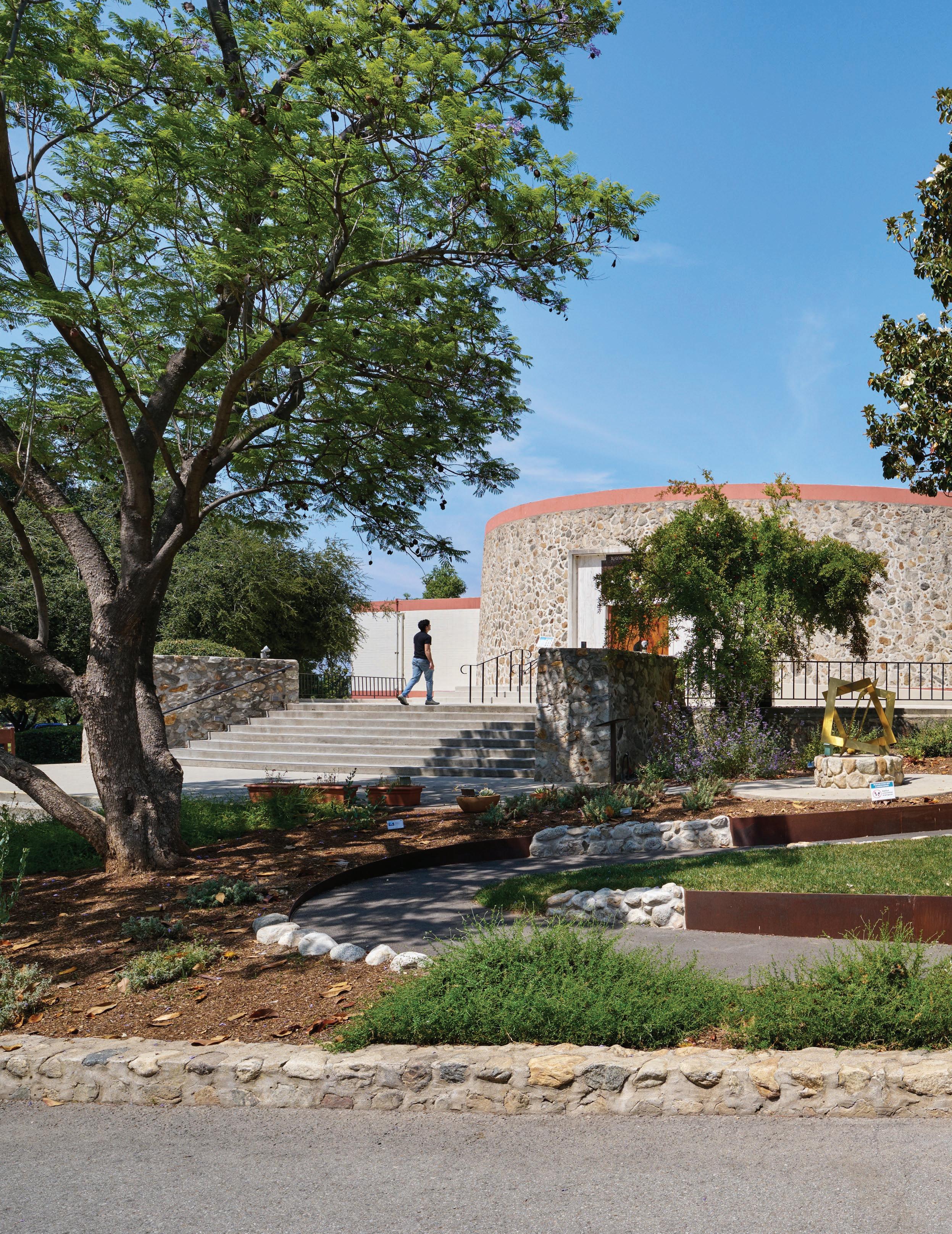 RAYMOND M. ALF MUSEUM OF PALEONTOLOGY, 2024: Landscape improvements at the Alf Museum included the design of an accessibility ramp integrated into an existing sloped landscape. The switch-back path is defined by a stone and Corten steel wall that draws from Webbsâ existing materials palette.