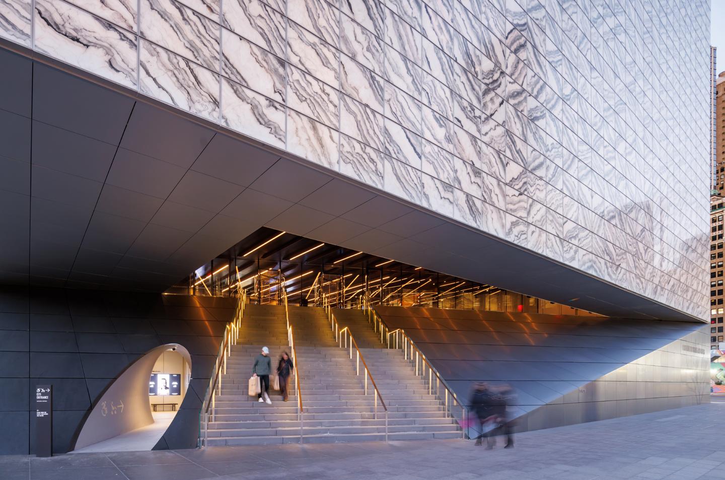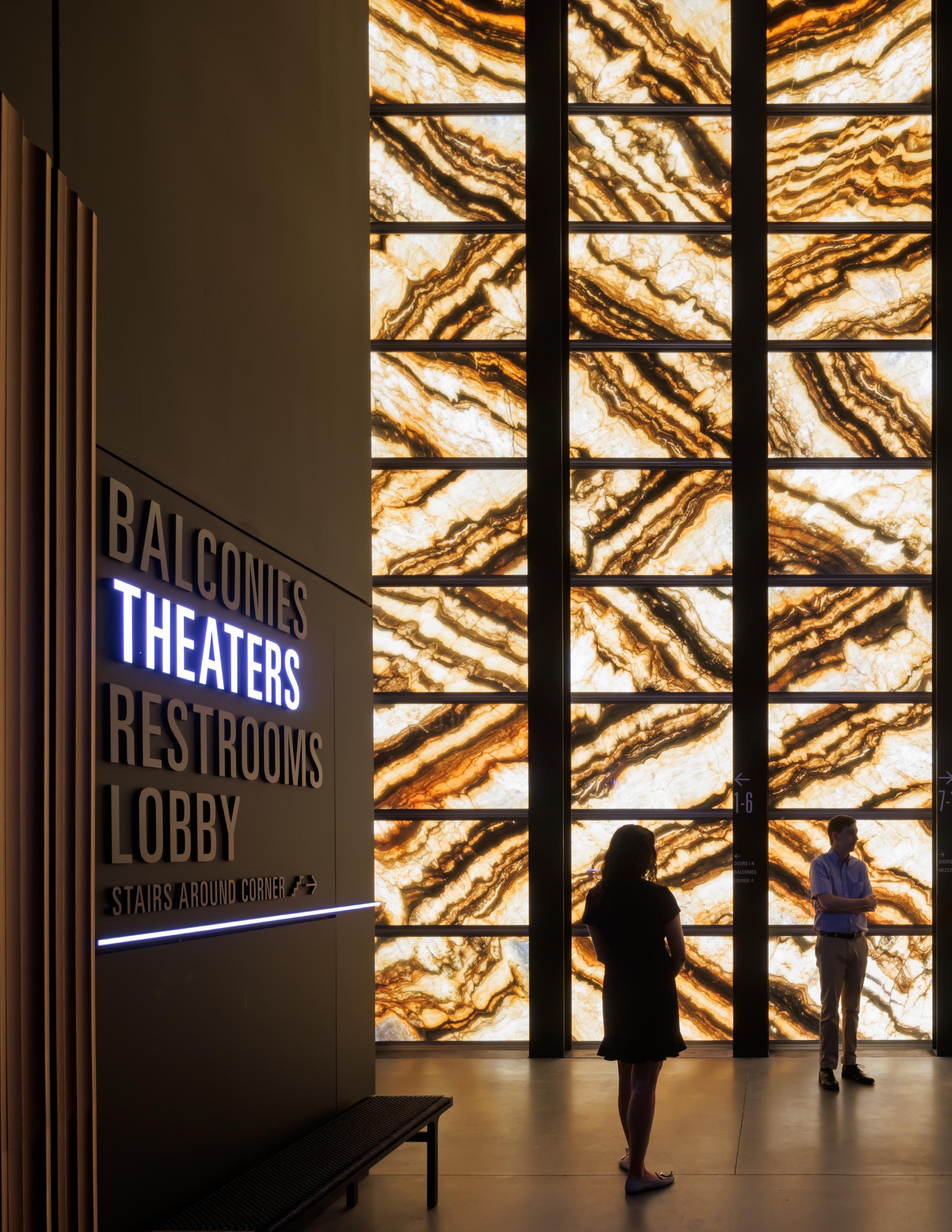 The stone layers of marble encased in glass and painstakingly bookmatched across all four facades create a performance all its own. A spectacular dance of light provides a dynamic backdrop to the public lobby, café, and terrace before heading to the venues inside.