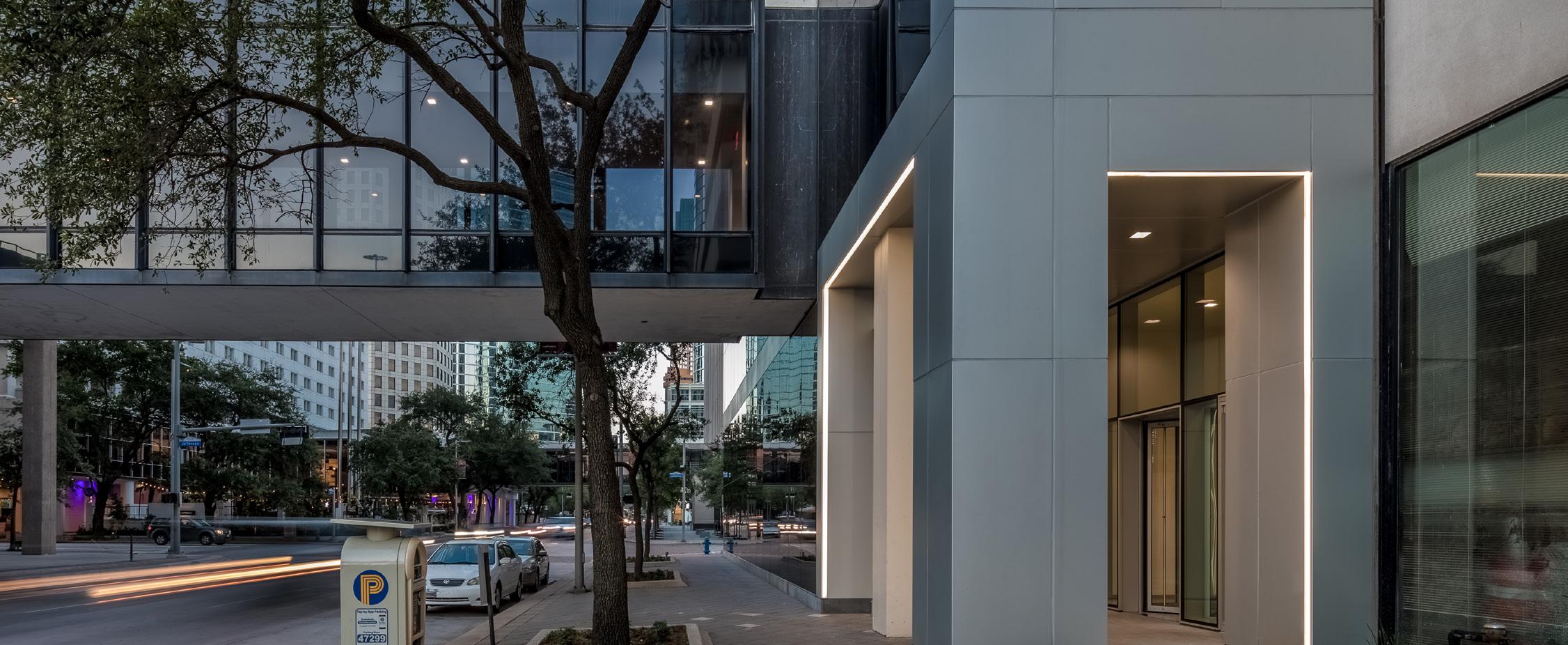 Unoccupied lease space on the two lowest floors provided an opportunity to create an amenity base for future tenants. To support this new function, Page designed a new two-story glass envelope that updated the architectural façade at street level. A new entrance was added at Smith Street that elevates the beginning of the user experience and also allows the owner to use the more prestigious business address of 1801 Smith. Edge lighting was added to both portals on the Jefferson and Smith Street entries to create a warm glow at dusk.