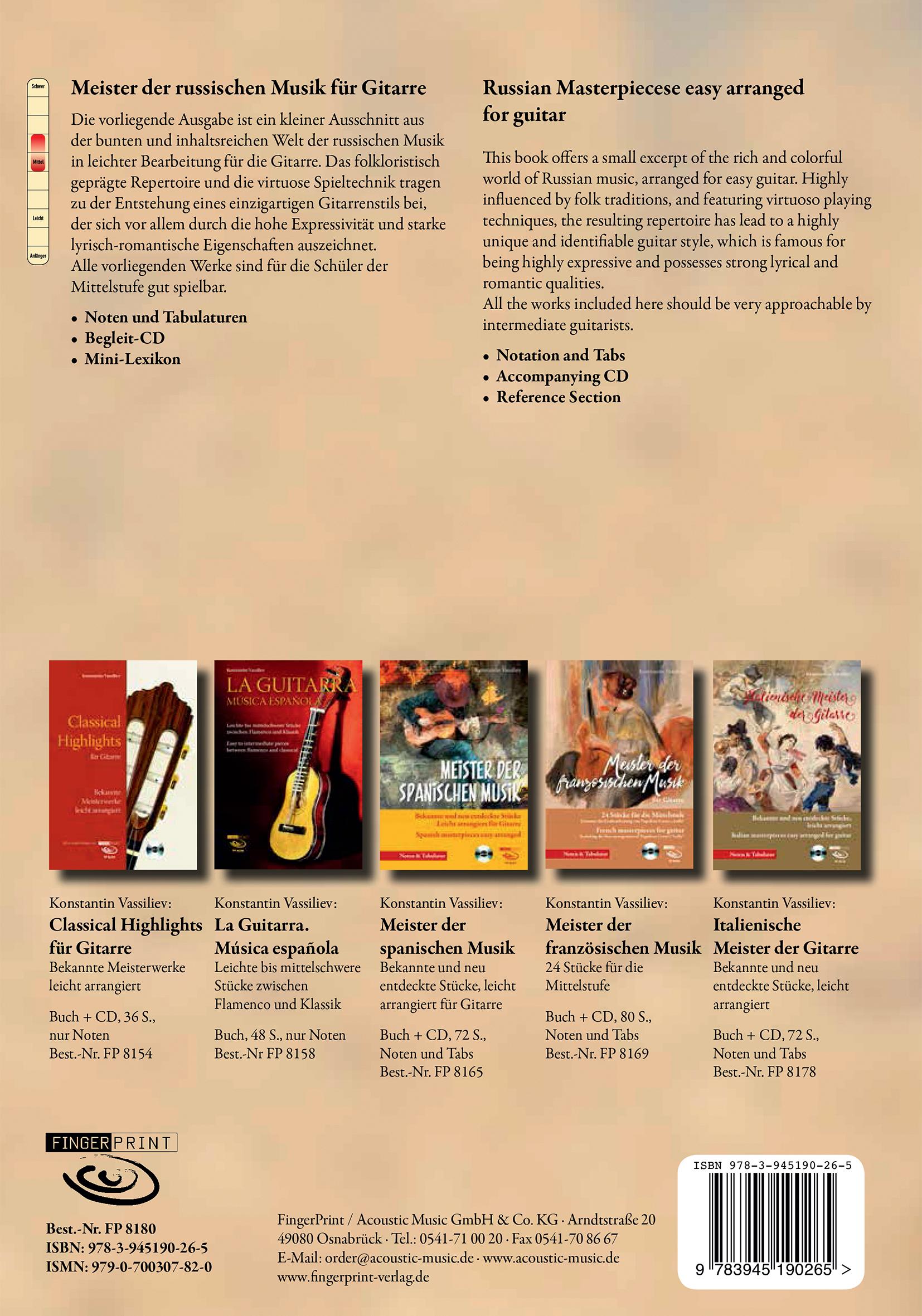 Die vorliegende Ausgabe ist ein kleiner Ausschnitt aus der bunten und inhaltsreichen Welt der russischen Musik in leichter Bearbeitung für die Gitarre. Der russische Stil zeichnet sich vor allem durch die hohe Expressivität und starke lyrisch-romantische Eigenschafen aus.
