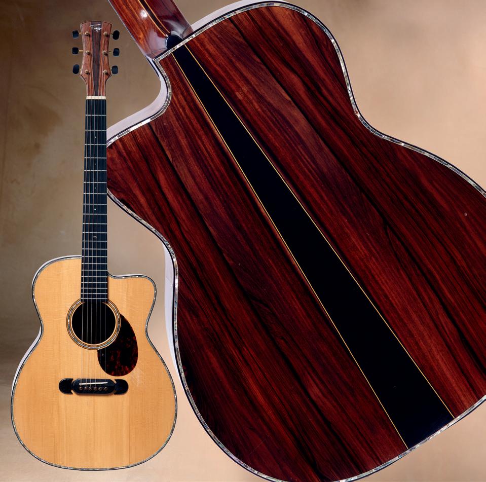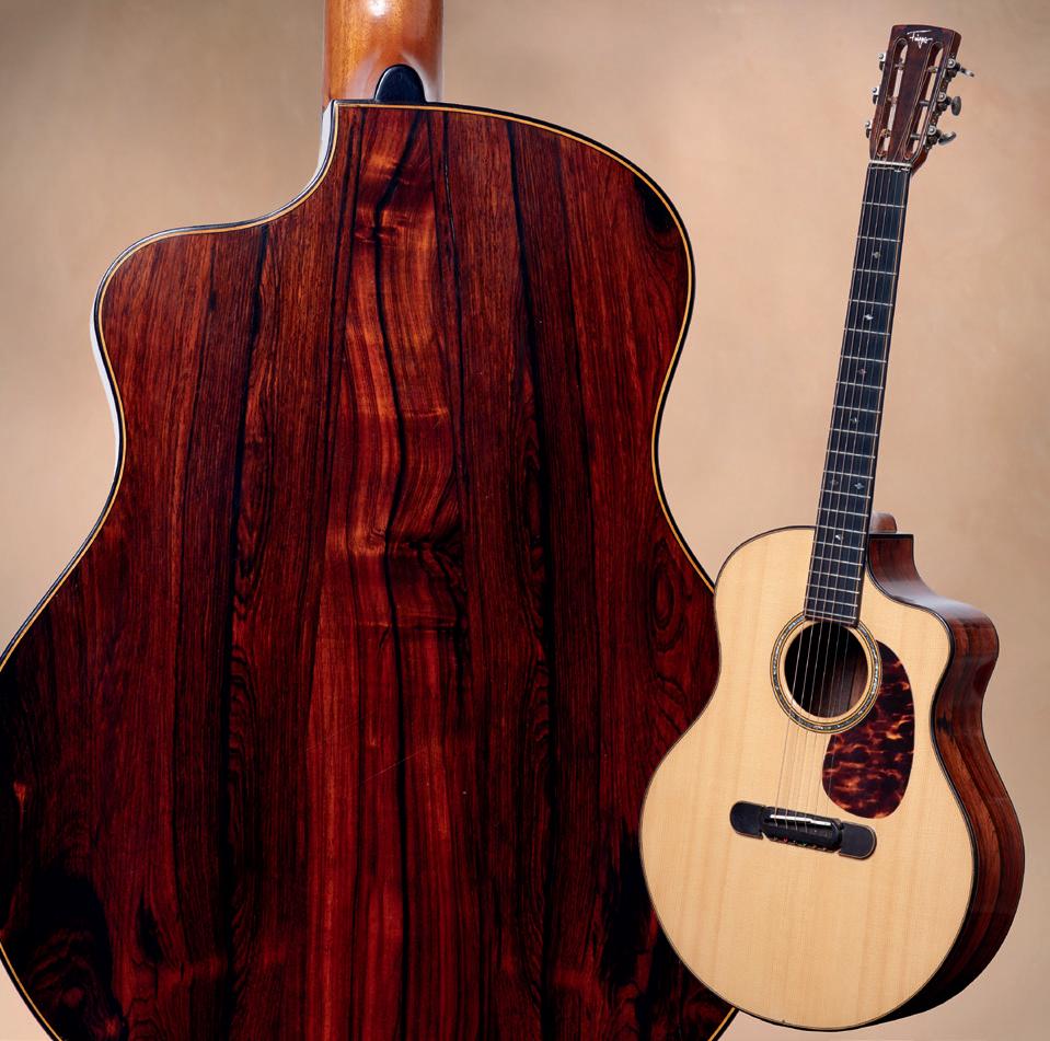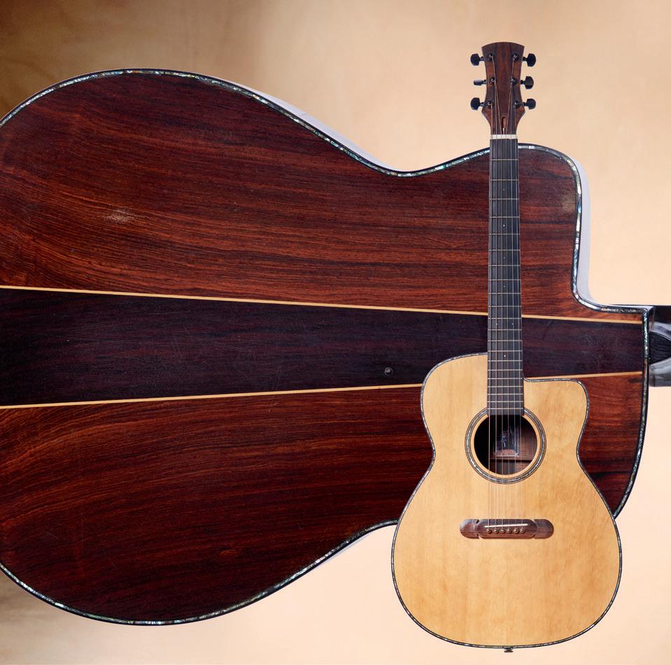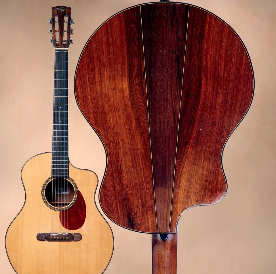 This is a slightly jazzy ballad that emerged in early 2014 while I was in Siberia, playing with the Krasnoyarsk Symphony. Playing a tune like this in my hotel room was a way of relaxing between stressful orchestra rehearsals. This instrument’s top bracing is inspired by classical guitars, and I used some crazy Brazilian rosewood for the three-piece back.
