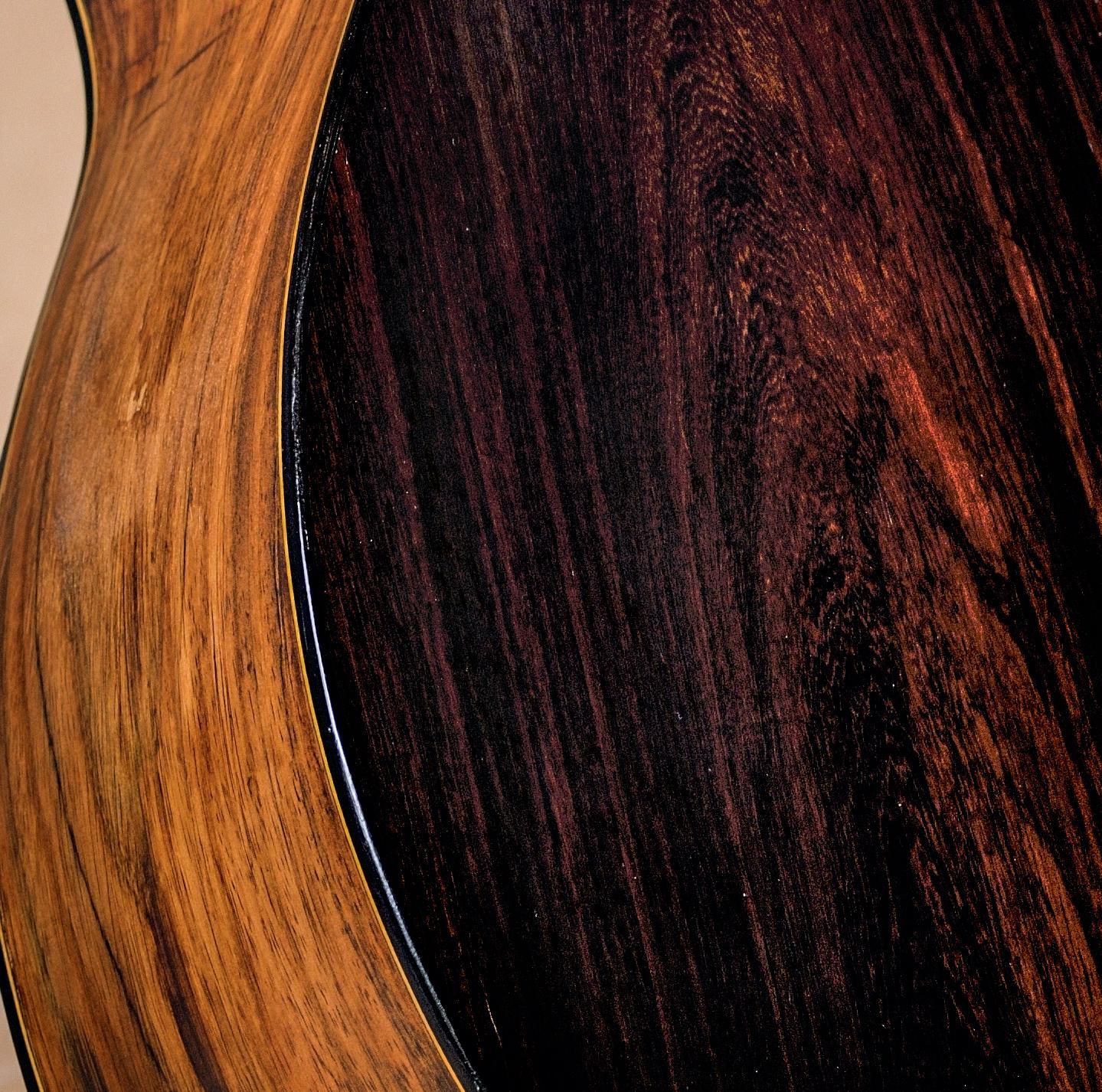 Die Beleistung der Decke ist bei dieser Gitarre von klassischen Gitarrenbauern inspiriert. Der Boden ist dreiteilig aus recht wildem Rio gebaut.