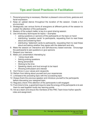 Tips and Good Practices in Facilitation 1. Personal grooming is necessary. Maintain a pleasant voice and tone, gestures and facial expression. 2. Keep an upbeat stance throughout the duration of the session. Create a fun environment. 3. Strategically use various forms of energizers at different points of the session to sustain the attention of the participants 4. Mastery of the subject matter is key to a good sharing session 5. Use introductory techniques for topics – examples: • asking questions or opinions of the participants on the topic on hand • distributing “question cards” to participants, requesting them to read these aloud and answering them • distributing “statement cards to participants, requesting them to read these aloud and asking whether they agree with the statement and why 6. Make the session an interactive and self-discovery based exercise. Encourage the participants to ask questions or give opinions 7. Respect your learners. 8. Make your presentation interesting by: • Using visual aids • Asking probing questions • Being personable • Sticking to the time • Speaking clearly and loud enough to be heard • Showing enthusiasm and interest 9. Don’t force in your values and viewpoints 10. Refrain from talking about yourself and your experiences 11. Link/weave the preceding topic with the succeeding topic 12. Always thank the previous speaker and introduce yourself to the participants before discussing your assigned topic. 13. Regularly check if the attention of the participants is still engaged. 14. From time to time, a good technique to raise the energy of the participants is to ask them to read together loudly key learning points. 15. Act as a team and ensure the members of the PMC Team know his/her specific roles and assignment.