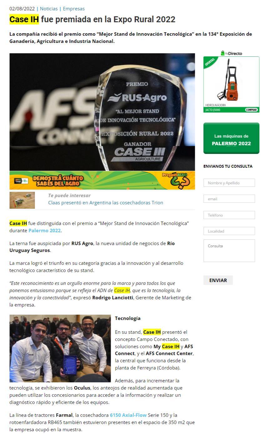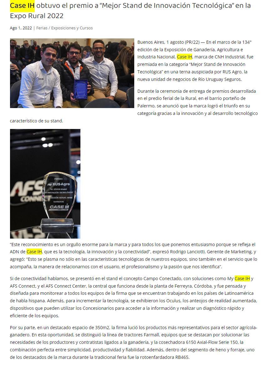 Case IH obtuvo el premio a “Mejor Stand de Innovación Tecnológica” en la Expo Rural 2022