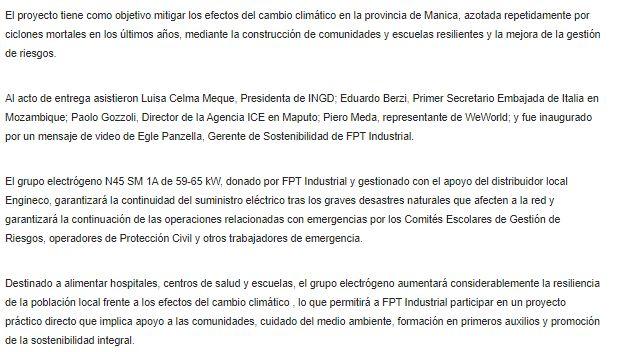 FPT Industrial continúa apoyando a las comunidades locales con la entrega de un generador muy necesario en Mozambique