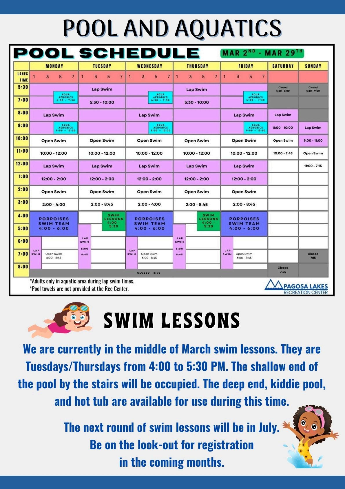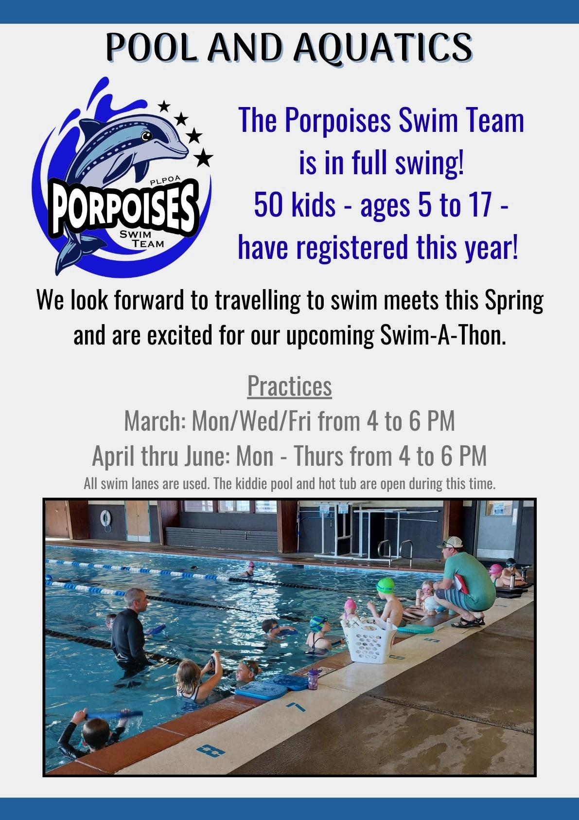 Swim lessons remain in high demand, with March sessions already fully booked in both beginner and intermediate levels. The Porpoises Swim Team also had a successful month, with 63 young swimmers participating in February practices. The team is actively fundraising and has already raised over $2,000, with additional events planned.