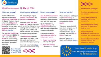 With less than 32 weeks to go and time flying by, it’s really important everyone engages with Alex Health and understands what it will mean for your area. If you would like us to come and talk to your team about Alex Health and how it will impact your work, please get in touch >