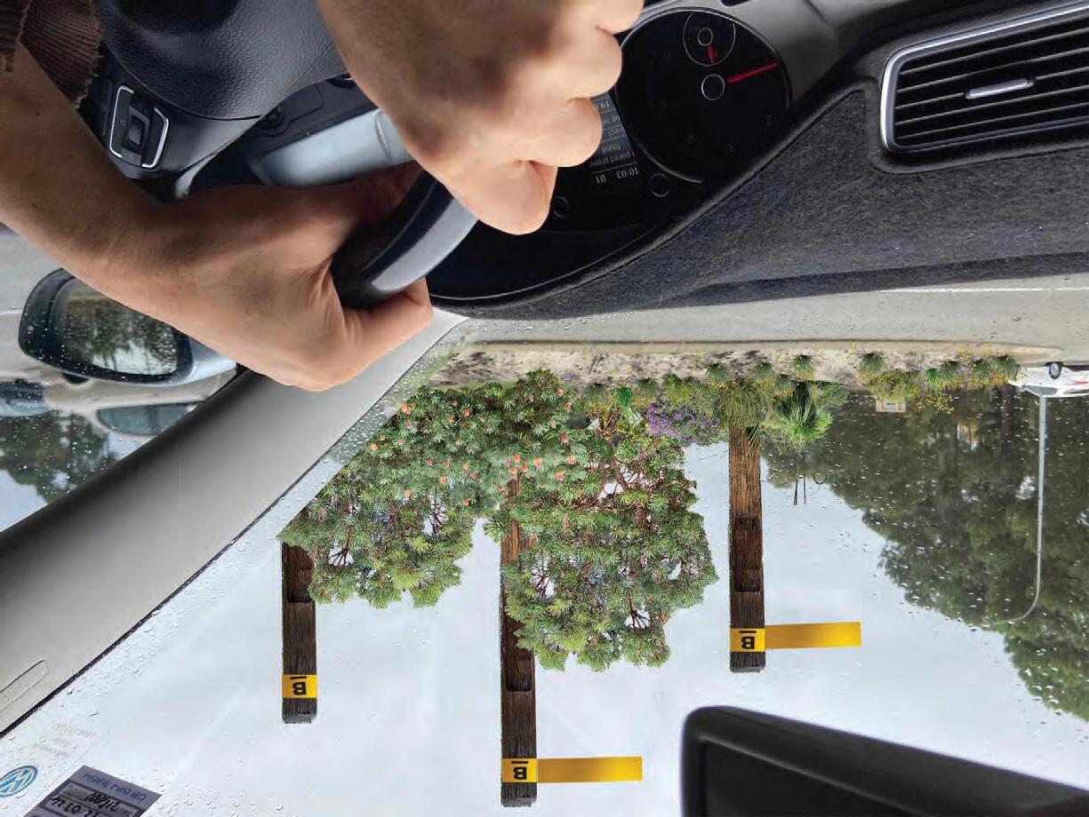 Perspective 1: Kent St / Hayman Rd. roundabout. Bee’s perspective with false bee view colour of Hardenbergia comptoniana and Jacksonia sericea