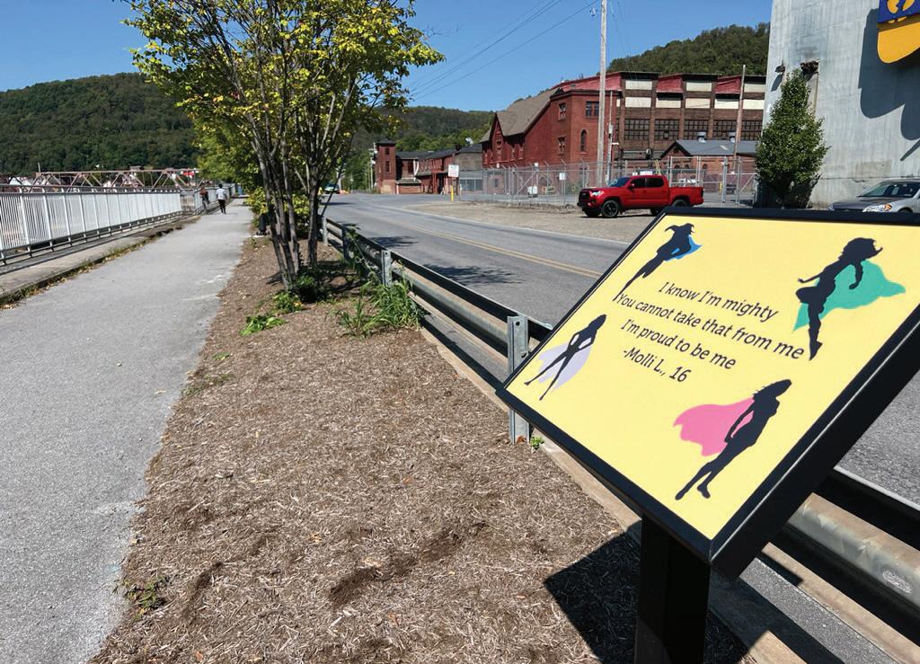The creative team at Bottle Works, headed by executive director Matt Lamb, and MADE Johnstown installed the poems at the Bottle Works, the library, and the library’s StoryWalk along the Johnstown Greenways Trail using a combination of signs, storyboards, and stencils on the sidewalk. The stencils were sprayed with a special “invisible” solution that only shows when wet, making it Rain Poetry. All it takes is some water to make the poems appear underfoot like magic!