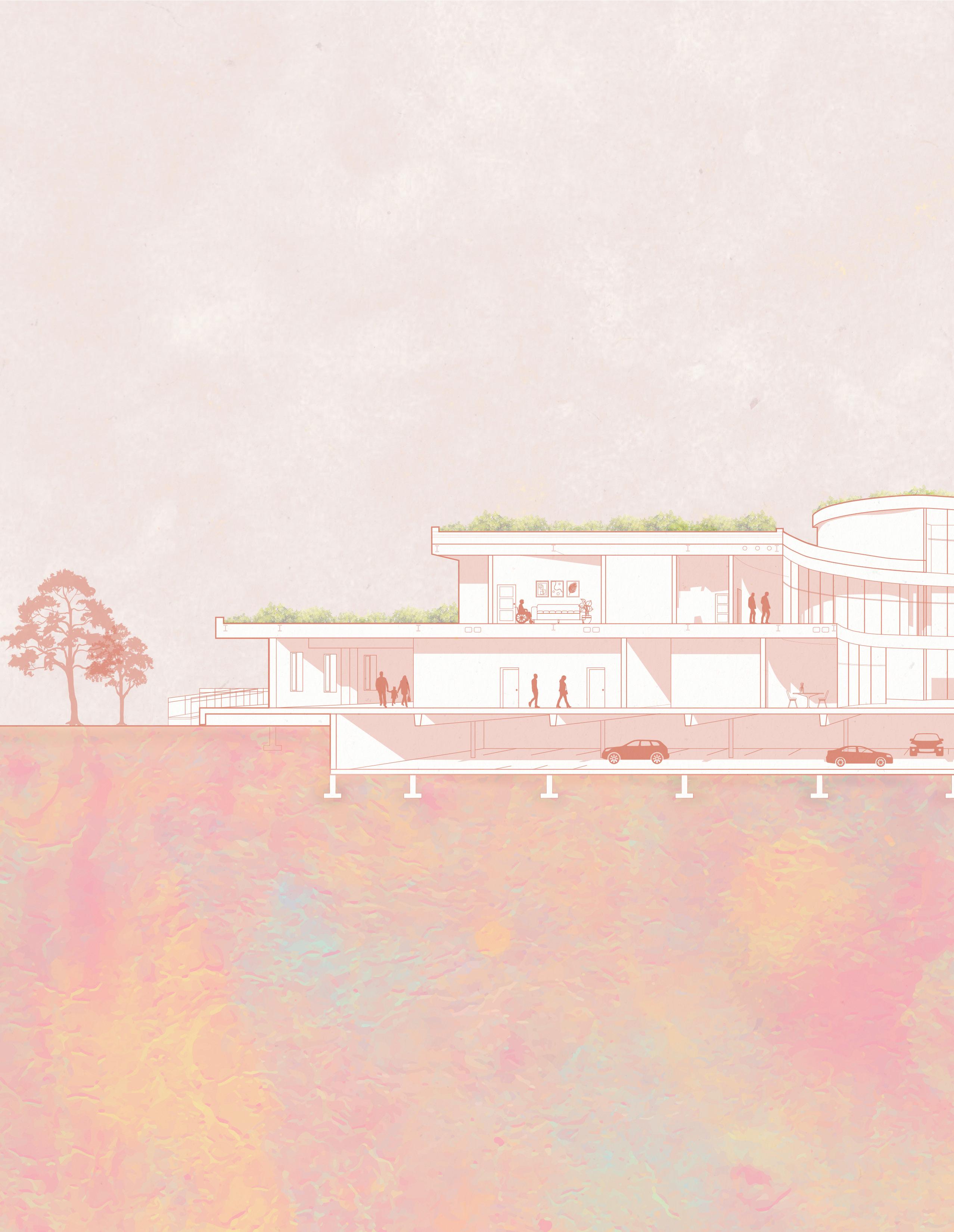 The emphasis of this project was to create an environmental education center as well as a natural arts center so I wanted to inculde different features that would highlight the importance of the nearby landscape and restore it back to it’s original state. This included rainwater collection that could be diverted to the natural landscape as well as accounting for the sun path. The butterfly roof has an overhang to allow shade from the summer sun and is mainly opened up to the northern side. The atrium allows for air to flow freely from the first to the second floor, cooling the spaces in the hotter months.