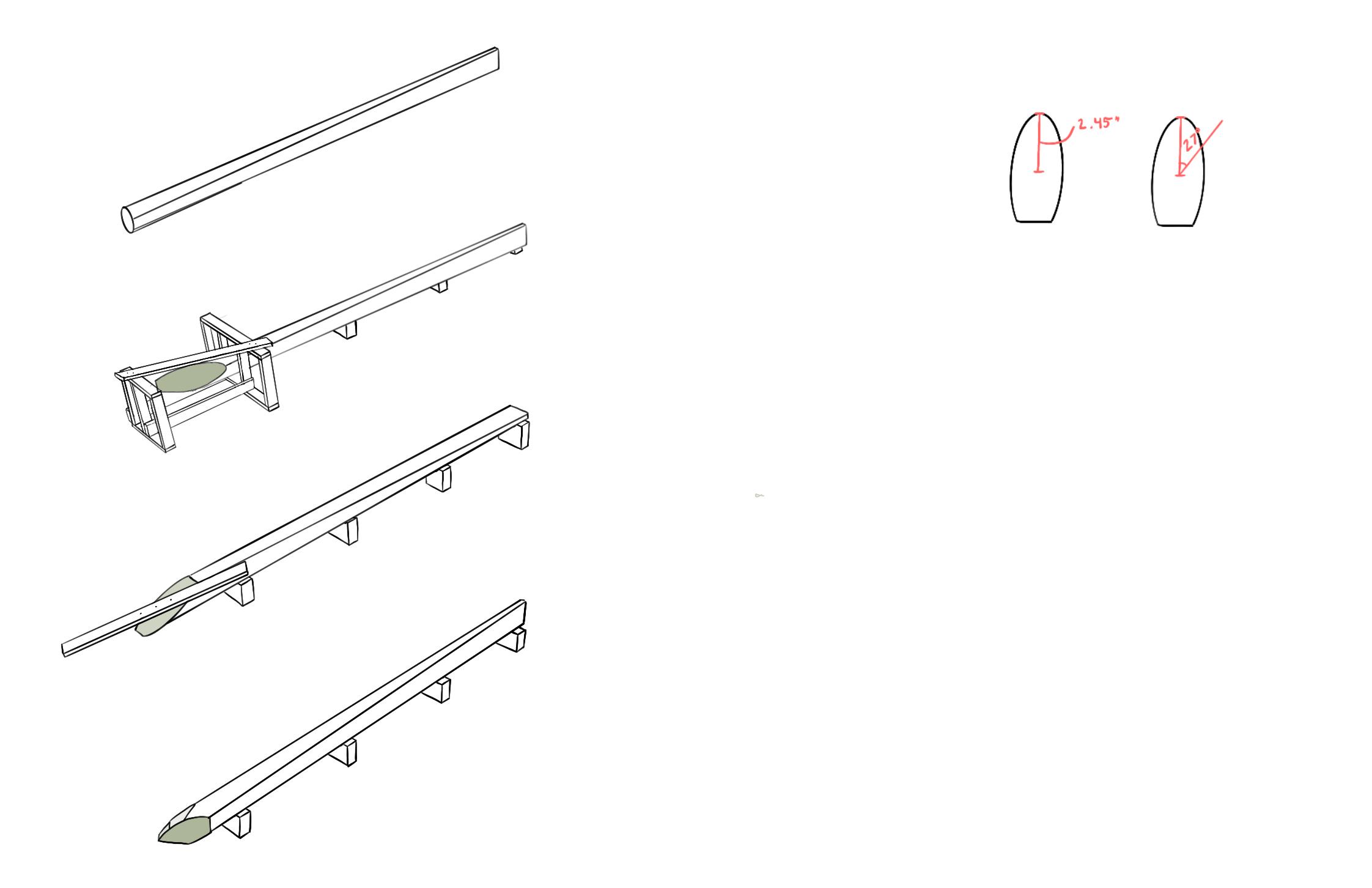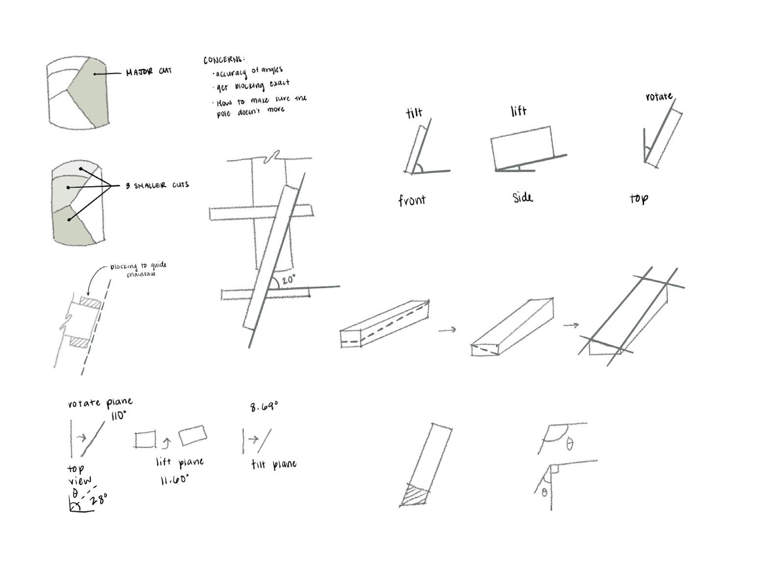 My responsibilites consisted of assisting with construction documents, laying out the site using batter boards, and cutting the utility poles. I was tasked with coming up with a jig in order to cut each pole accurately. I started sketching the angles I knew we needed from the model and figuring out each cut one by one.