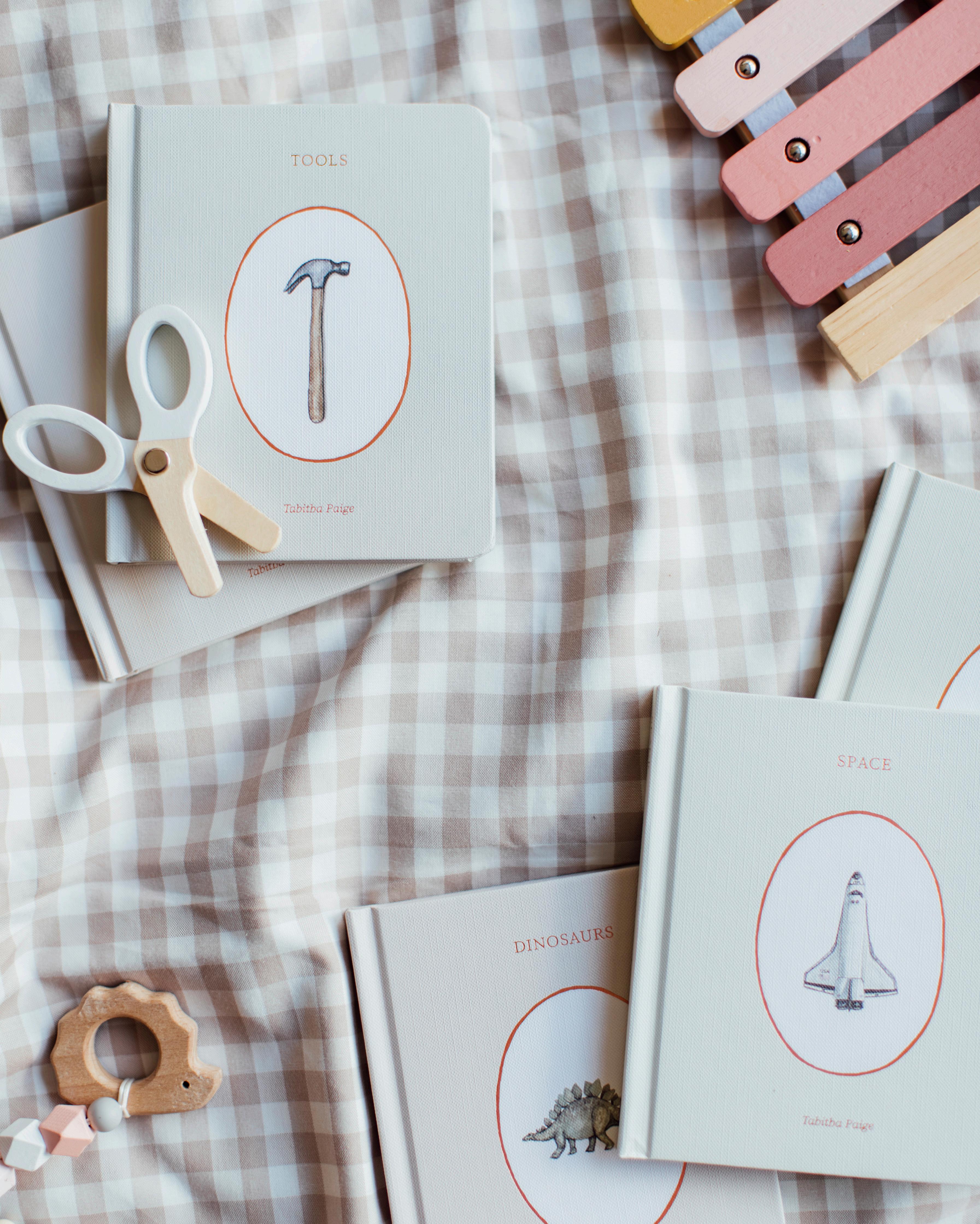 Five board books feature foundational words in categories such as sports, space, dinosaurs, tools, and bugs. The back of each book also includes a “seek and find” activity to help parents encourage their little ones to learn to identify the pictures on the page.