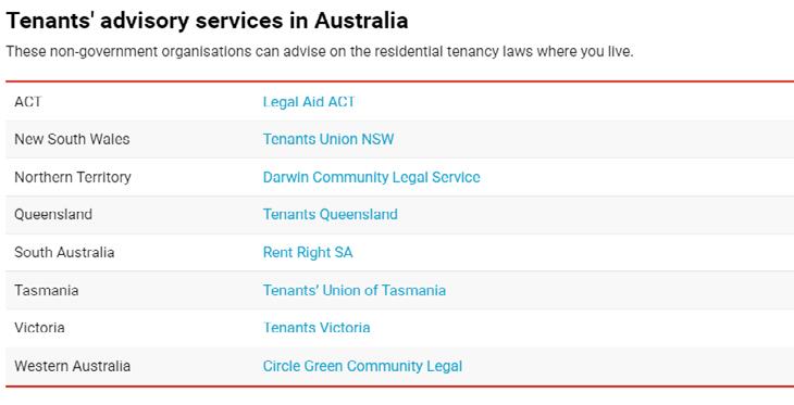 3) Seek advice from your local tenants’ advisory ser vice or relevant government tribunal or agency if you are in doubt. The organisations in the following table are a good place to start.