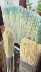 These brushes are made from the hairs on the back of a pig (hog), which are strong yet springy. The bristles have natural split-ends, which increases the amount of paint they hold. They were good for loading a lot of paint and were used for both oils and acrylics. They aged well, becoming softer and more responsive with use.