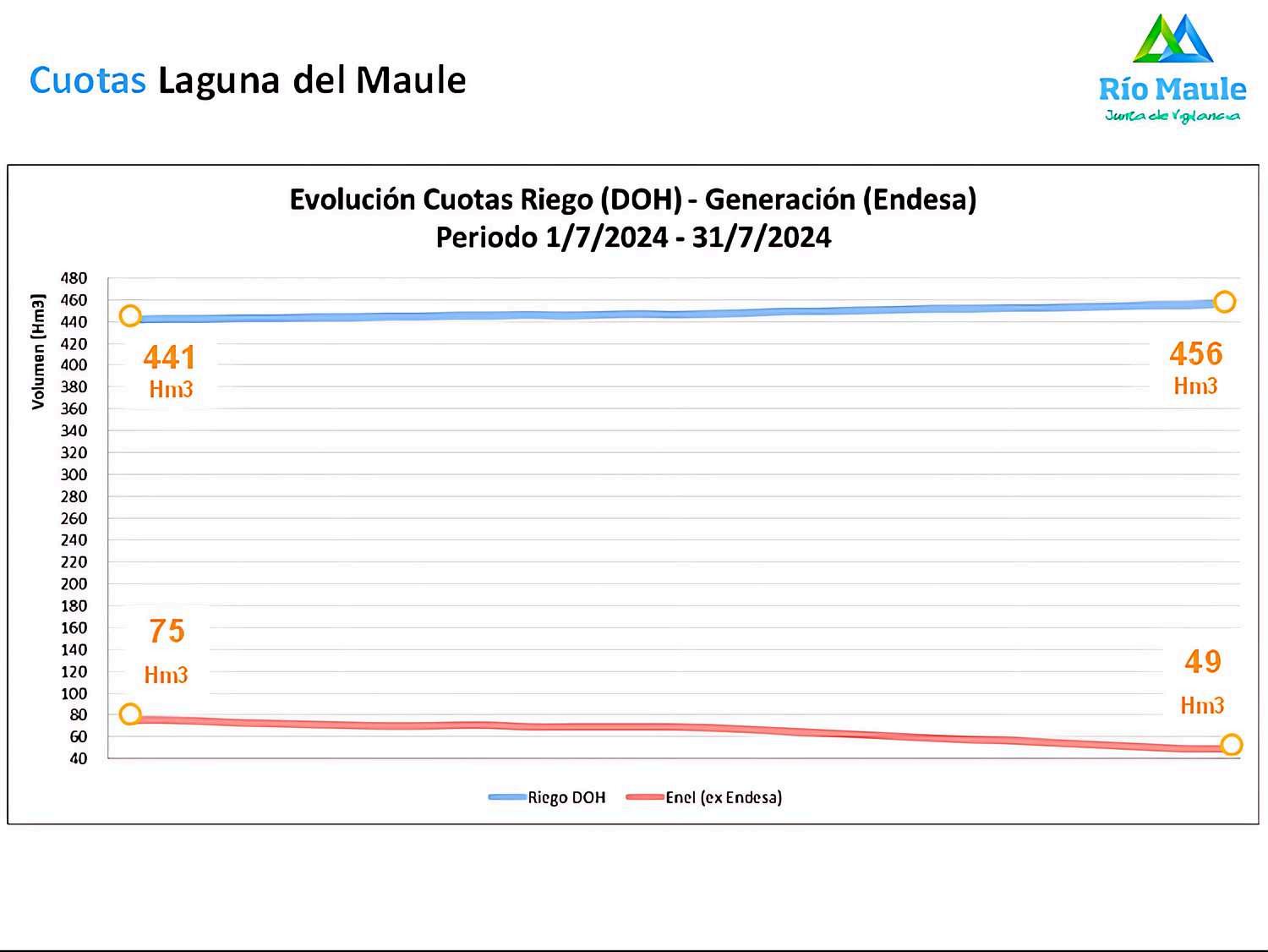 La capacidad de la Laguna del Maule es de 1 500 Hm3, por el aporte de afluente, aumentó a 675,0 Hm3 equivalente al 45.0 %