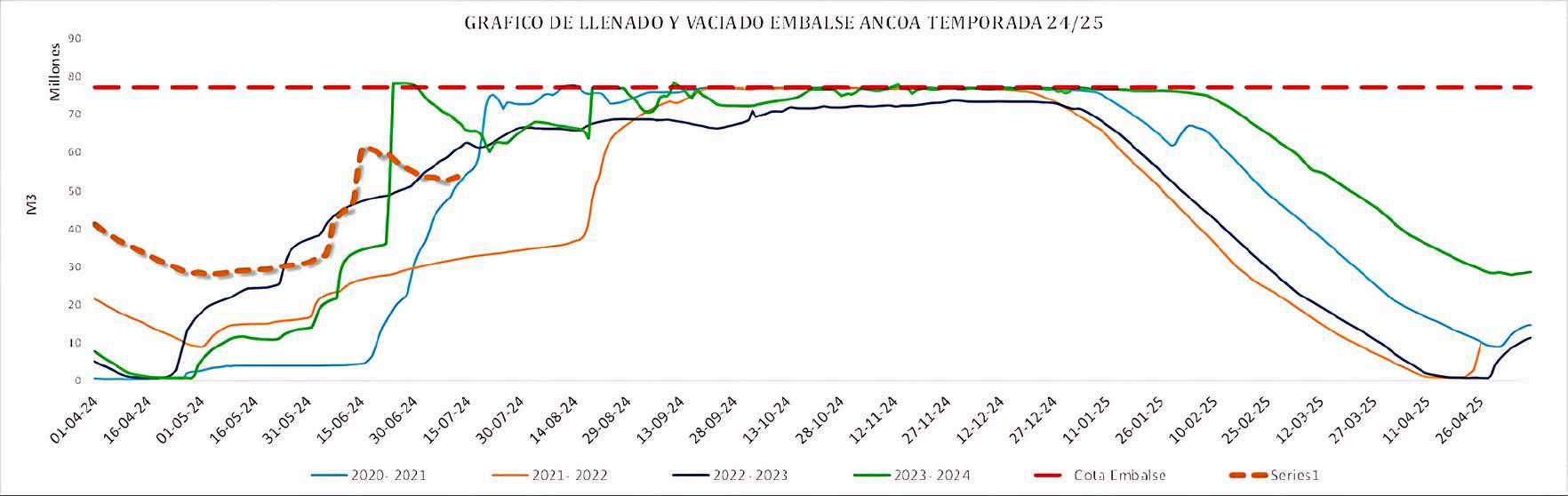 Razón que la sociedad Civil Ancoa, quien administra el embalse, accedió a entregar mayor caudal entre las 19:00 y las 23:00 horas, asumiendo que este desembalse va en desmedro del llenado, pero es un gran problema social para nuestra comunidad.