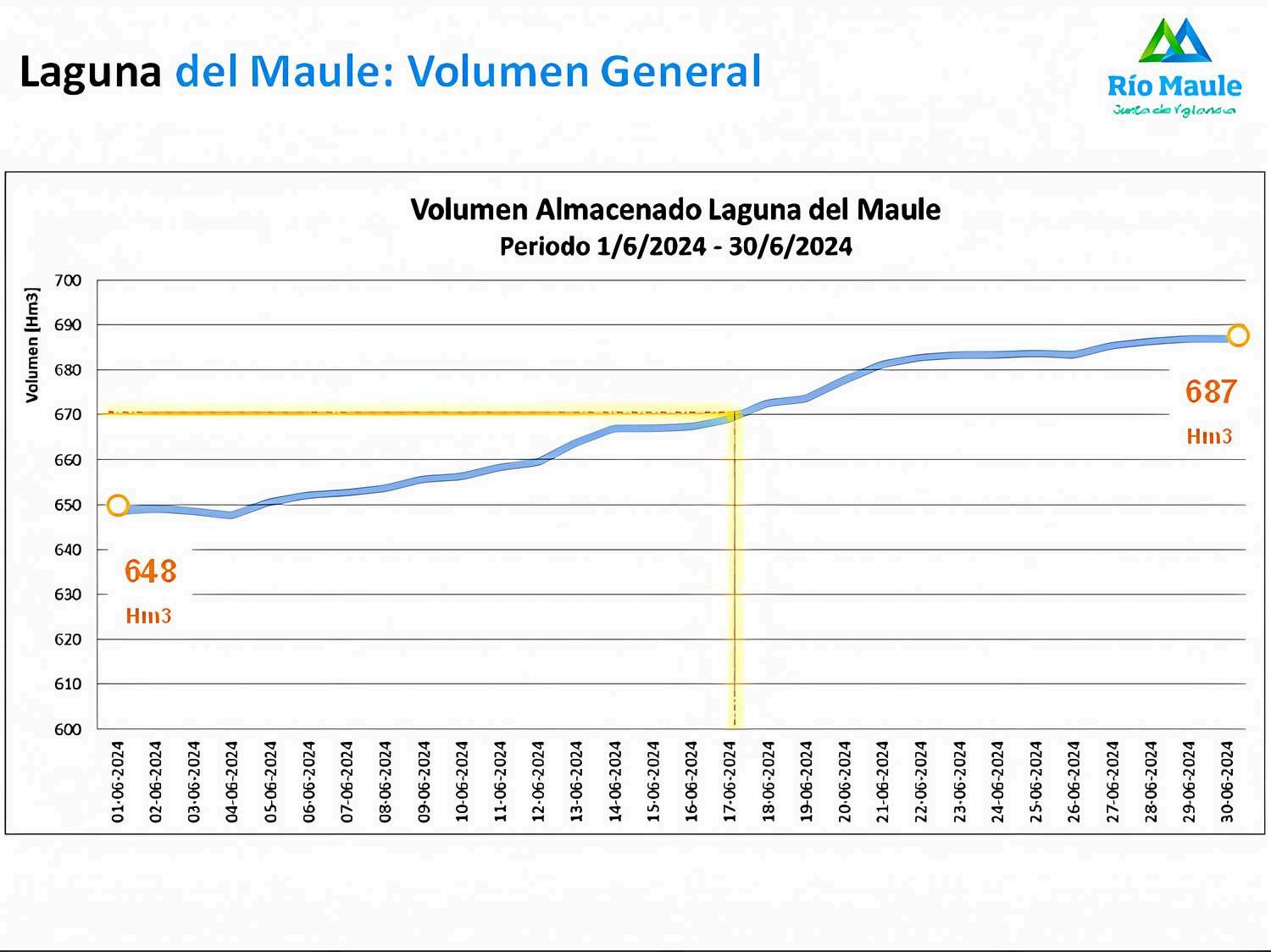La capacidad de la Laguna del Maule es de 1.500 Hm3, por el aporte de afluente, aumentó a 687,0 Hm3 equivalente al 45 8 %