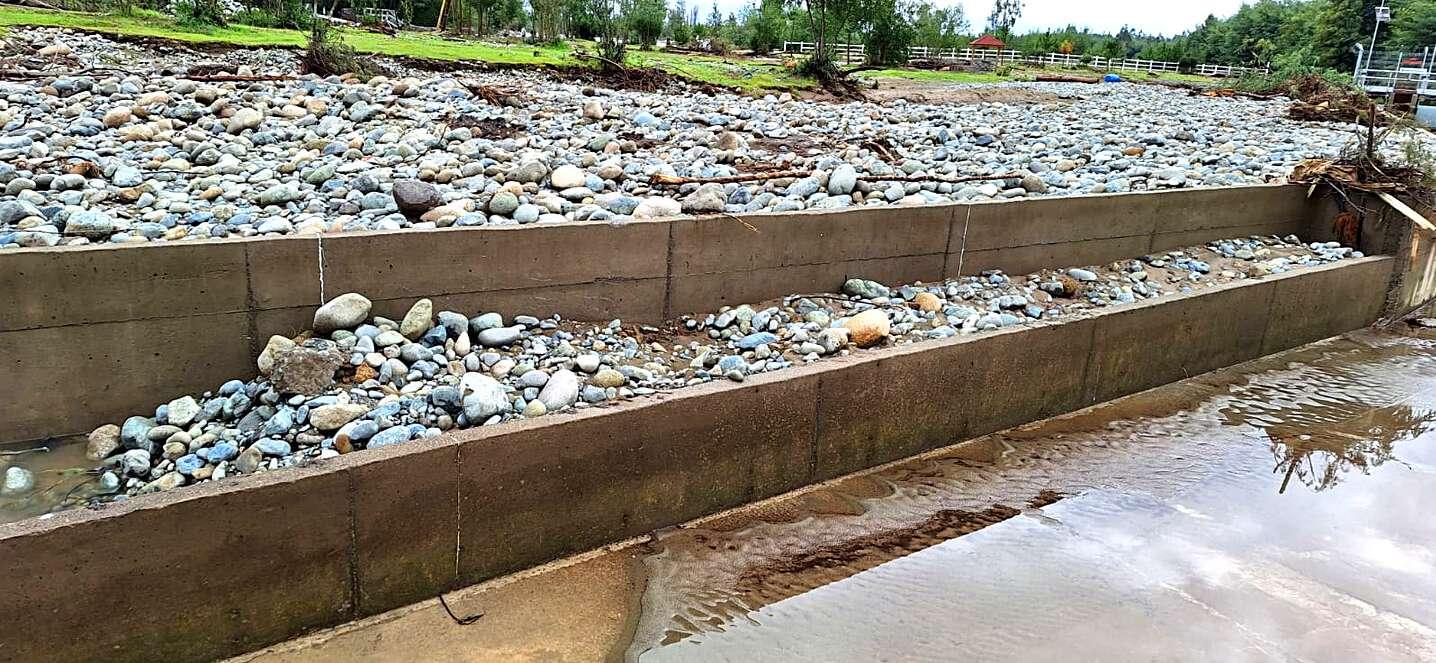 Además, el cambio del cauce del río, provocó la pérdida y destrucción del campamento, que incluye la casa de celador, casa de los operadores y bodega, junto con una superficie de 16 hectáreas de terreno con plantación de nogales y árboles nativos