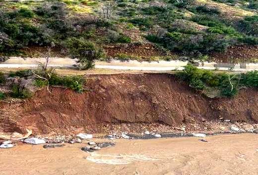Resultó muy dañado entre los kilómetros 0,4 y 3,2; daños de consideración, sobre todo en los pasos de las quebradas y el camino borde en un tramo de 1 4 kilómetros